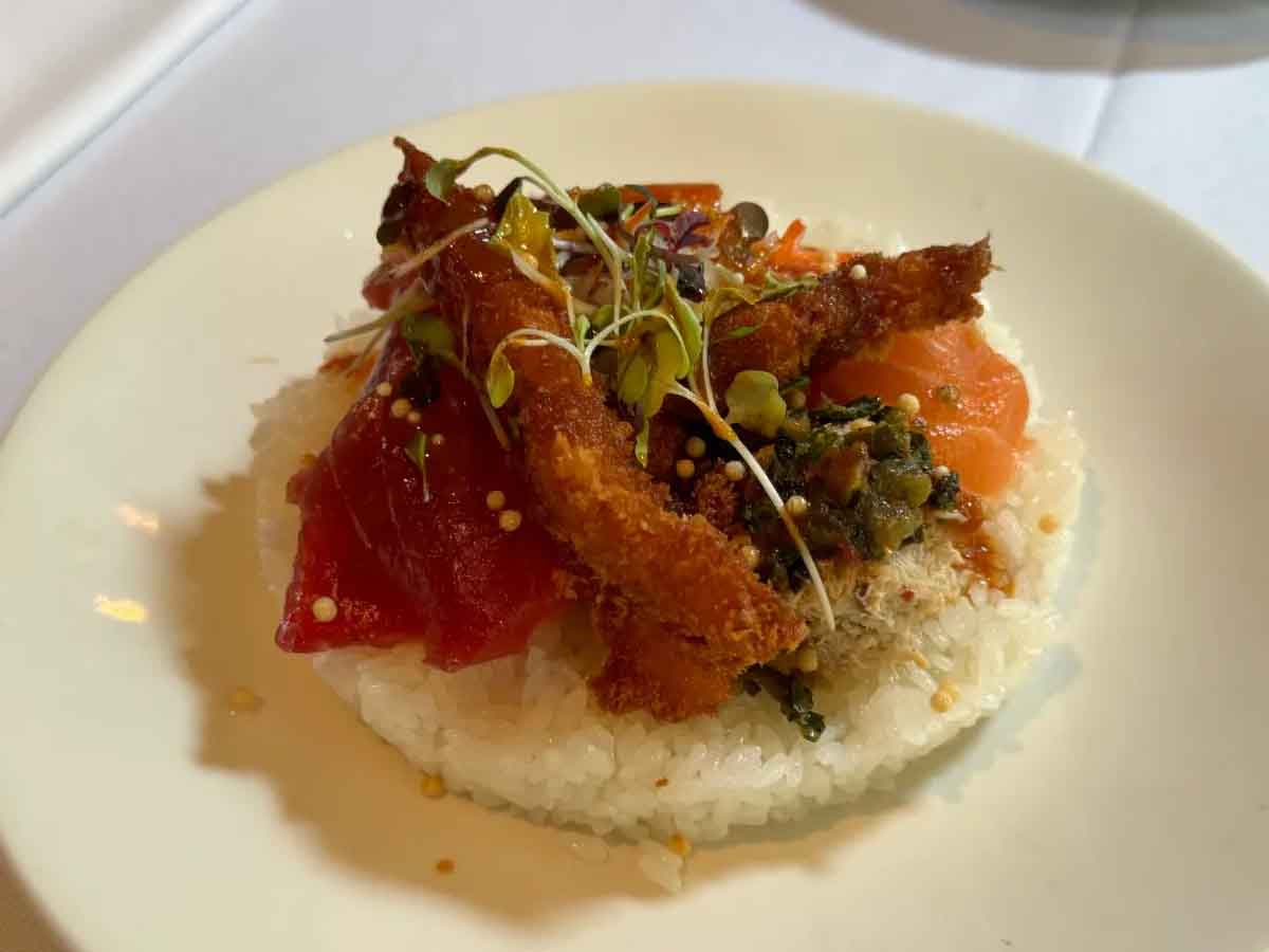 By Chirashi: Maguro, kanpachi, shake, blue crab mix, crispy shrimp, cilantro XO and garlic soy.