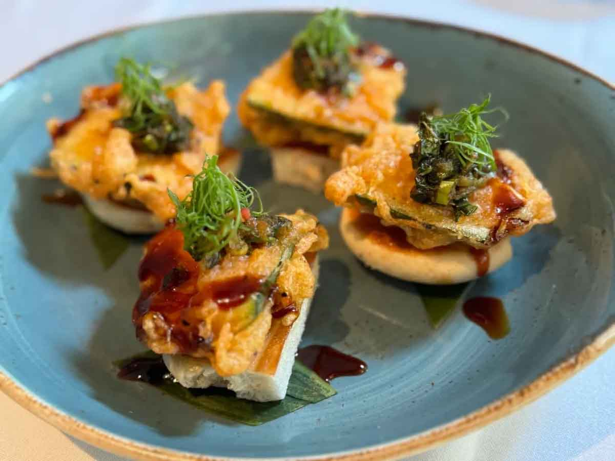 Crispy zucchini: Crown noodle crispy bao and cilantro XO relish.