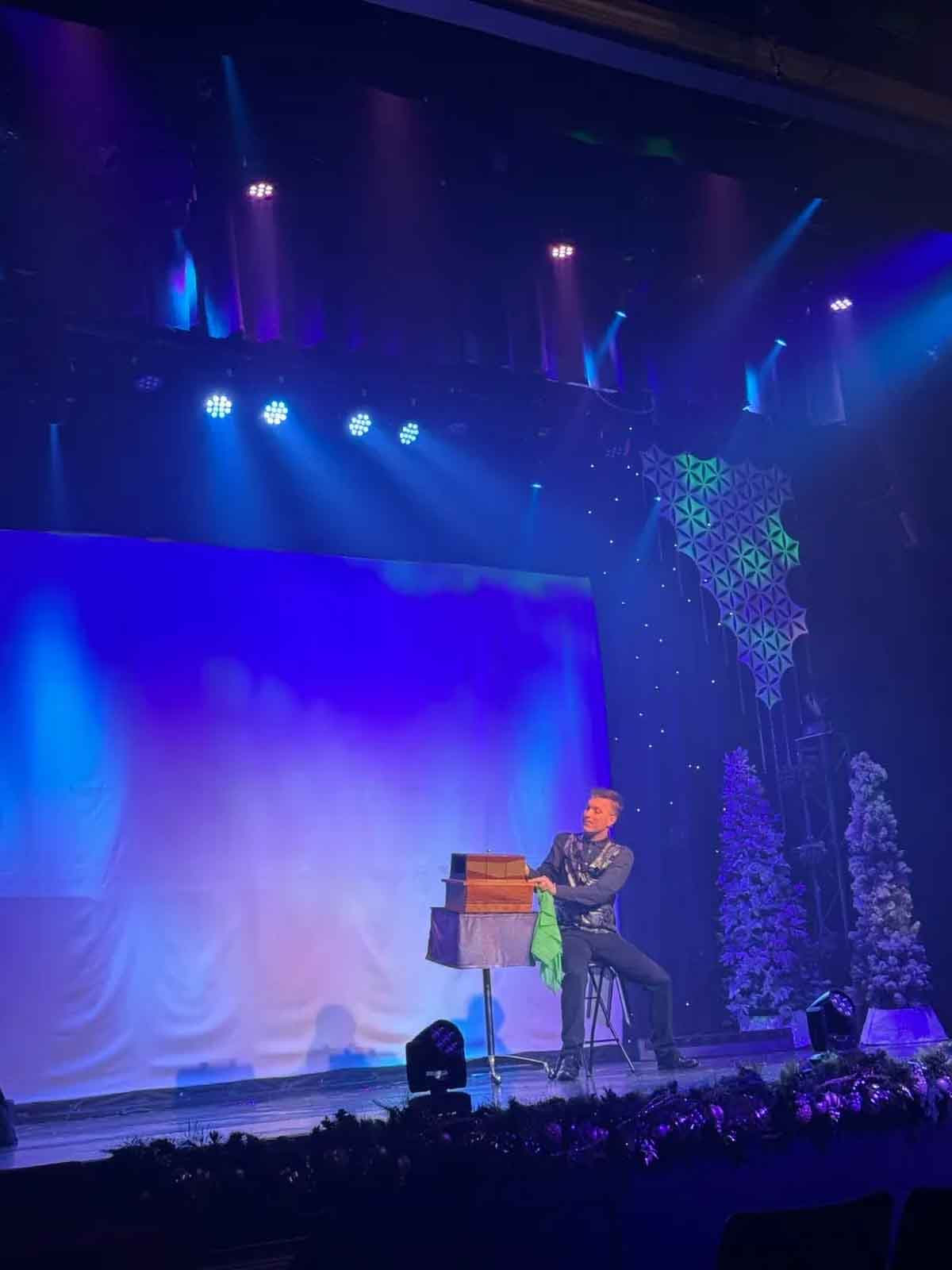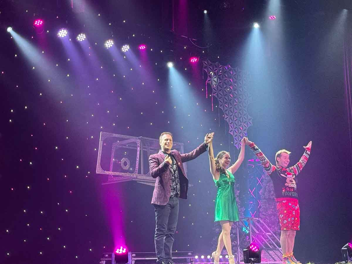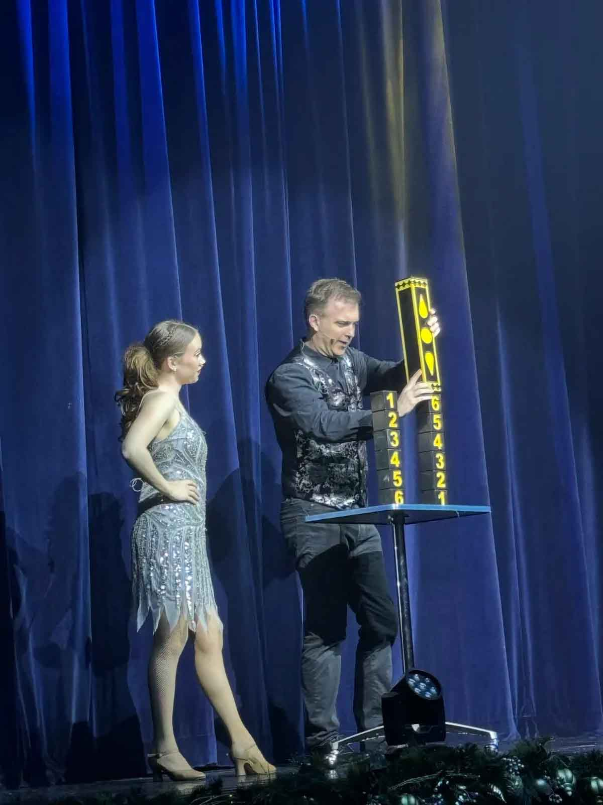 Hudy and Terry take the stage together numerous times throughout the show, showcasing their great chemistry as respective magician and assistant as they present two stacks of blocks that magically appear in predicted order after being briefly covered by sheaths, as well as a mind boggling bit with wine bottles and assorted glasses miraculously switching places with one another, in real time.