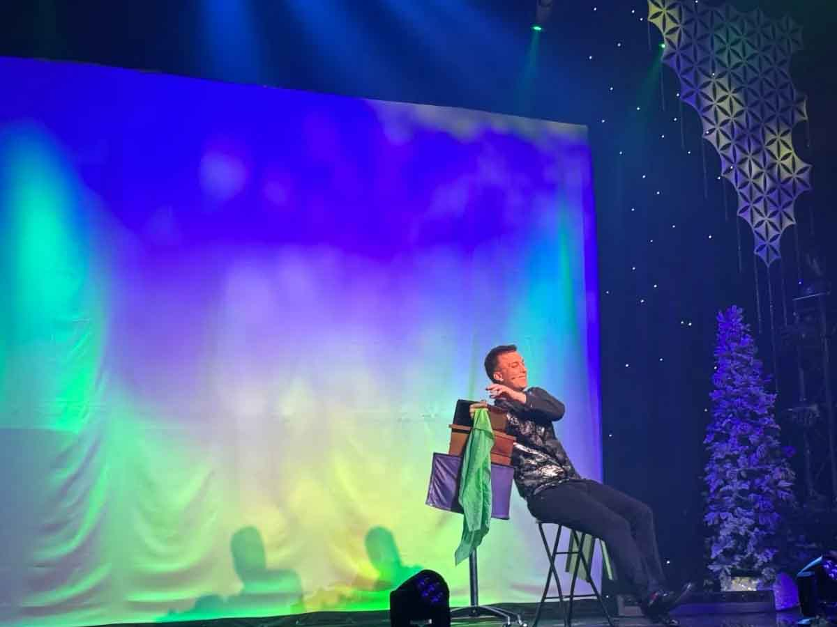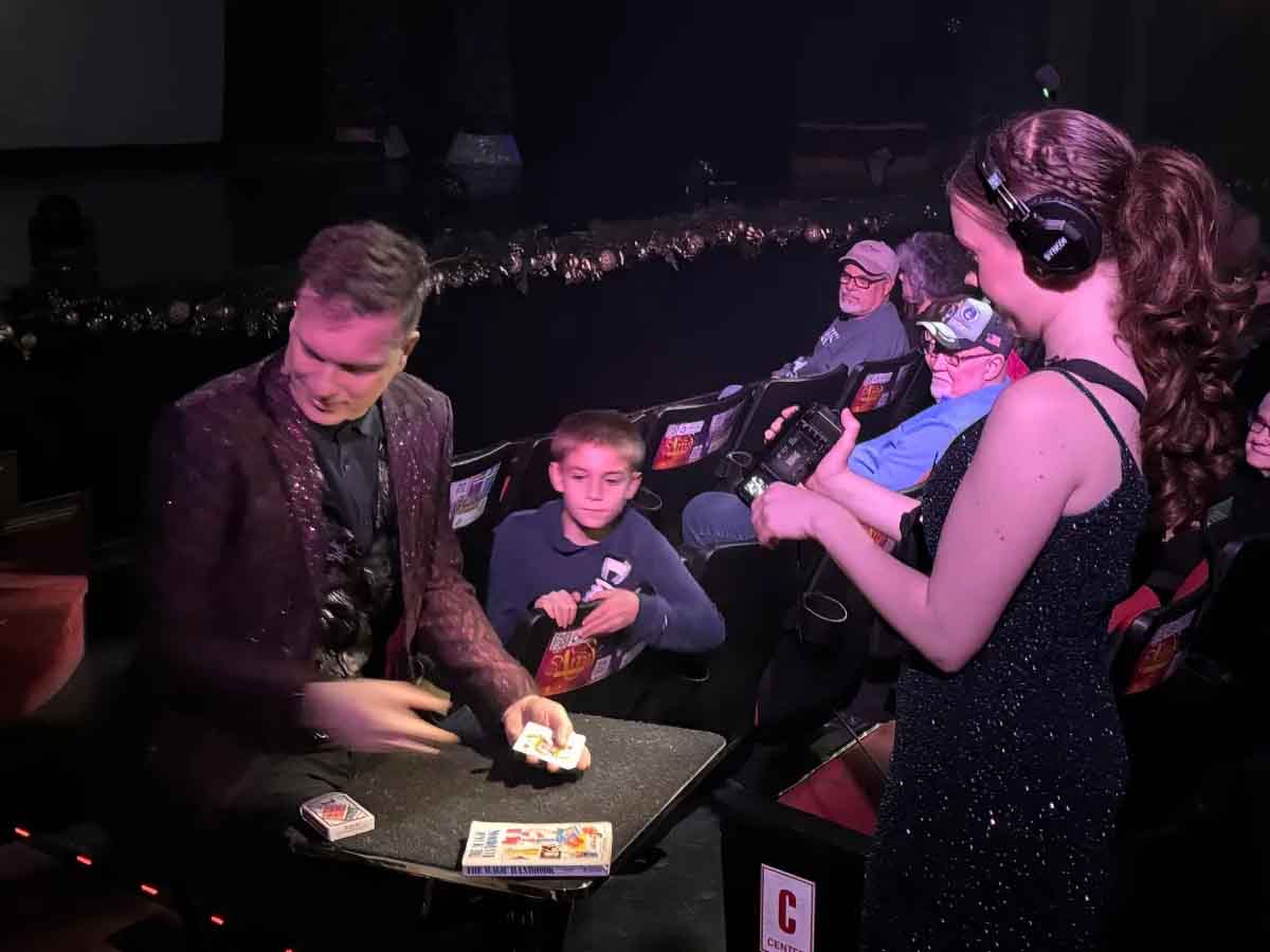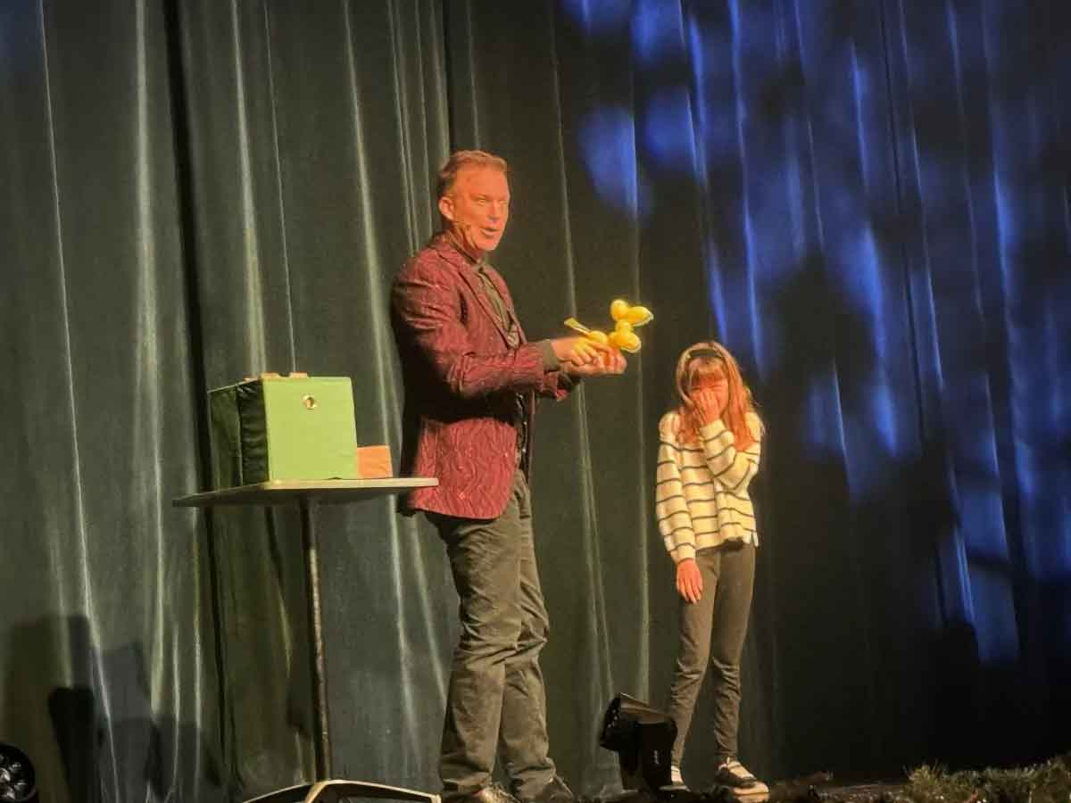Perhaps one of the most beloved elements of the Illusionation experience is the audience interaction, as Hudy is known to summon audience members of all ages to join him on stage during the show for a myriad of bits including a magical coloring book that features pages that vanish then subsequently reappear right before the audience’s very eyes , numerous up close and personal card tricks, and a fun and light hearted segment with “Pierre” the balloon animal, which the young lady volunteering on the day of our attendance was allowed to keep, much to her delight.