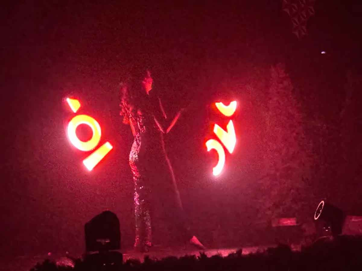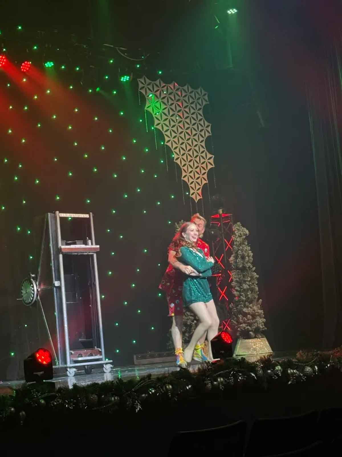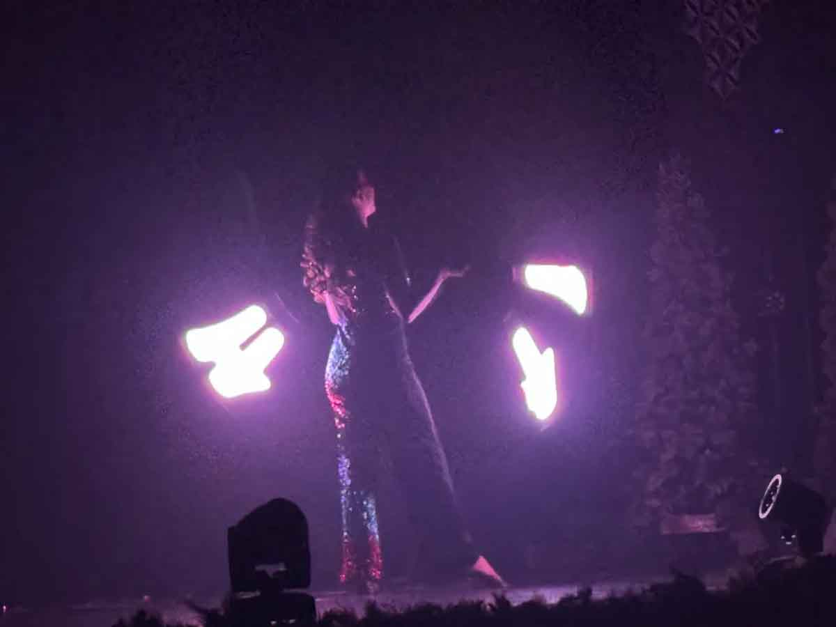Jill Terry, principal female cast member astounds the audience with a stunning performance where she wields glow -stick like apparatuses in perfect rhythm, spelling out a variety of words and images.