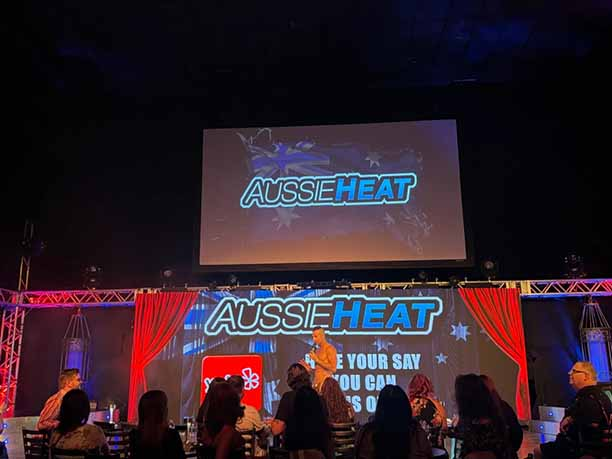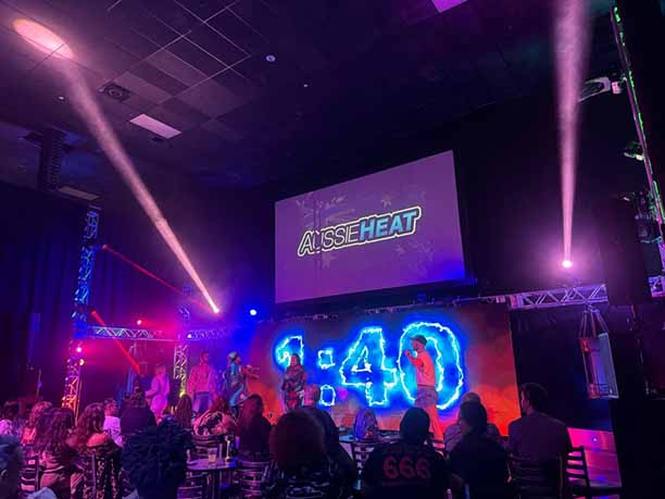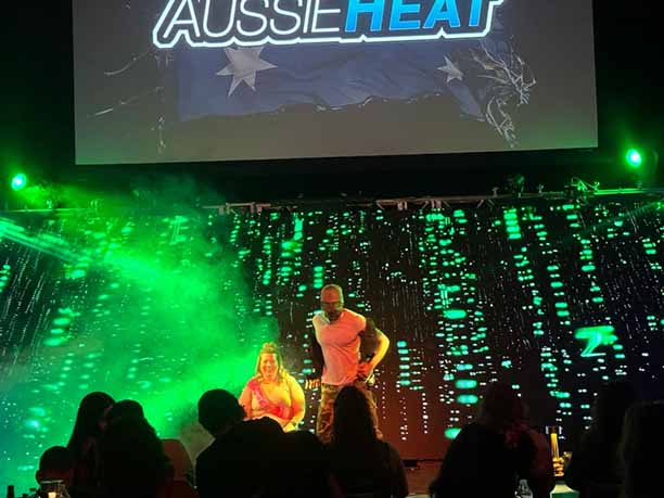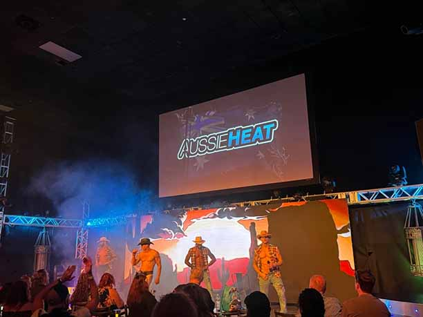 The emcee, Aaron, a renowned Aussie dancer and choreographer, seamlessly transitions between high octane dance routines and his emcee duties maintaining a warm, engaging rapport and chemistry with both the nearly sold out audience and the other entertainers. Aussie Heat features a keenly Australian aesthetic, wildly sensual routines, and state of the art surround sound music and LED screens.