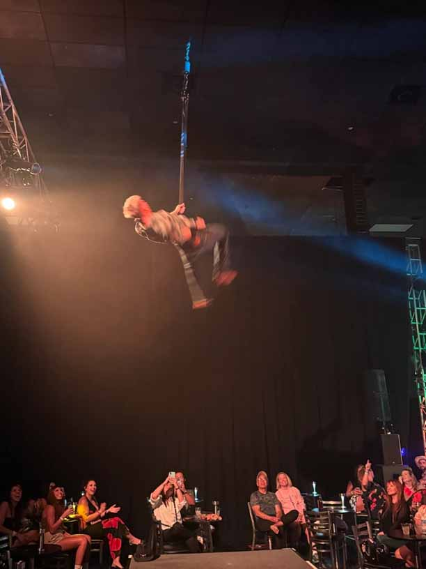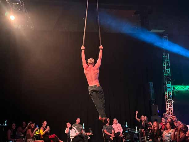 Perhaps one of the most immersive and innovative numbers of the evening is an edge of your seat aerial performance by Jake Johnson, during which he showcases his agility, strength and grace, flying high above the crowd with ease and great aplomb.