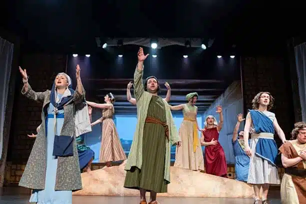 Peter (played with a quiet intensity by Matthew Dugan) leads the ensemble in a powerful number entitled “To The Ends of the Earth” during which he and Jesus’s ardent, and growing, legions of followers proclaim that they will continue to travel to the ends of the earth to profess the message of Jesus Christ.