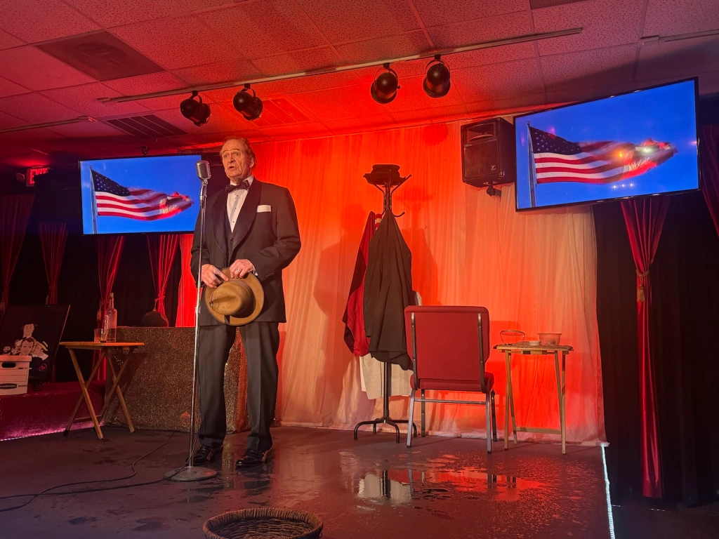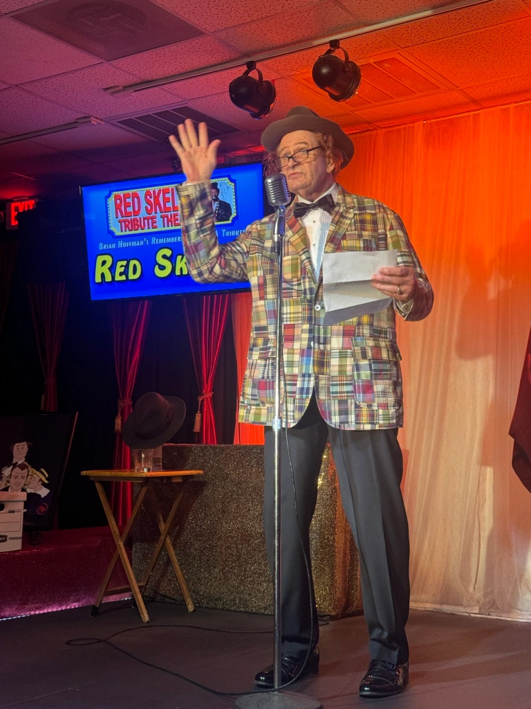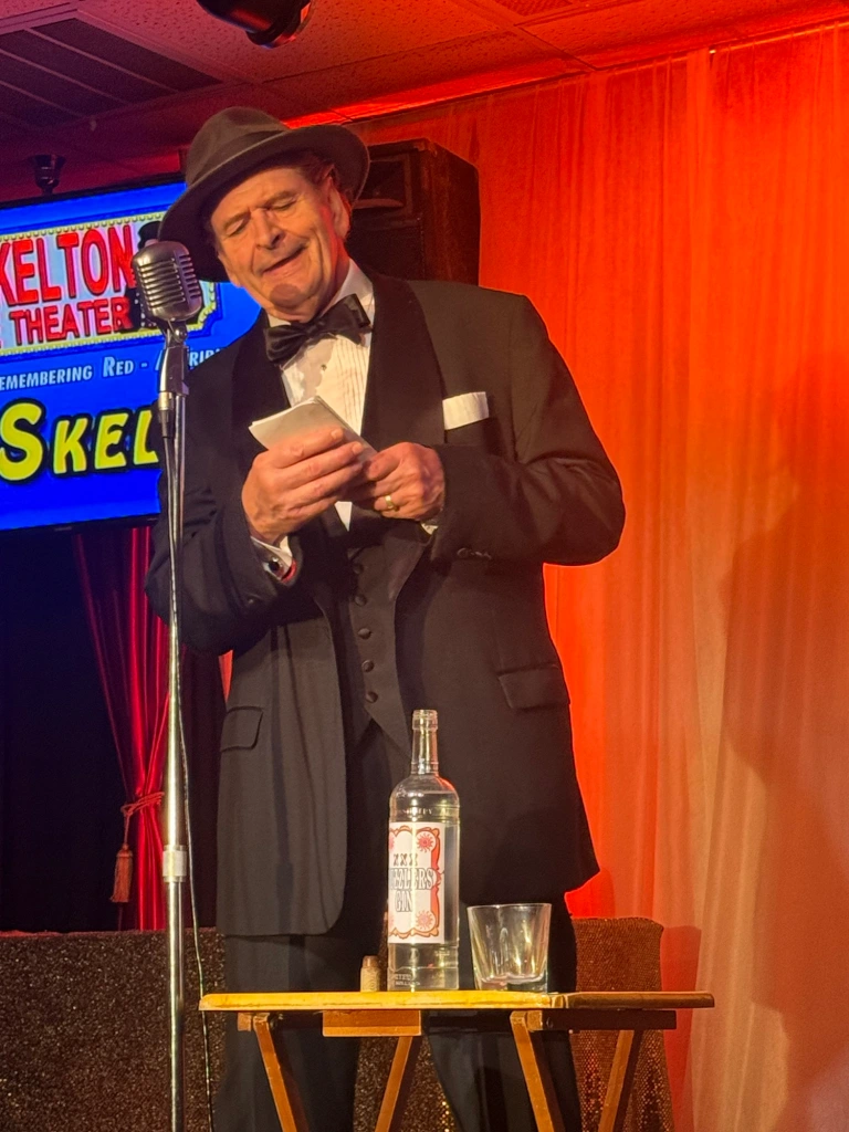 Hoffman flawlessly embodies the very essence of Red Skelton in physical appearance, mannerisms, speech, and comic timing, kicking off the show with one of Red’s many iconic acts, Gertrude and Heathcliffe, a couple of silly and witty seagulls who engage in shenanigans as they sit perched near a dock. He then transitions into a hilarious pantomime of a mouse stealing a piece of cheese, then without skipping a beat, proceeds to act out a laugh out loud reenactment of a hillbilly shotgun wedding, featuring a reluctant groom, a screaming baby, and a jar of moonshine.