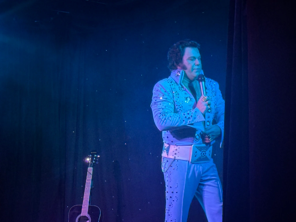 Once the video package has concluded, Rush takes the stage as “The King,” stylishly clad in a bedazzled turquoise colored “Nudie Suit” (originally designed by storied designer to the stars, Ukrainian-American designer Nudie Cohn), and begins the second, headlining portion of the show. This half features a plethora of Presley’s extensive chart topping hits.