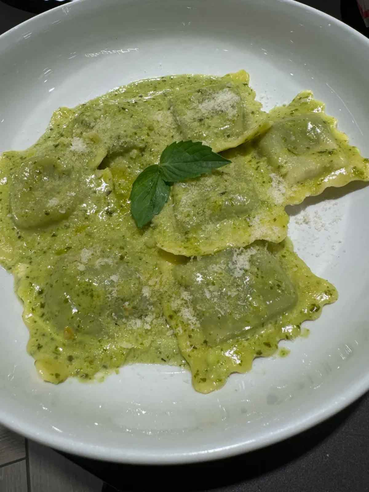 Ravioli with Spinach and Pesto. Bursting with dynamic flavor at every turn, each ravioli is stuffed to perfection with tender spinach greens , and adorned with just the perfect amount of pesto sauce. This scrumptious entree is just as aesthetically pleasing as it is delicious.