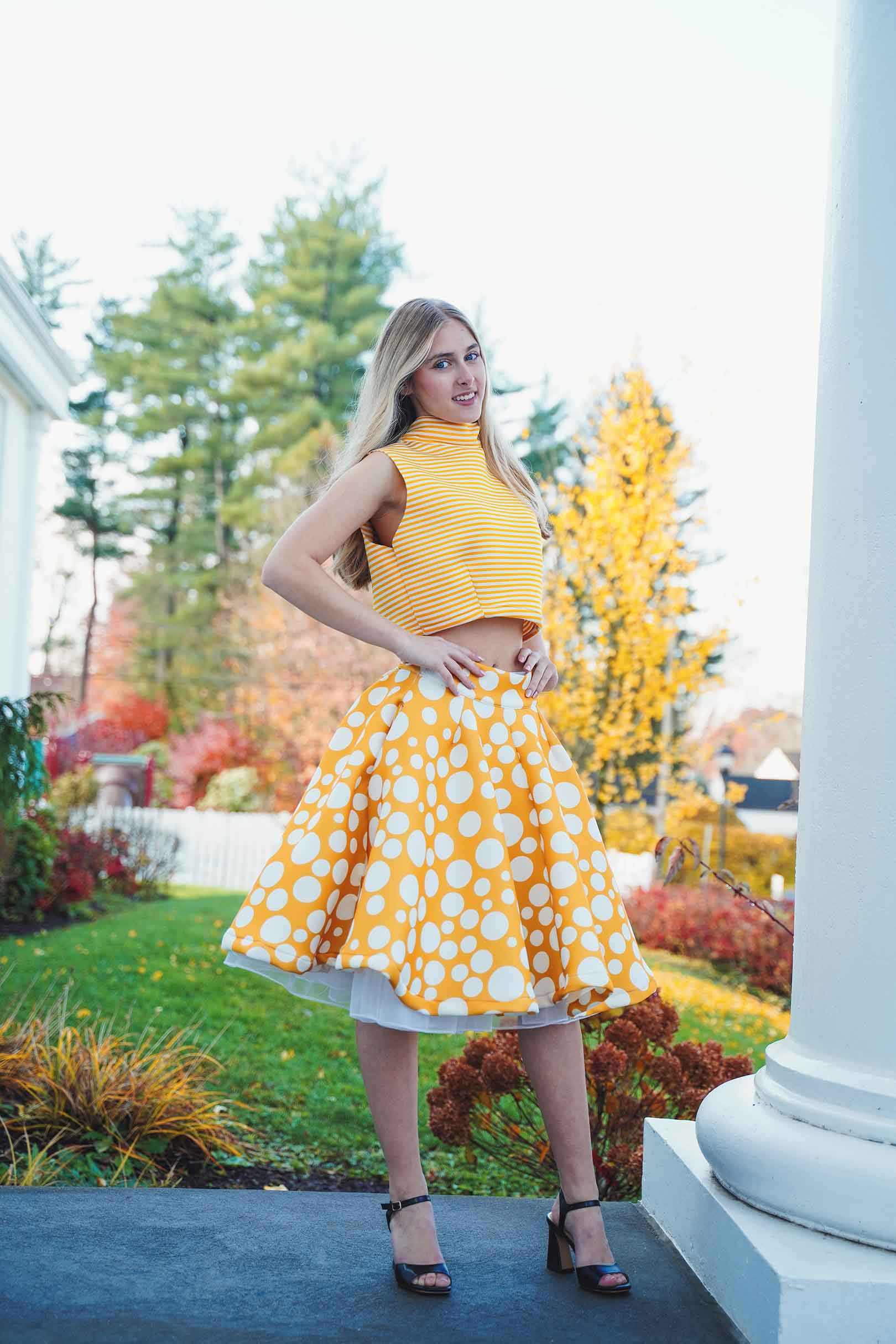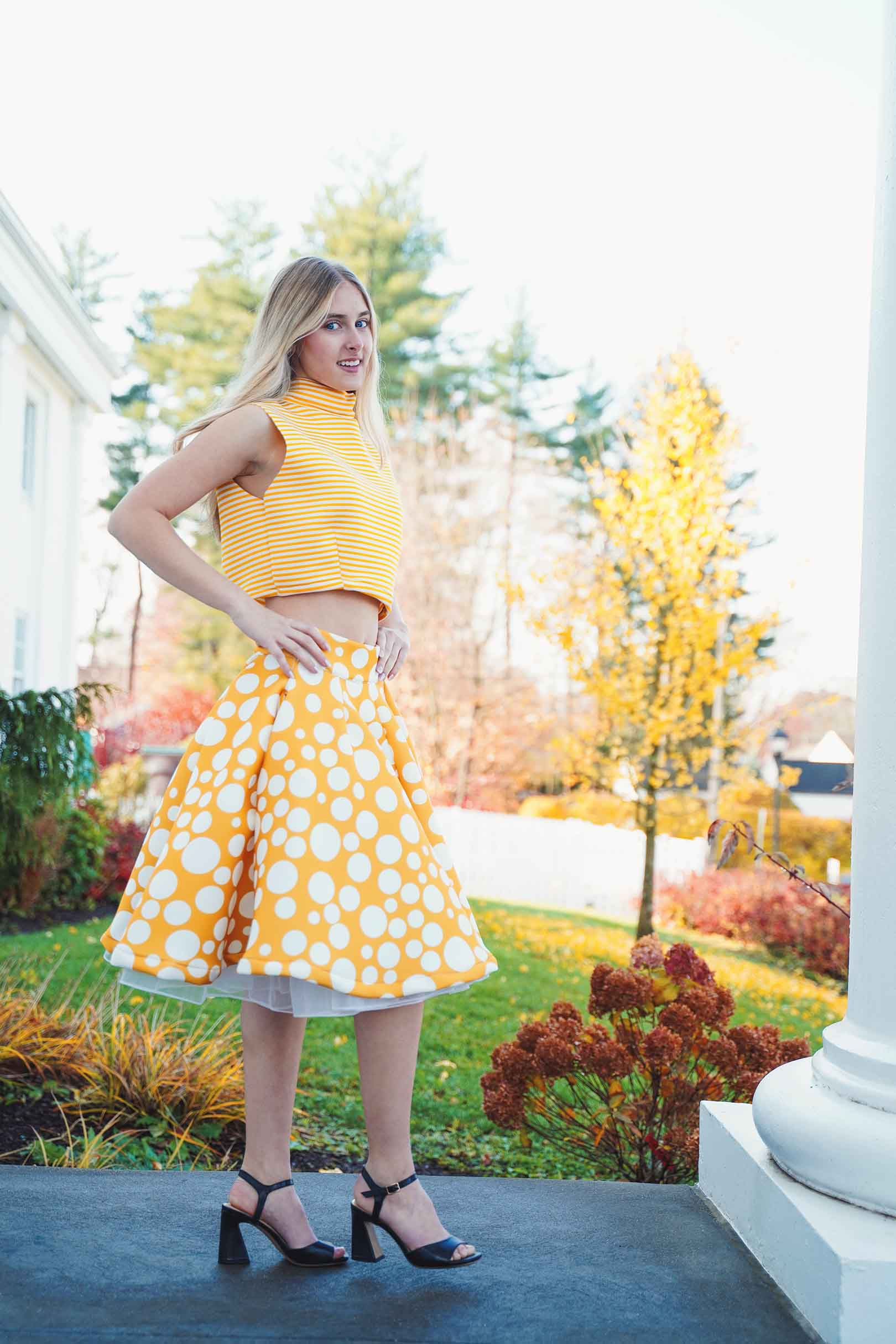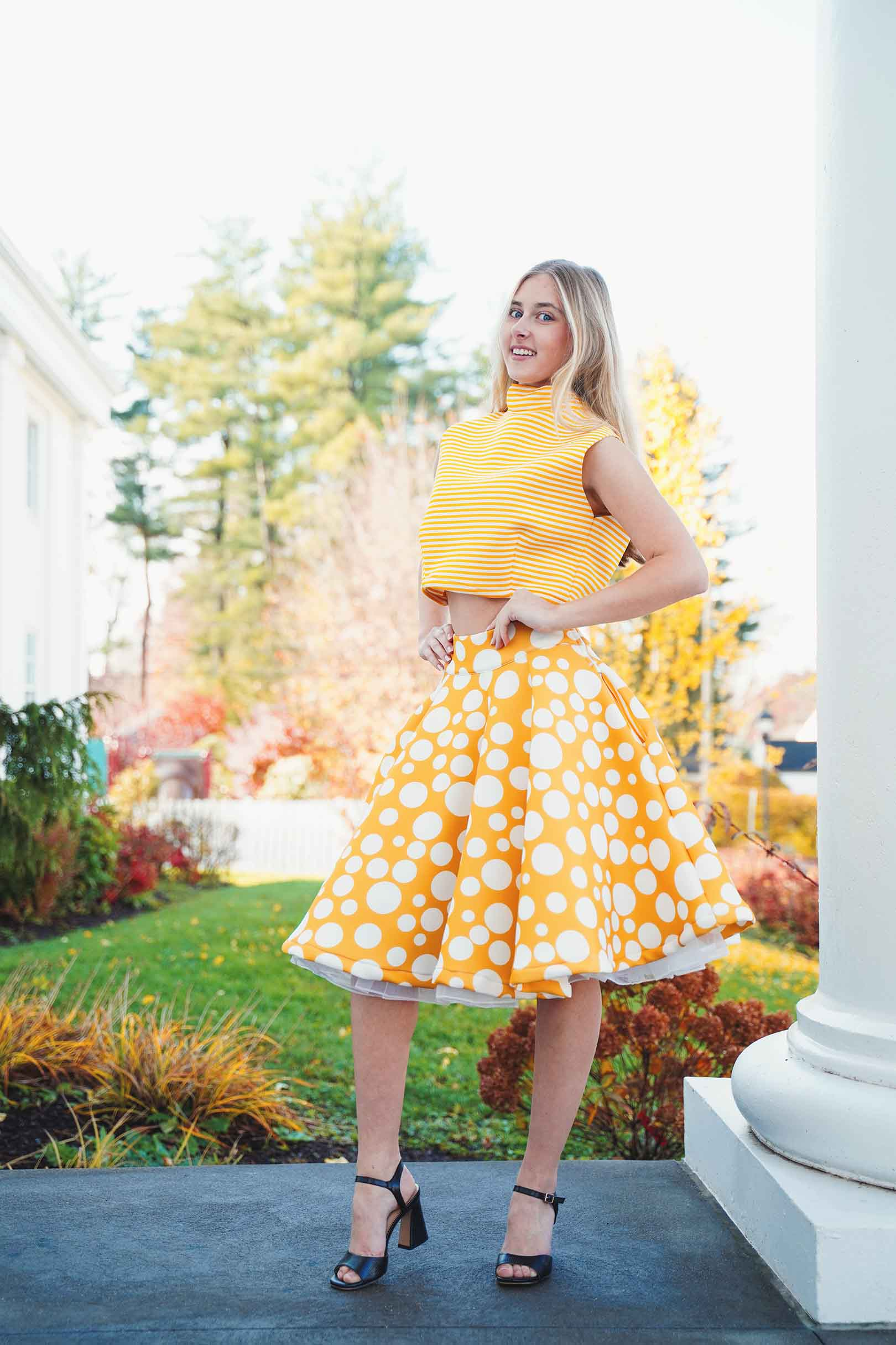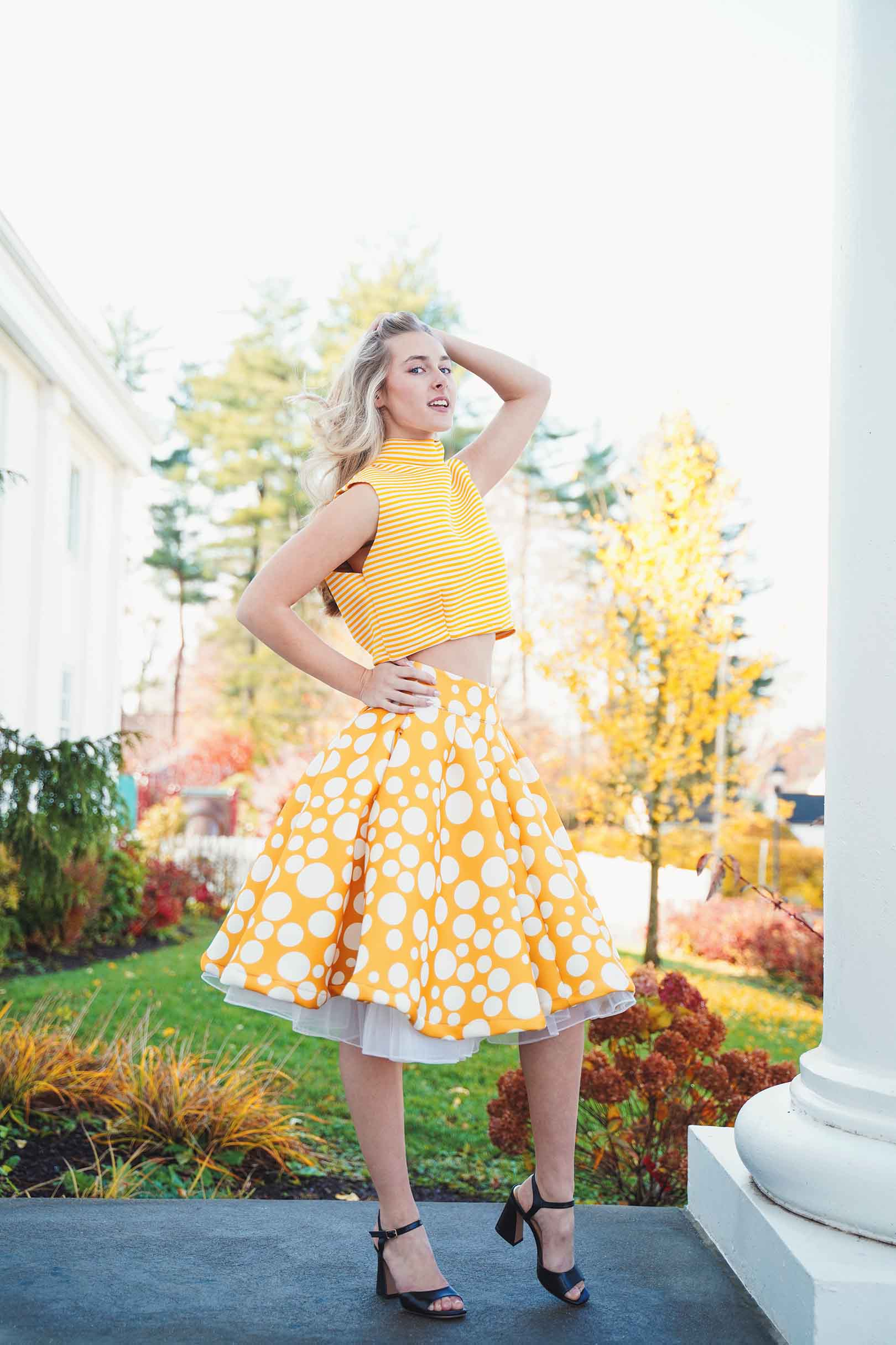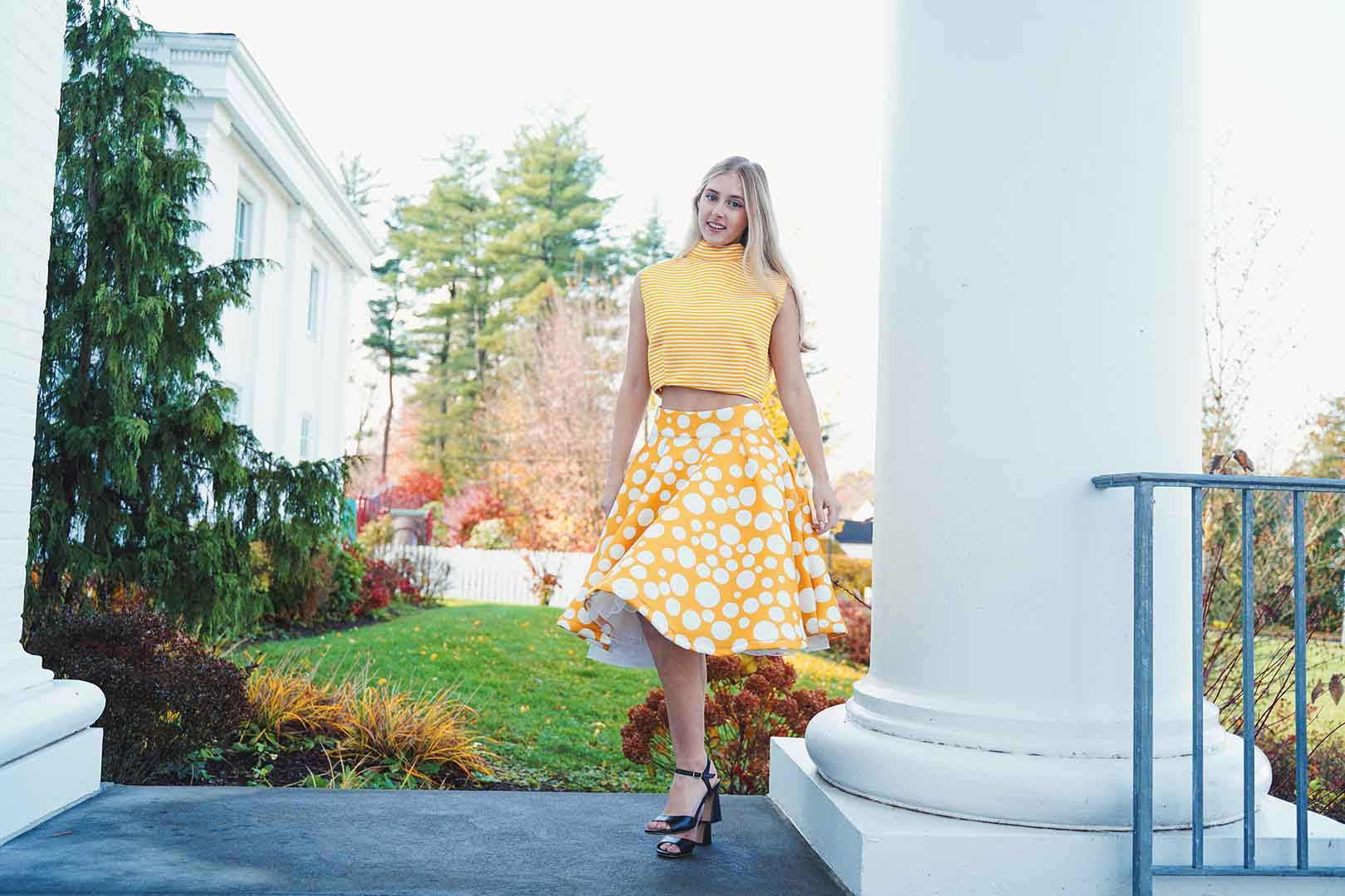 The latest design from La’Moo stands out in an urban environment, as demonstrated by model Maja Esposito who poses in Hartford, and the suburban environment, as demonstrated by model Violet Jakupco in Farmington.