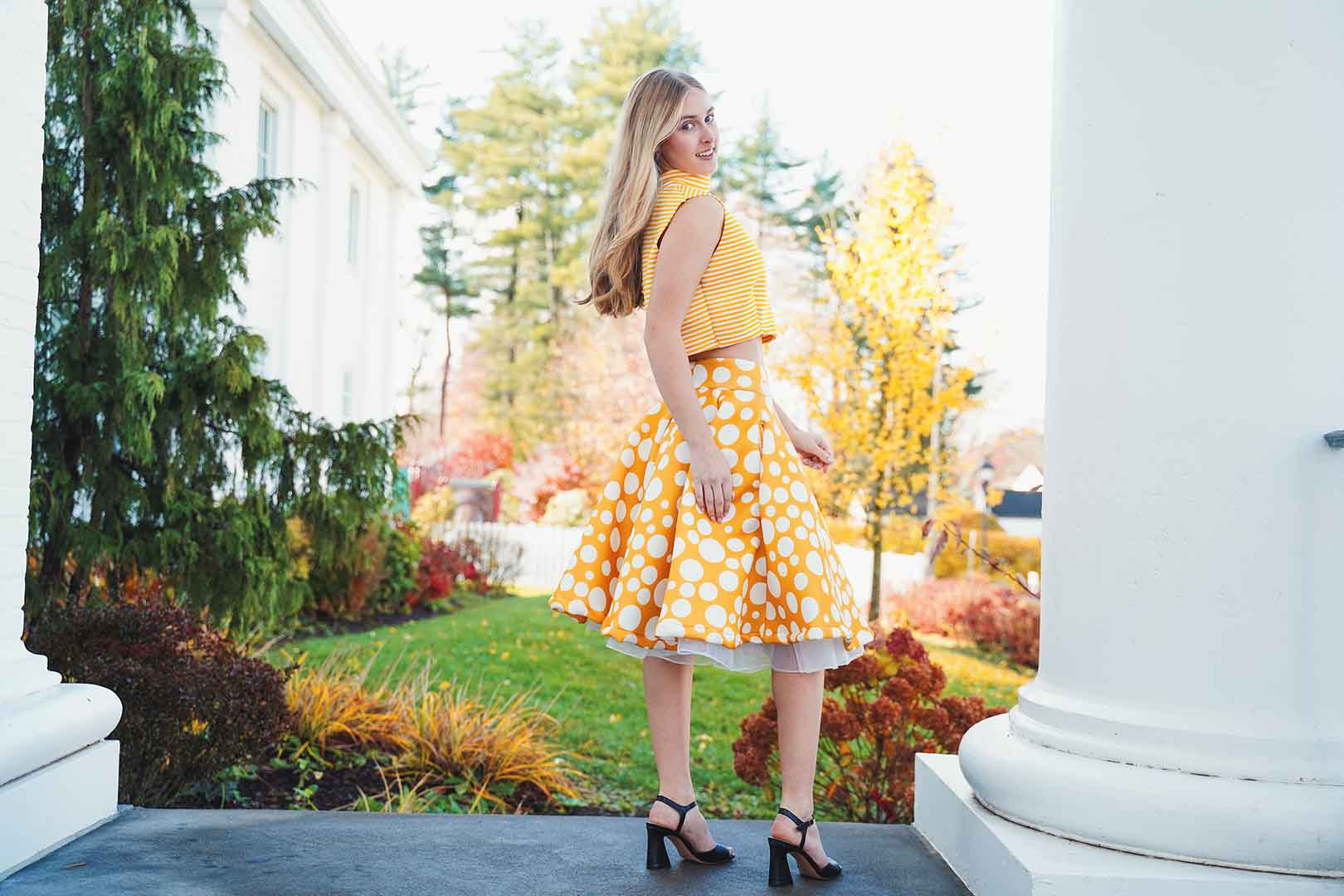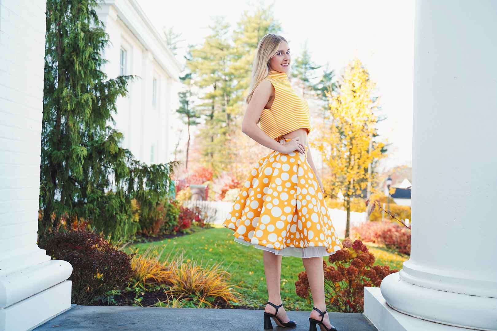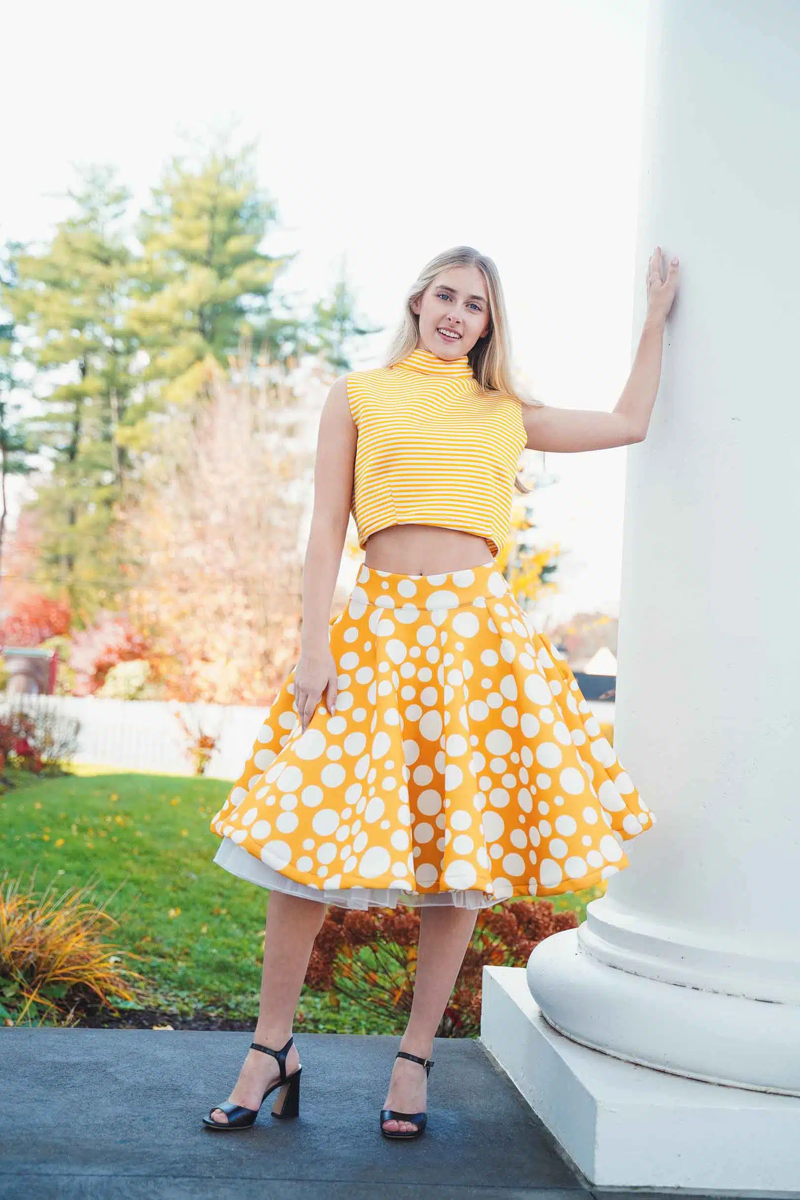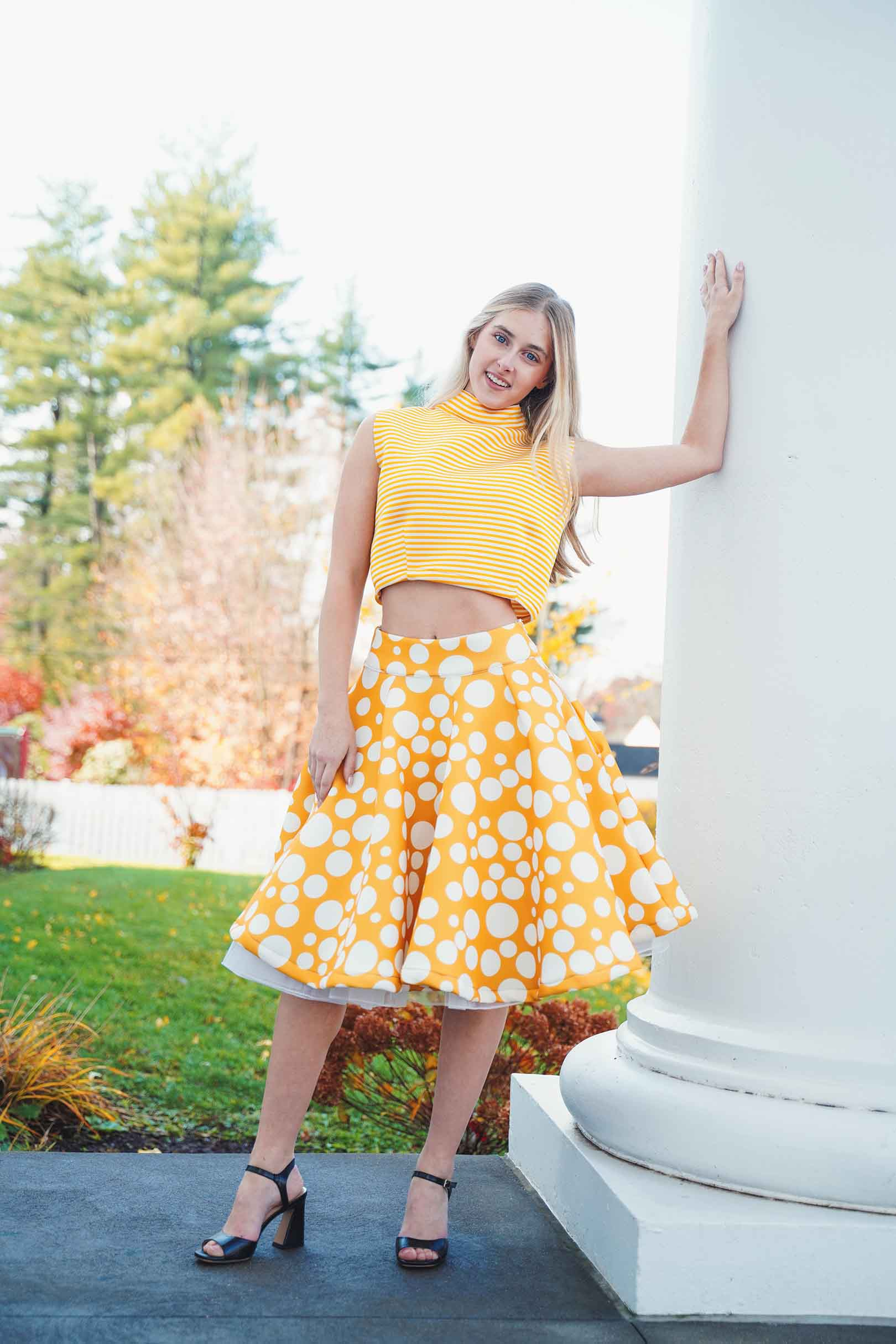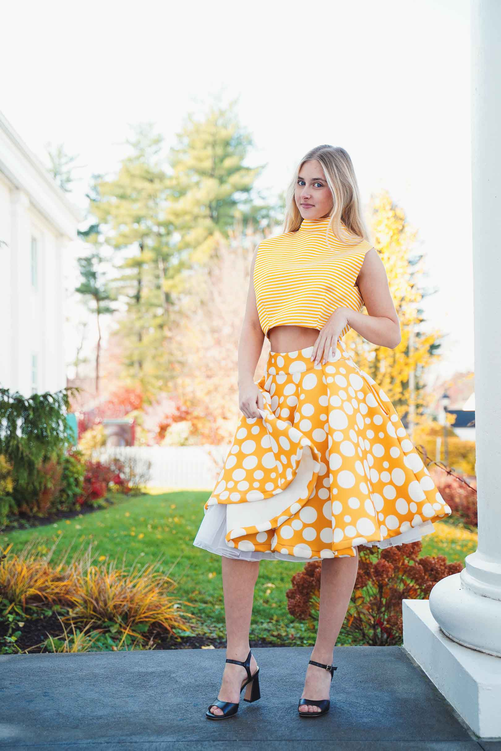 The latest design from La’Moo stands out in an urban environment, as demonstrated by model Maja Esposito who poses in Hartford, and the suburban environment, as demonstrated by model Violet Jakupco in Farmington.