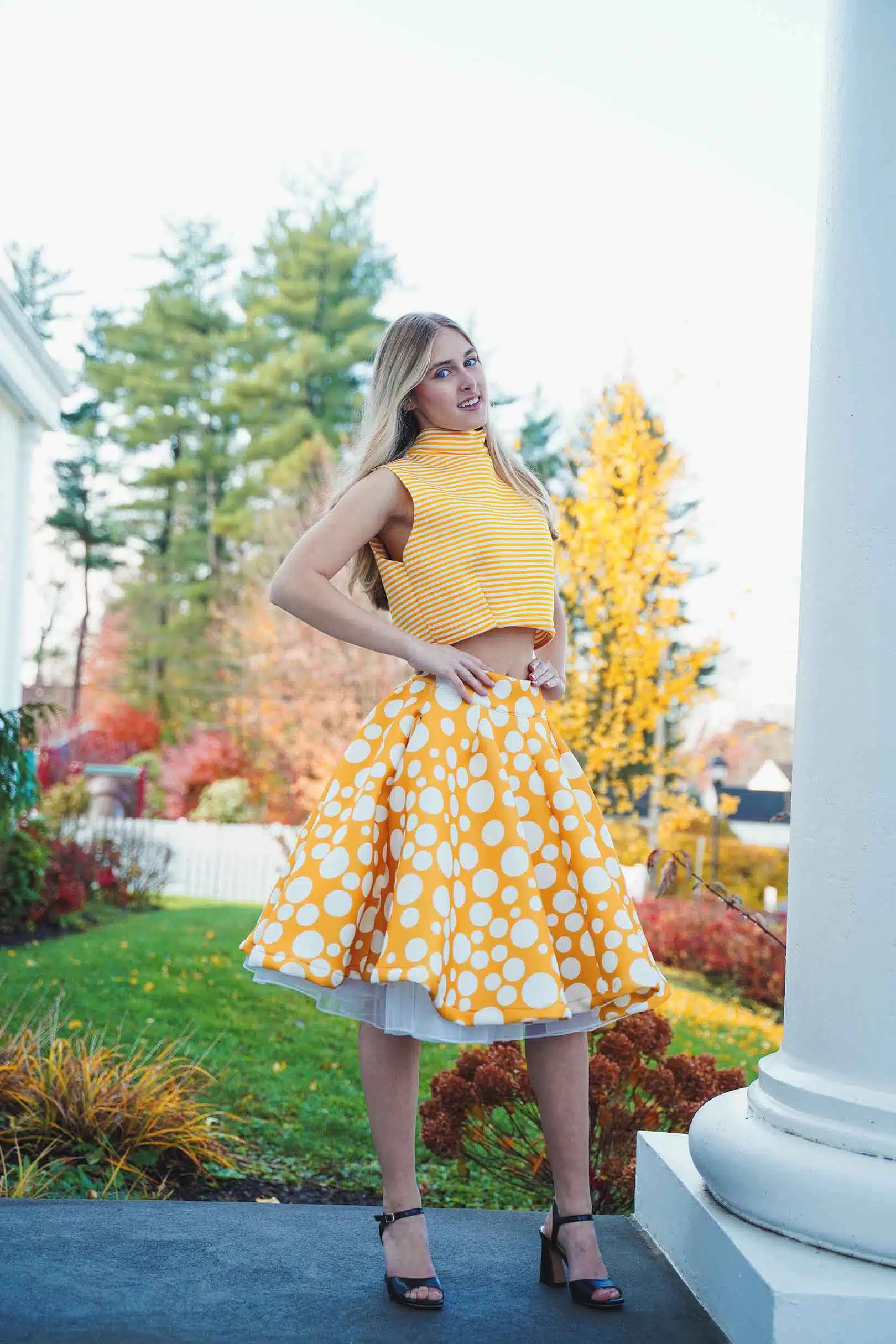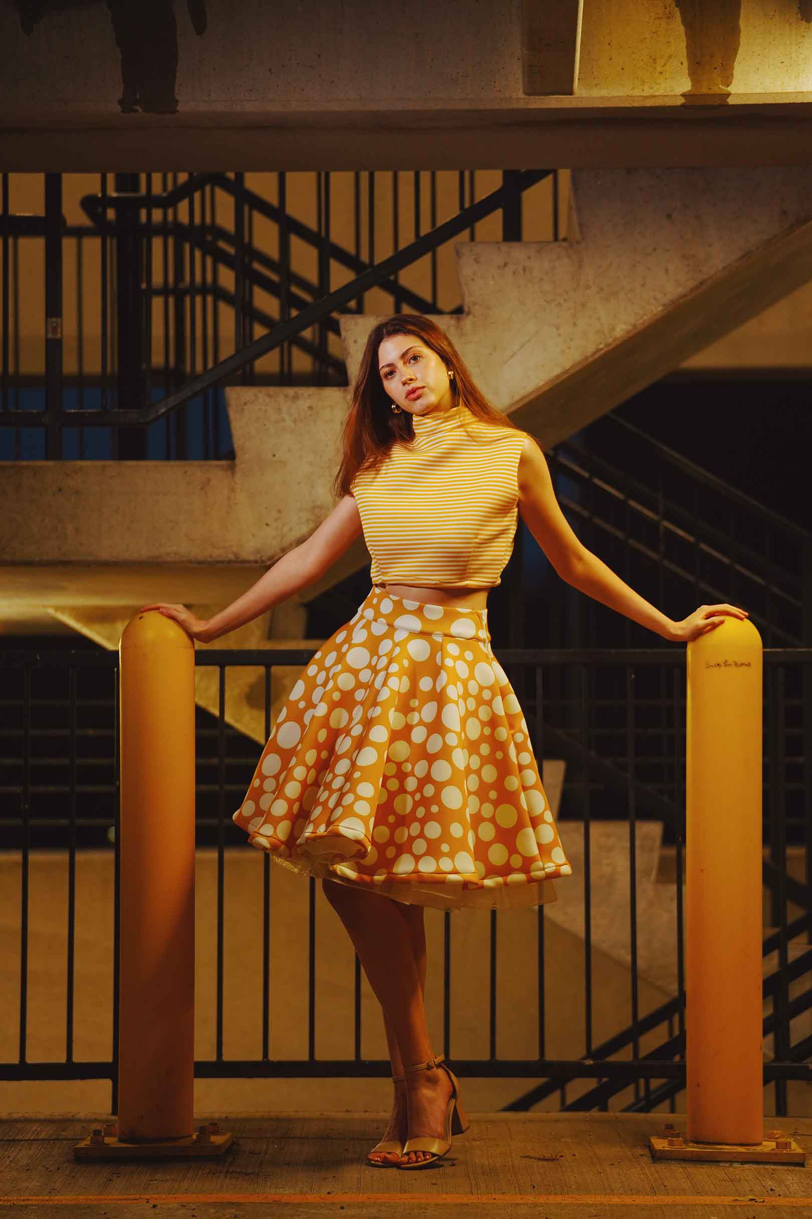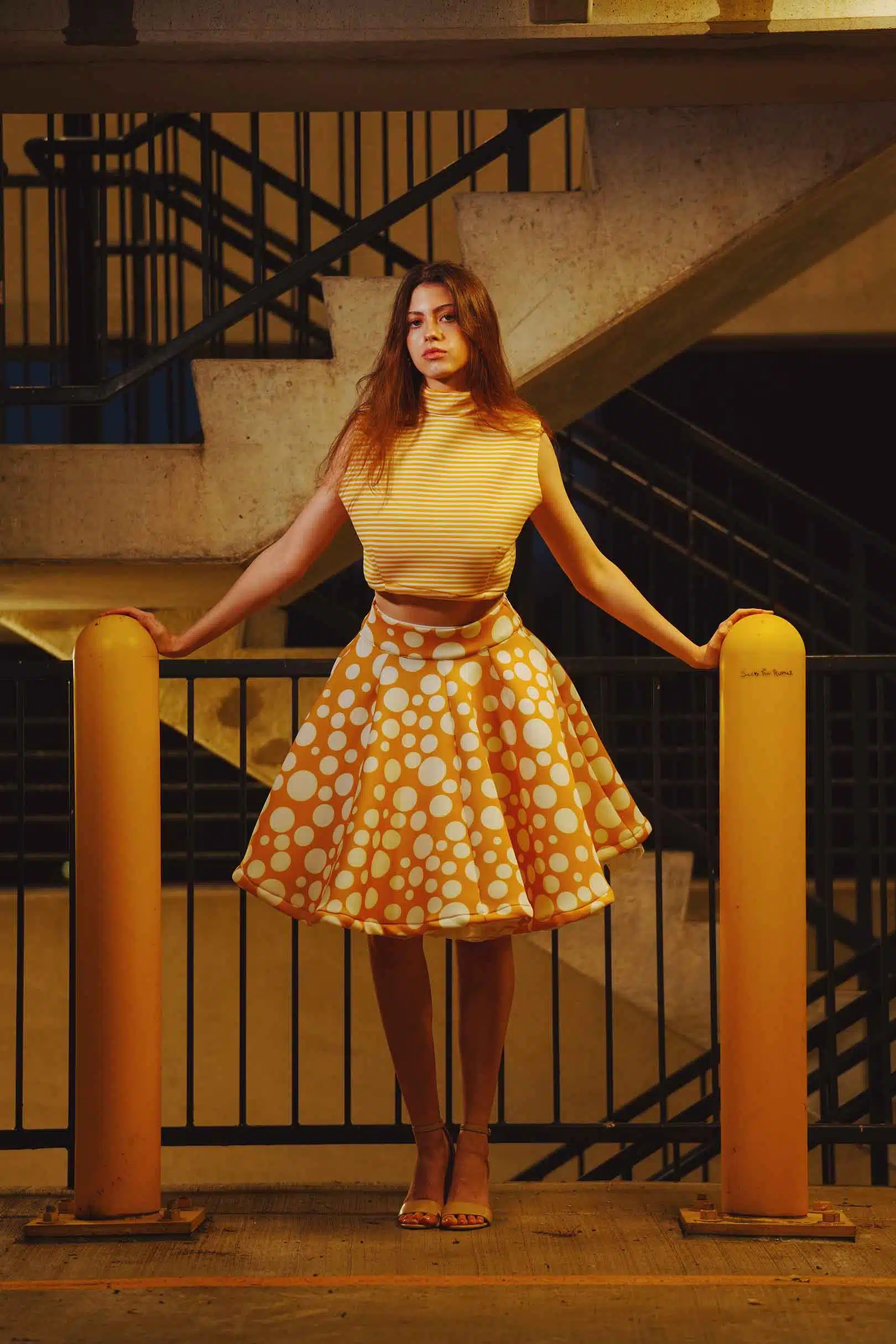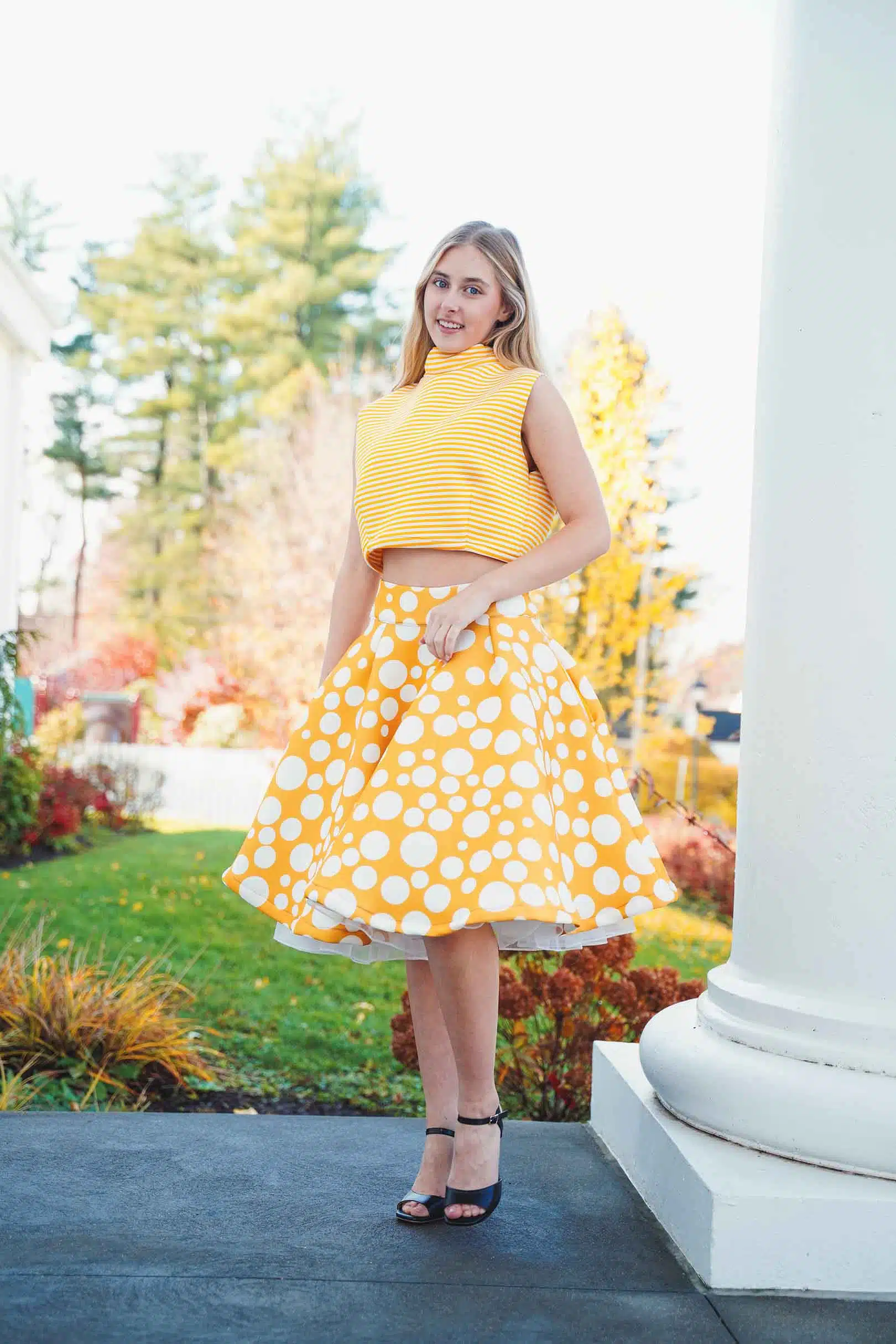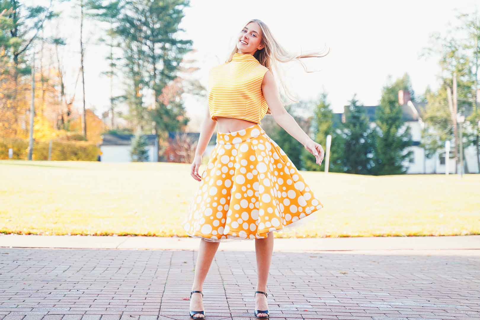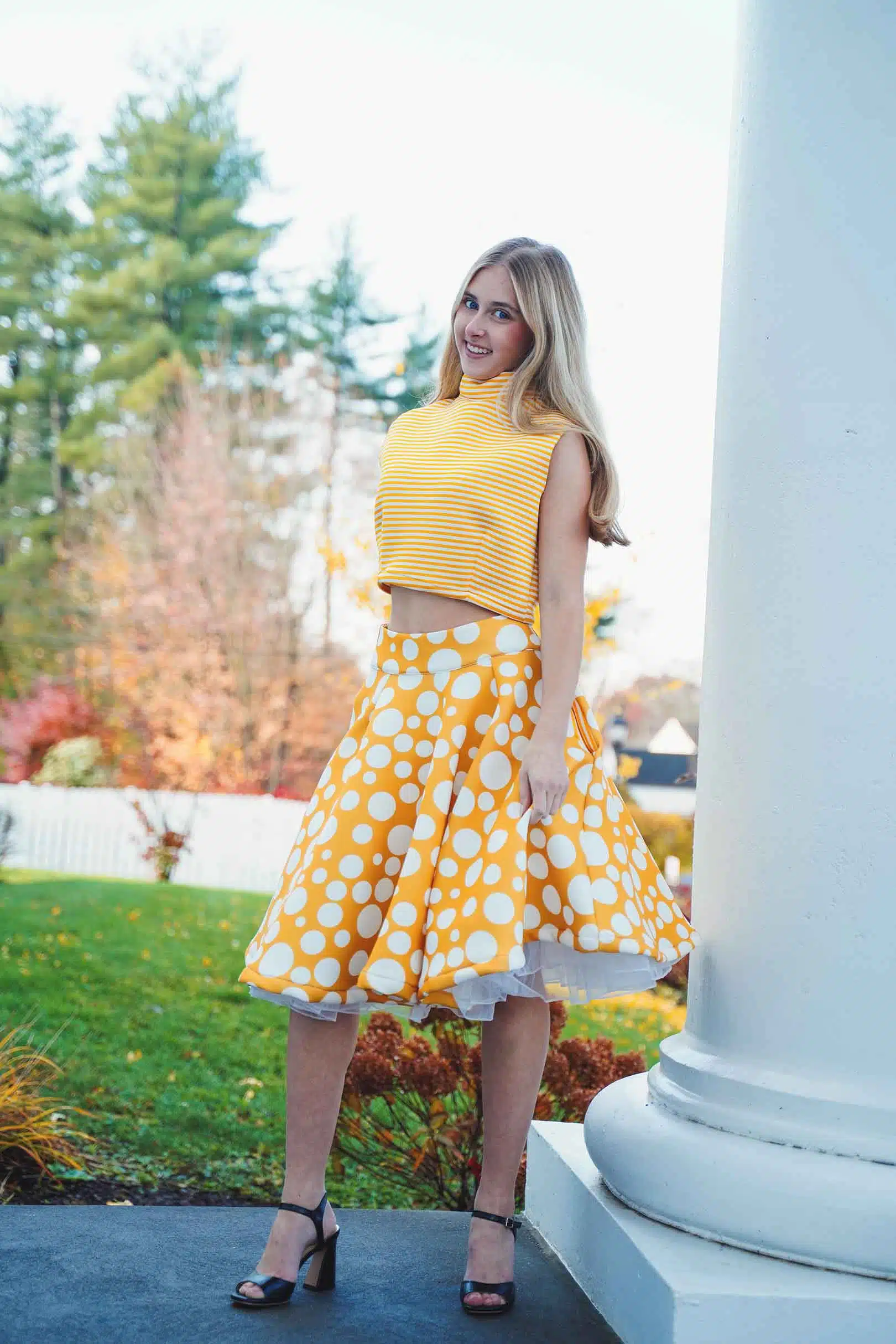 The latest design from La’Moo stands out in an urban environment, as demonstrated by model Maja Esposito who poses in Hartford, and the suburban environment, as demonstrated by model Violet Jakupco in Farmington.