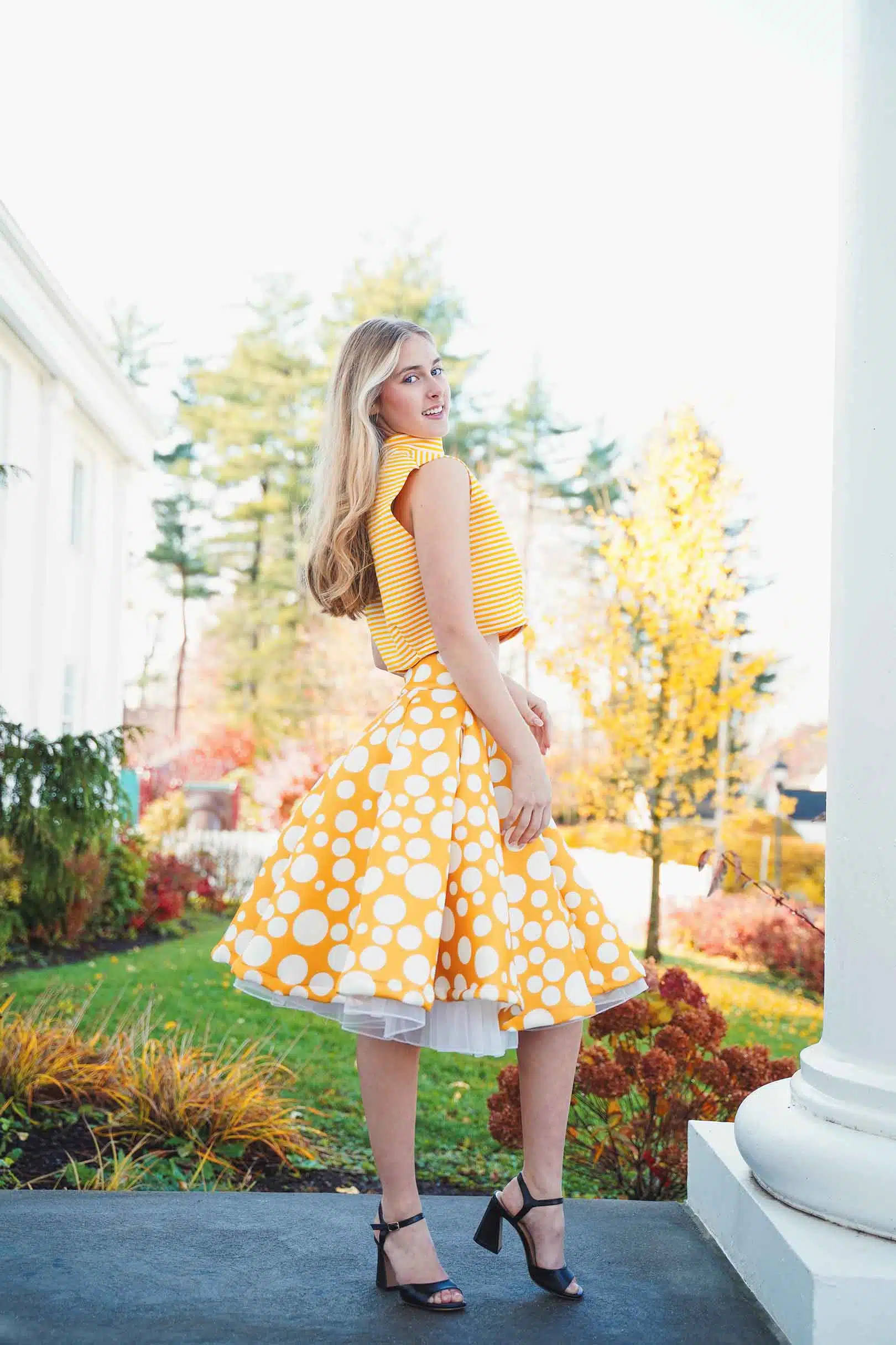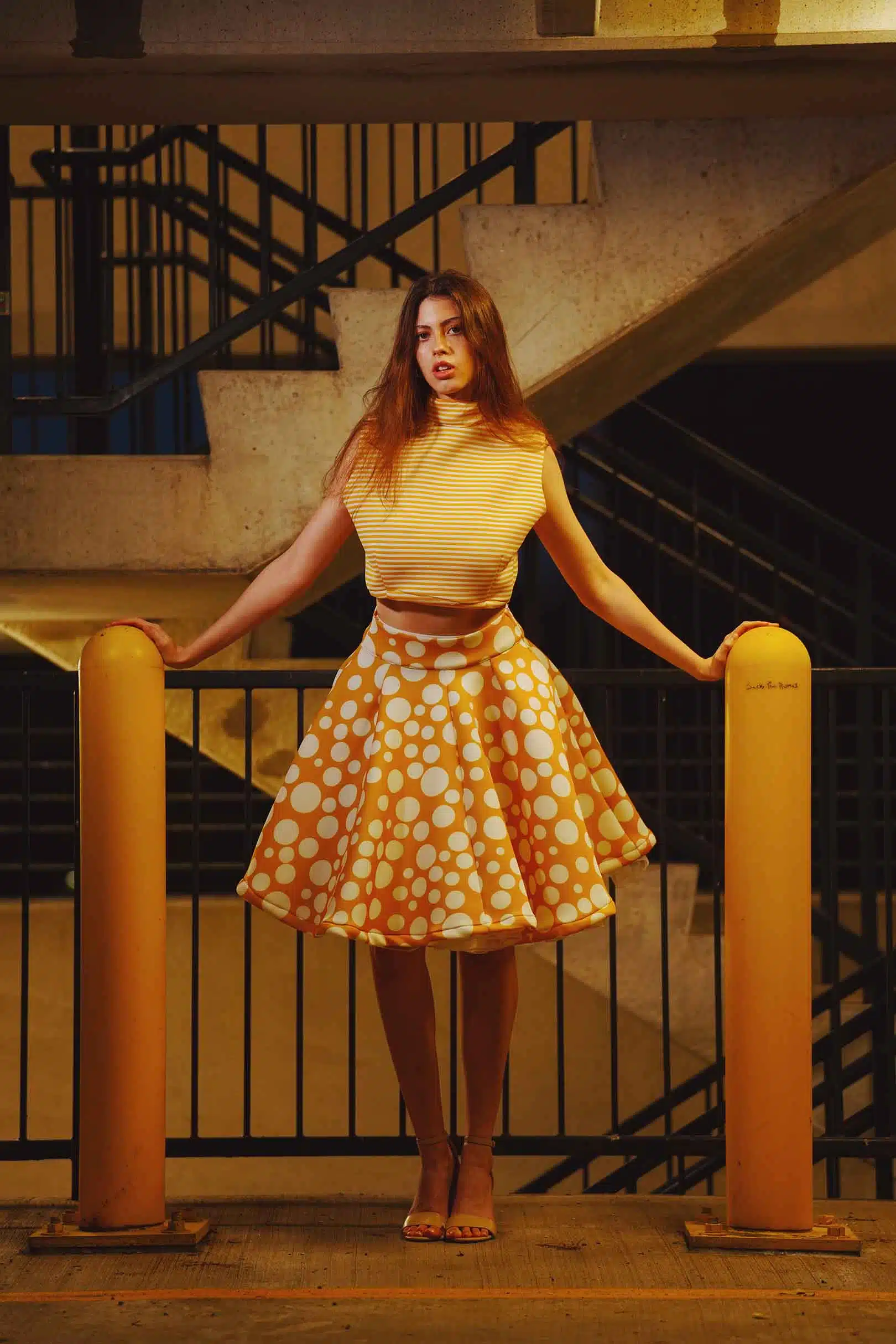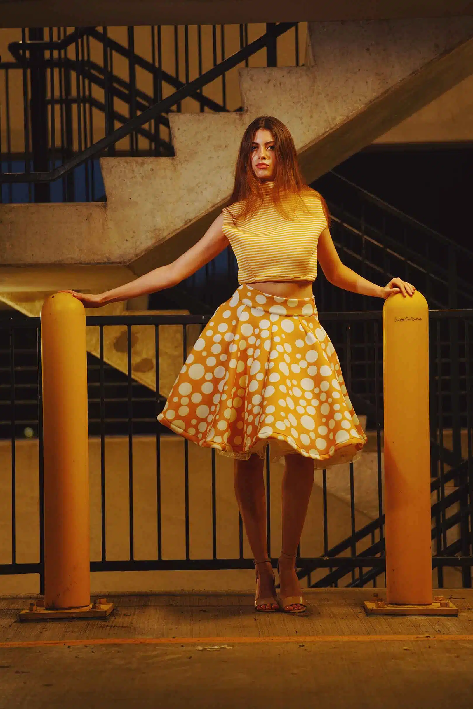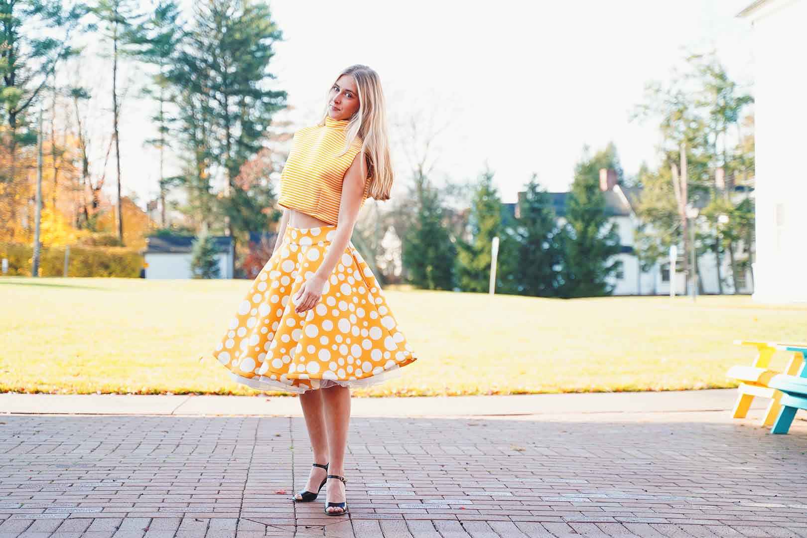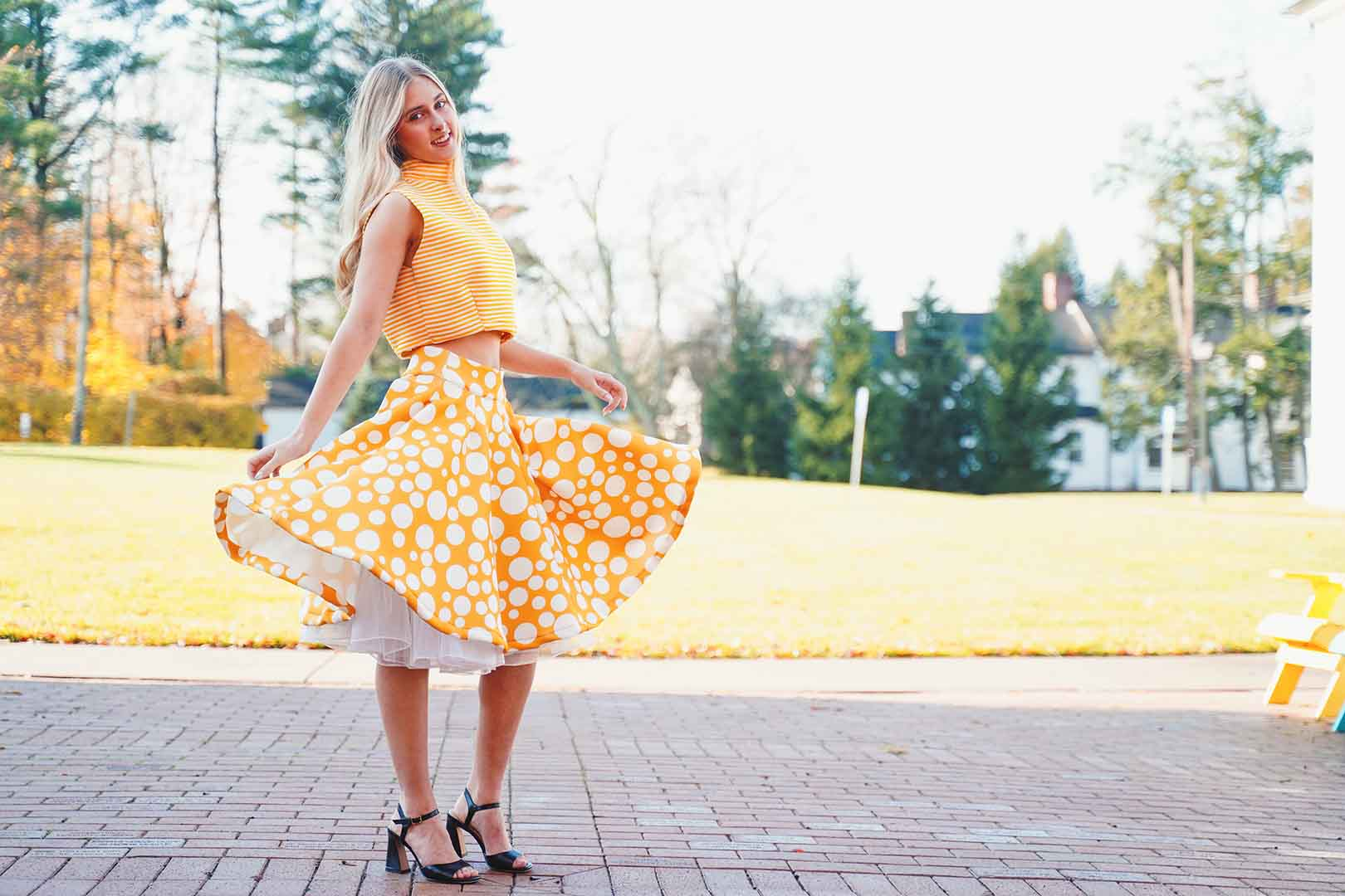 The latest design from La’Moo stands out in an urban environment, as demonstrated by model Maja Esposito who poses in Hartford, and the suburban environment, as demonstrated by model Violet Jakupco in Farmington.