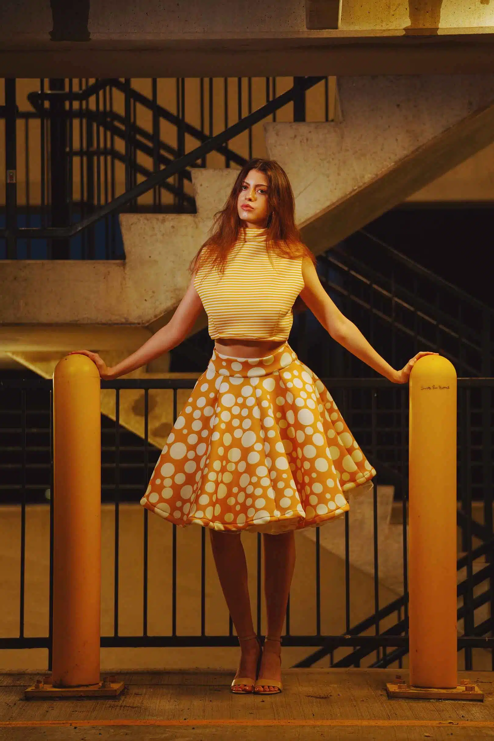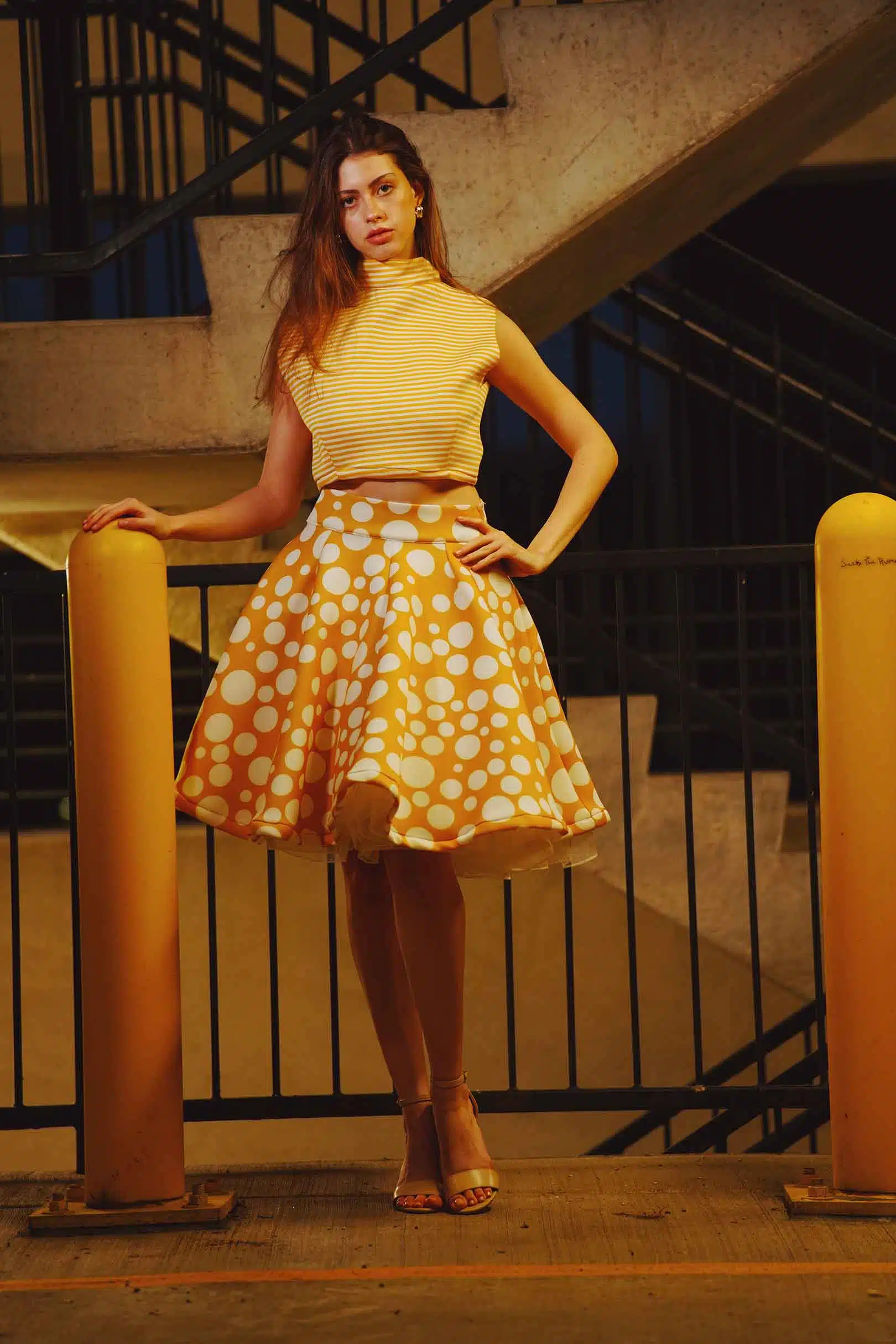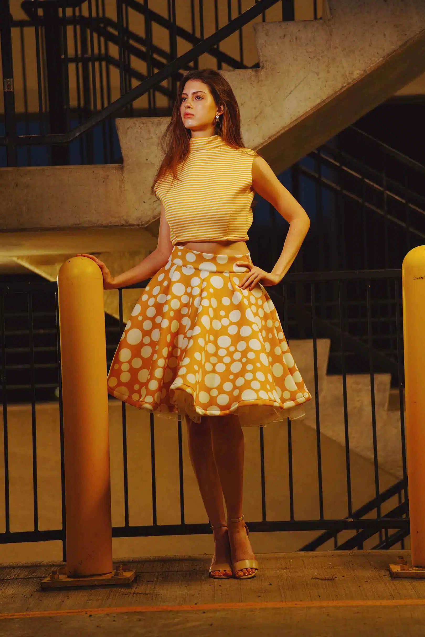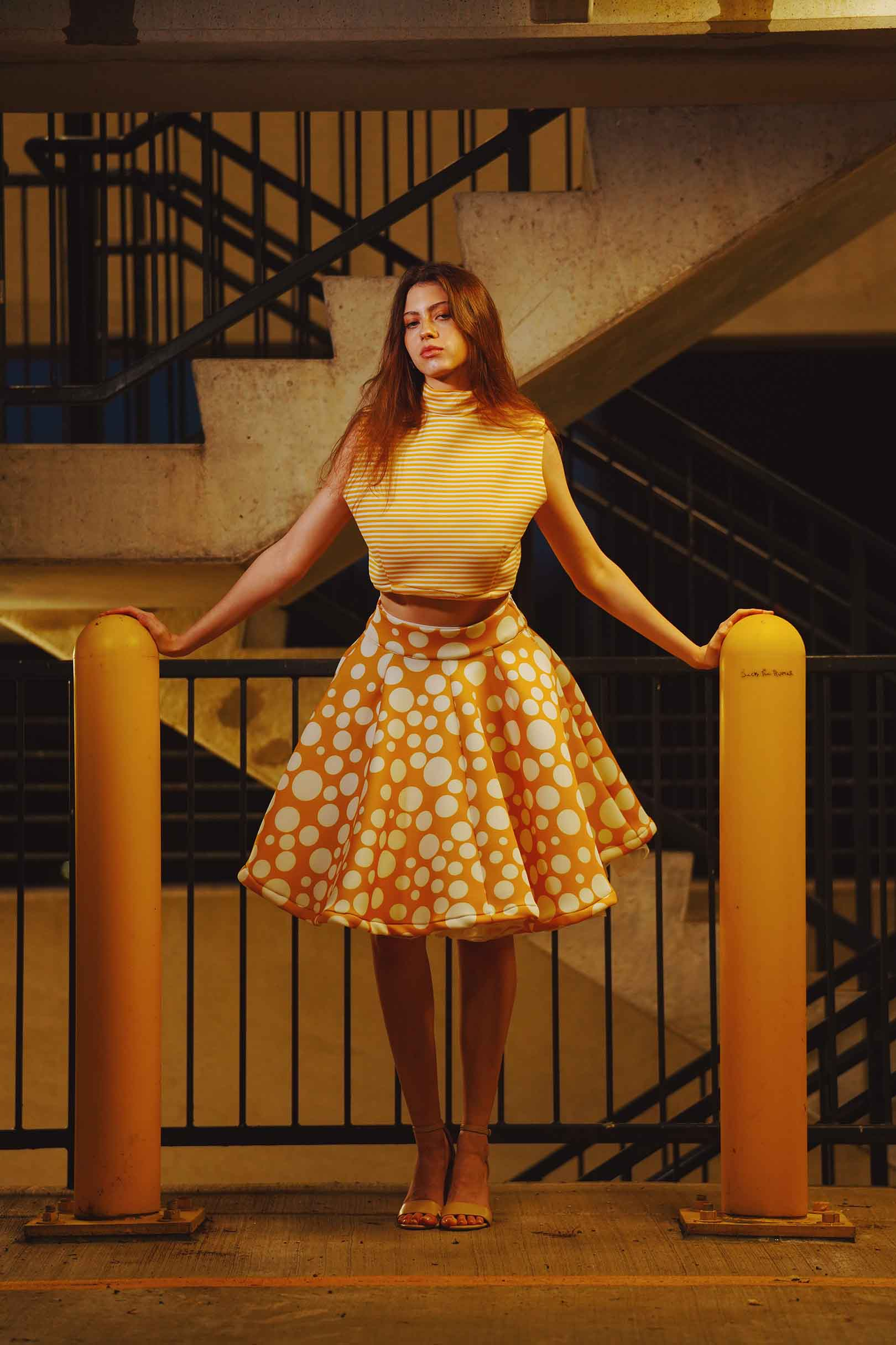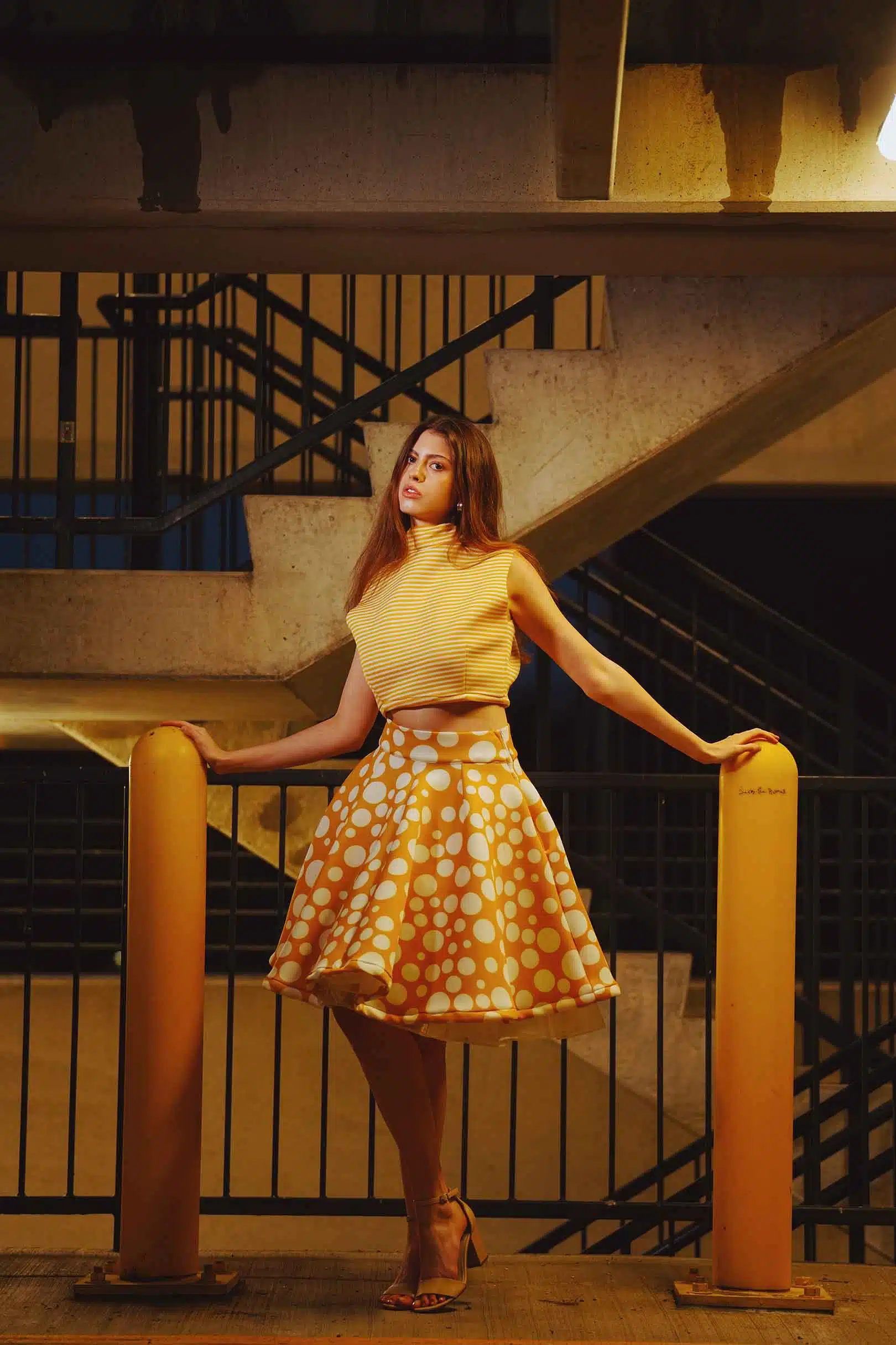 The latest design from La’Moo stands out in an urban environment, as demonstrated by model Maja Esposito who poses in Hartford, and the suburban environment, as demonstrated by model Violet Jakupco in Farmington.