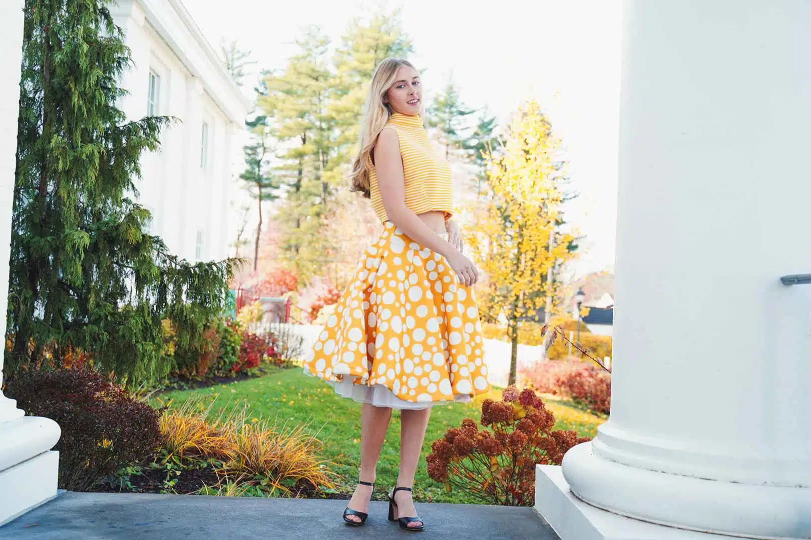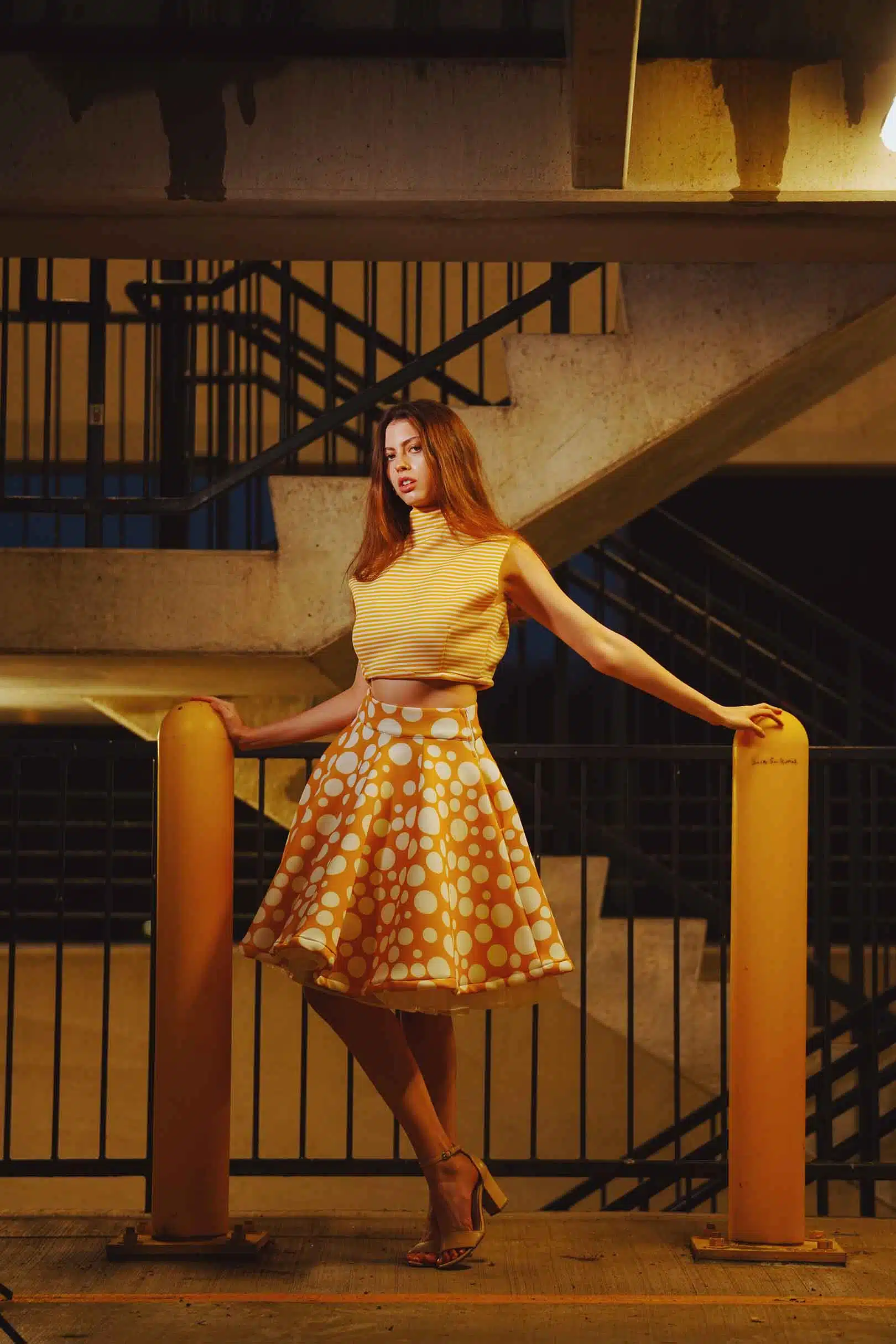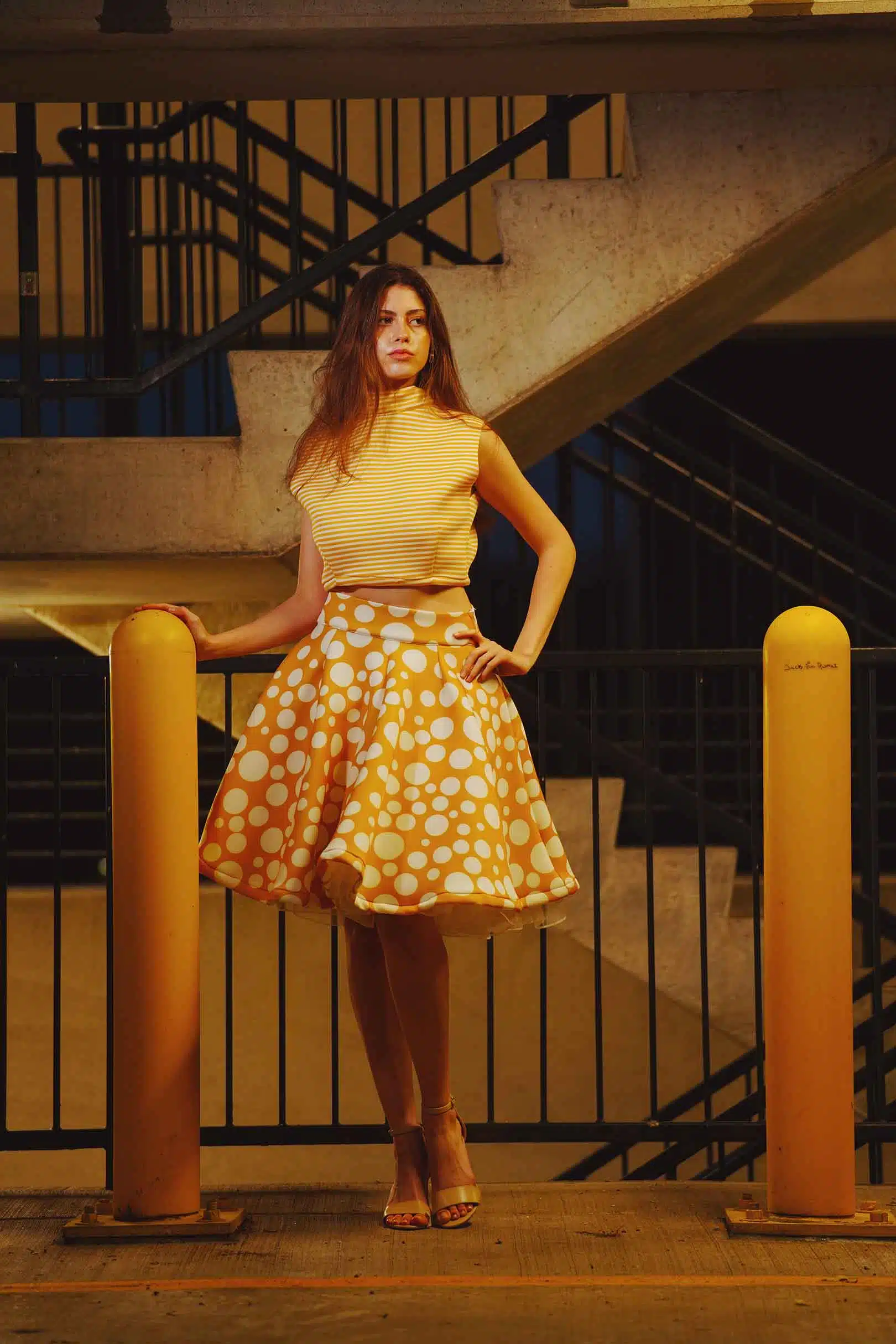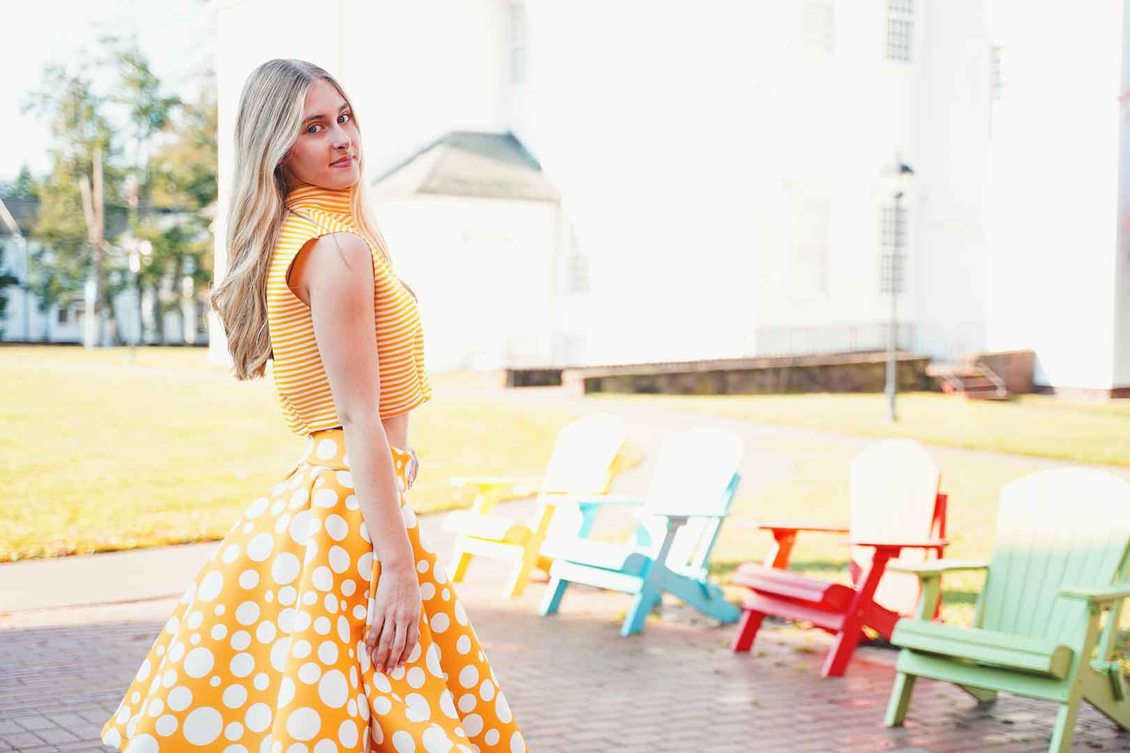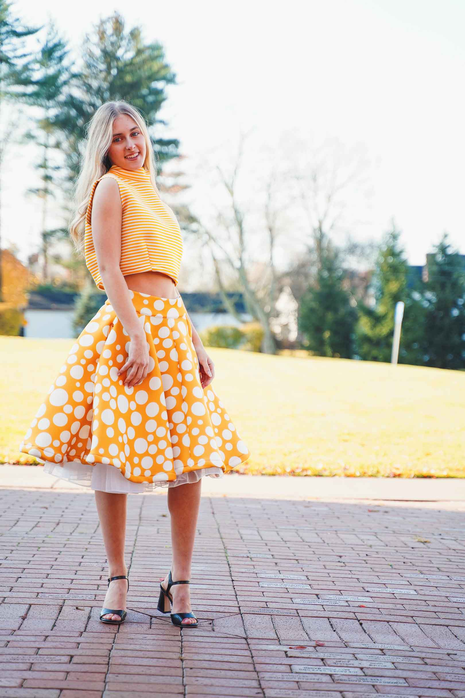 The latest design from La’Moo stands out in an urban environment, as demonstrated by model Maja Esposito who poses in Hartford, and the suburban environment, as demonstrated by model Violet Jakupco in Farmington.