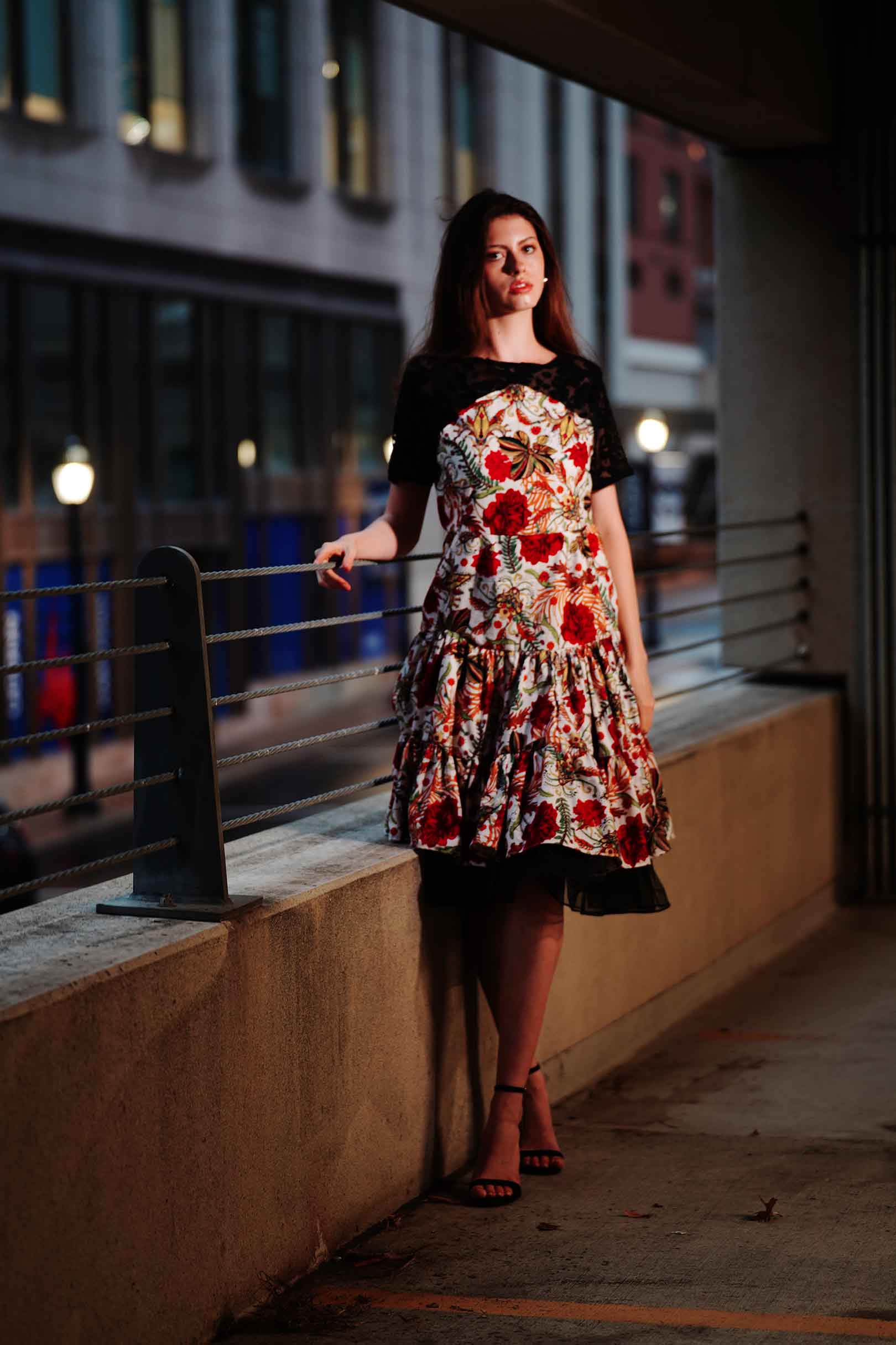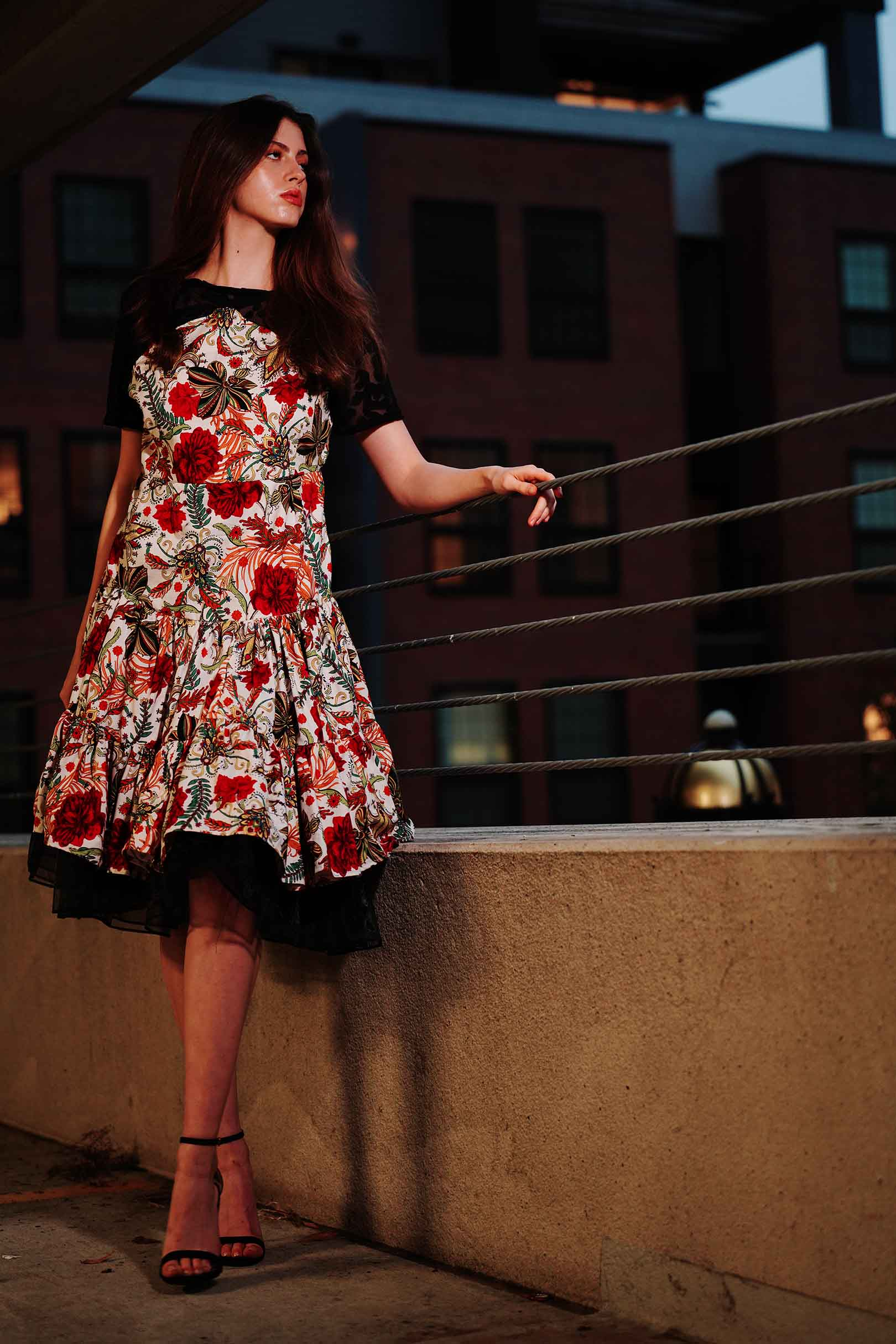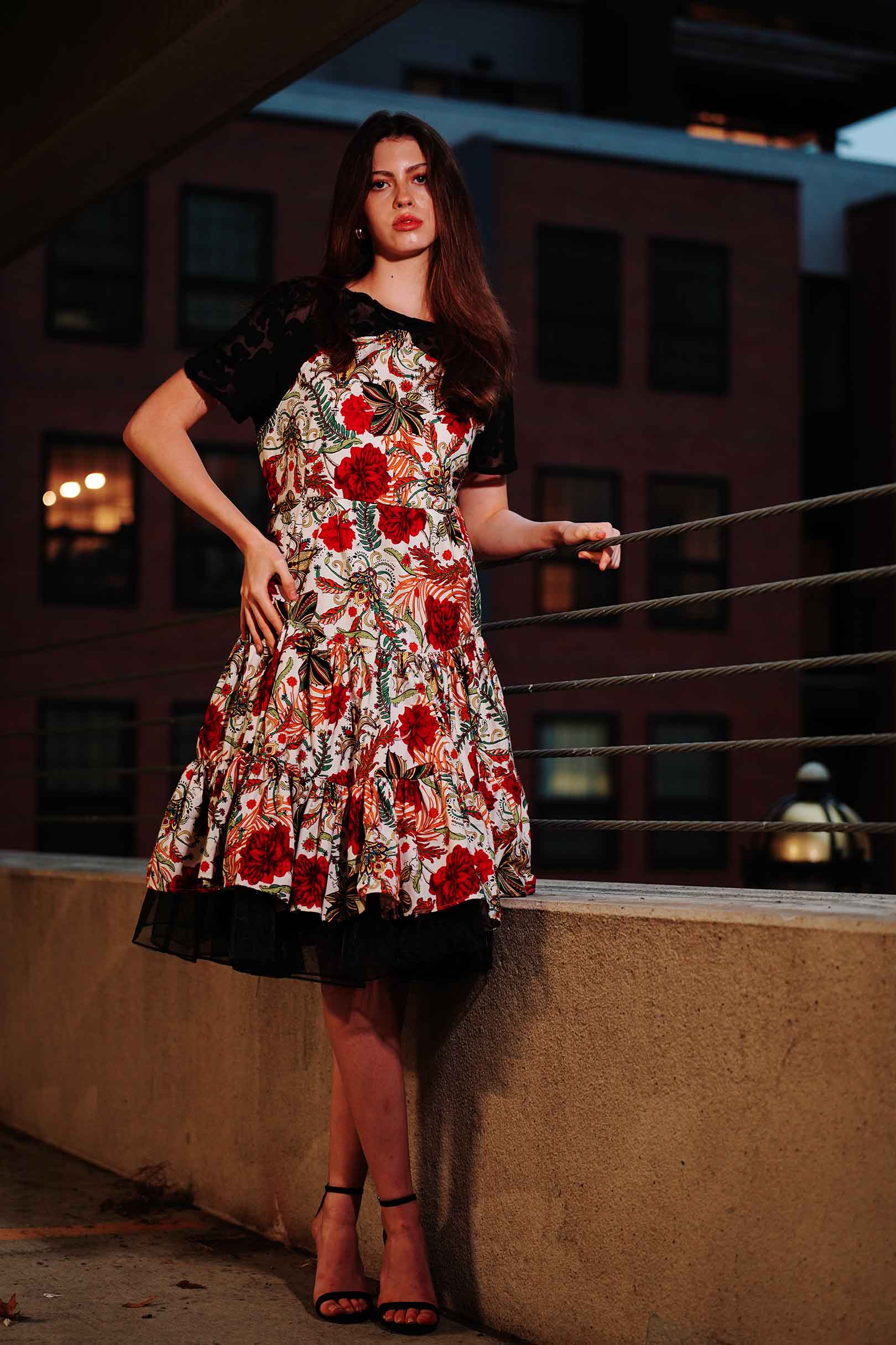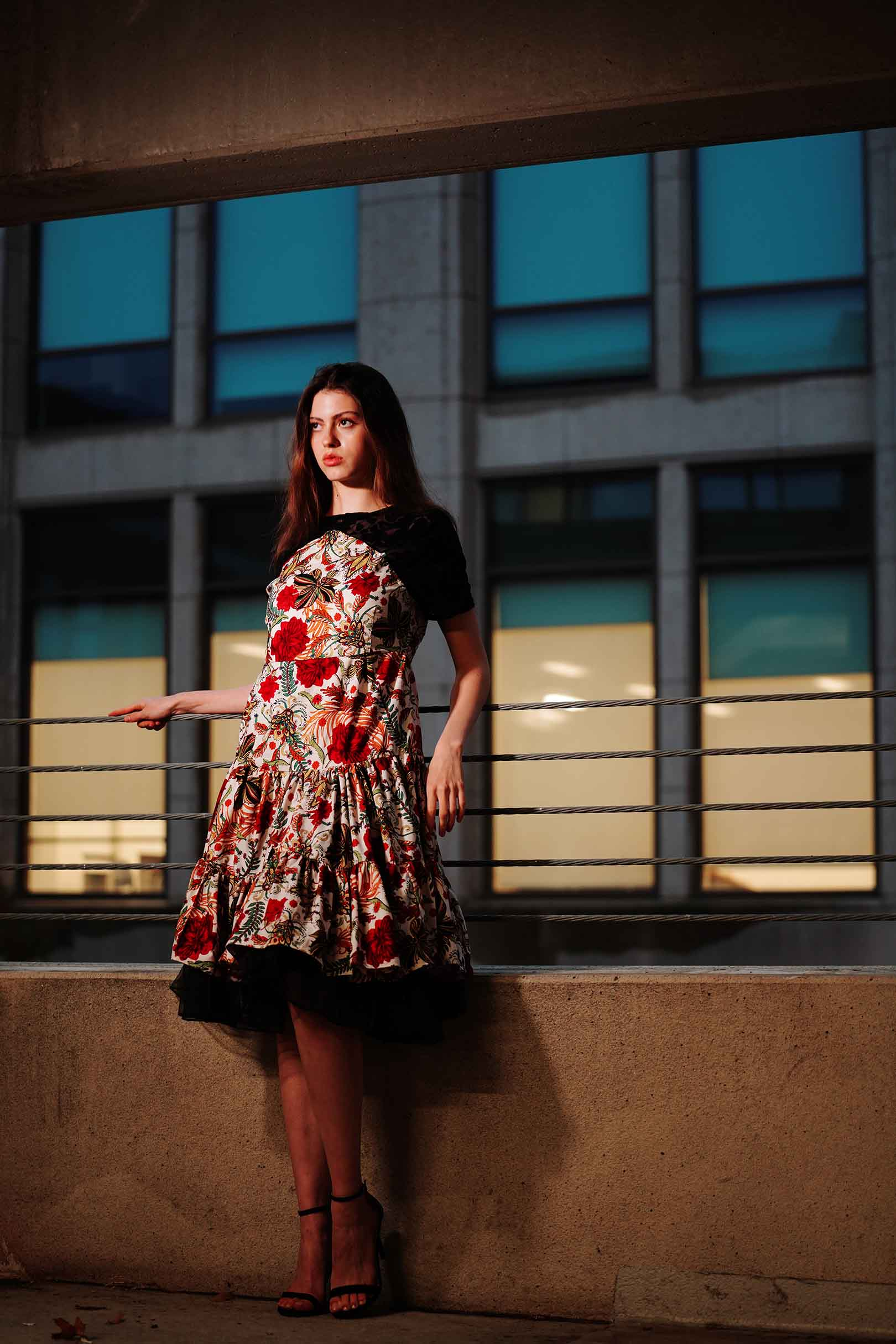 Posing against the backdrop of the sterile concrete of a parking garage in Hartford, model Maja Esposito blooms in the scenery by wearing a contrasting floral print from the latest collection created by La’Moo Designs Bertha Angelo.