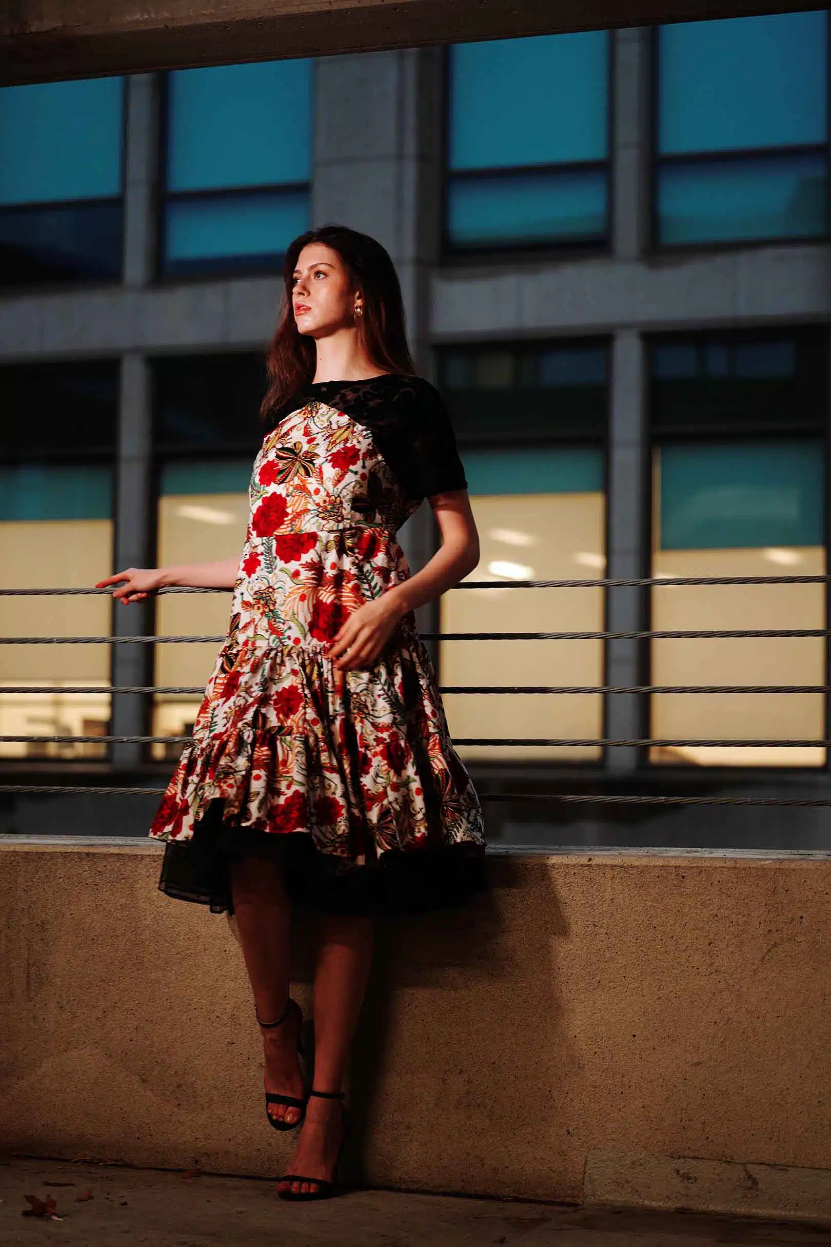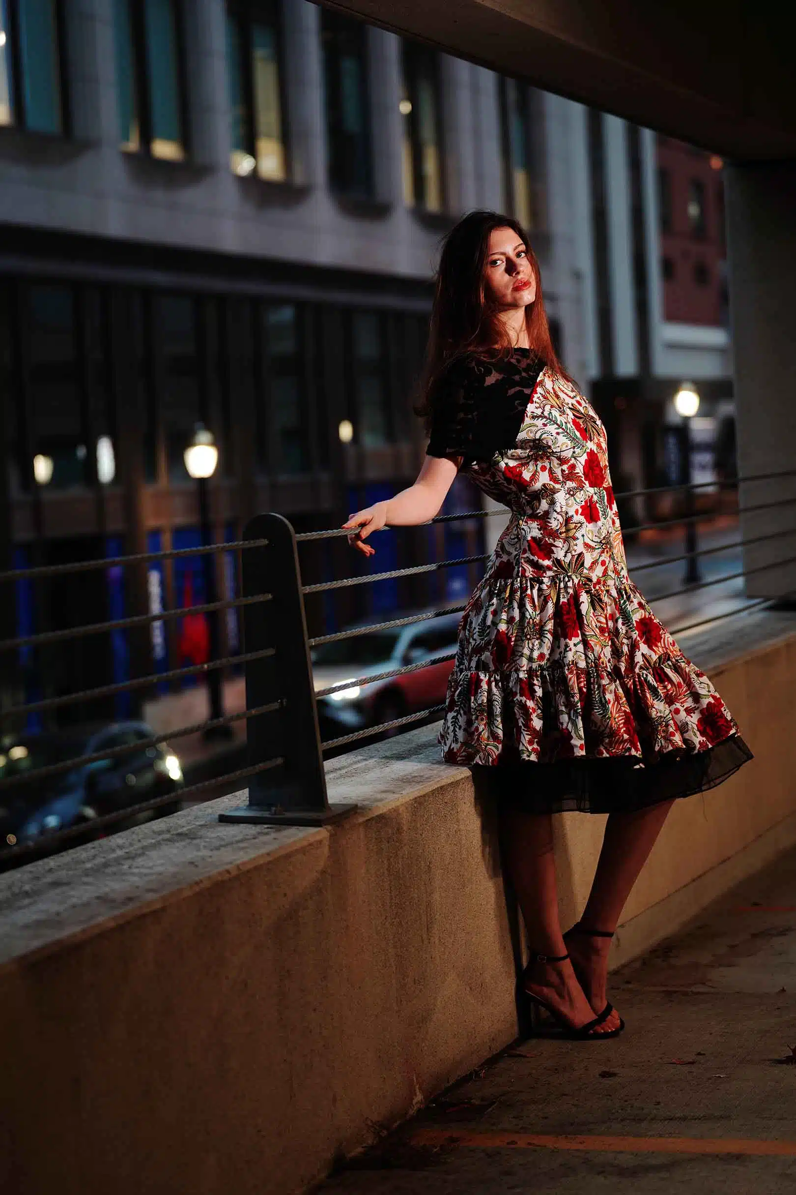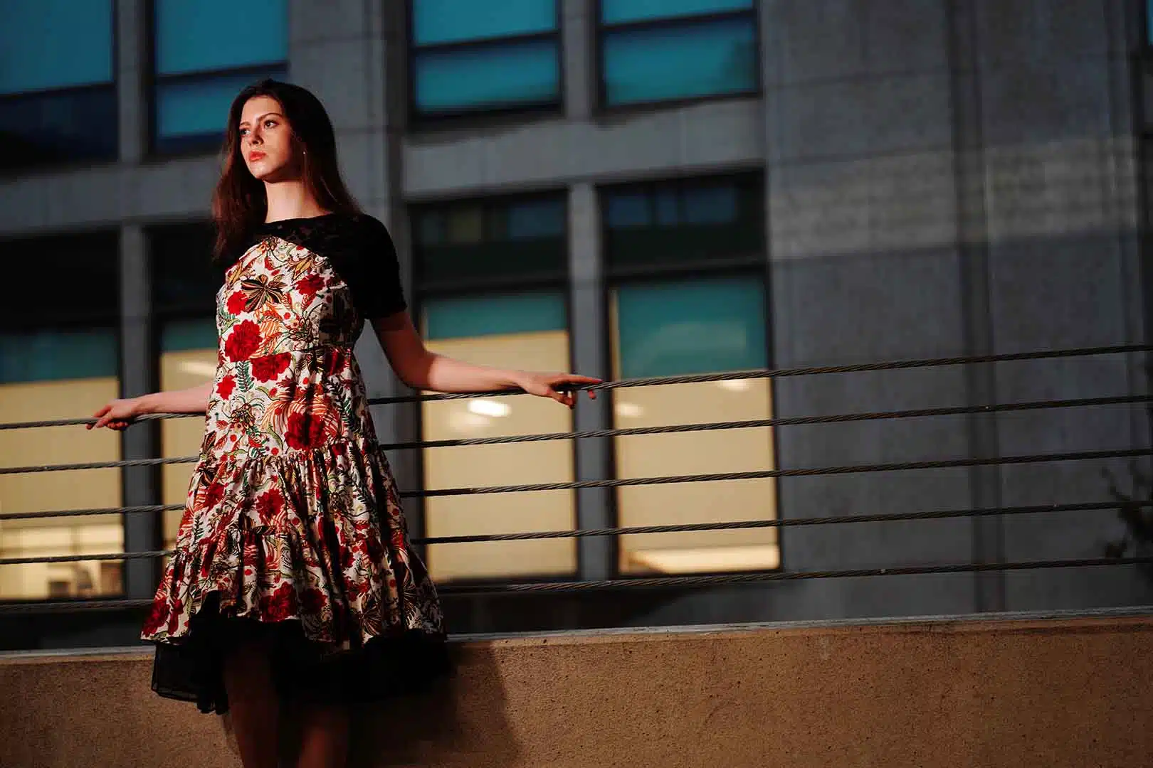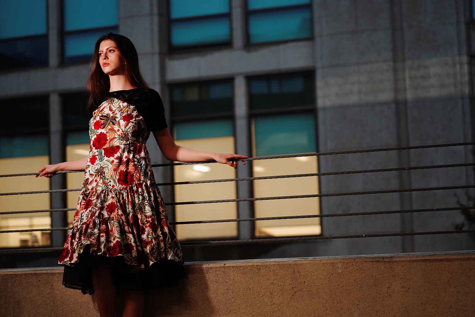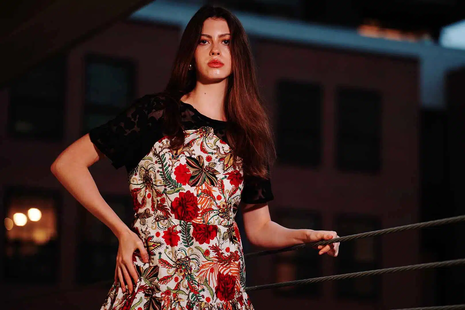 Posing against the backdrop of the sterile concrete of a parking garage in Hartford, model Maja Esposito blooms in the scenery by wearing a contrasting floral print from the latest collection created by La’Moo Designs Bertha Angelo.