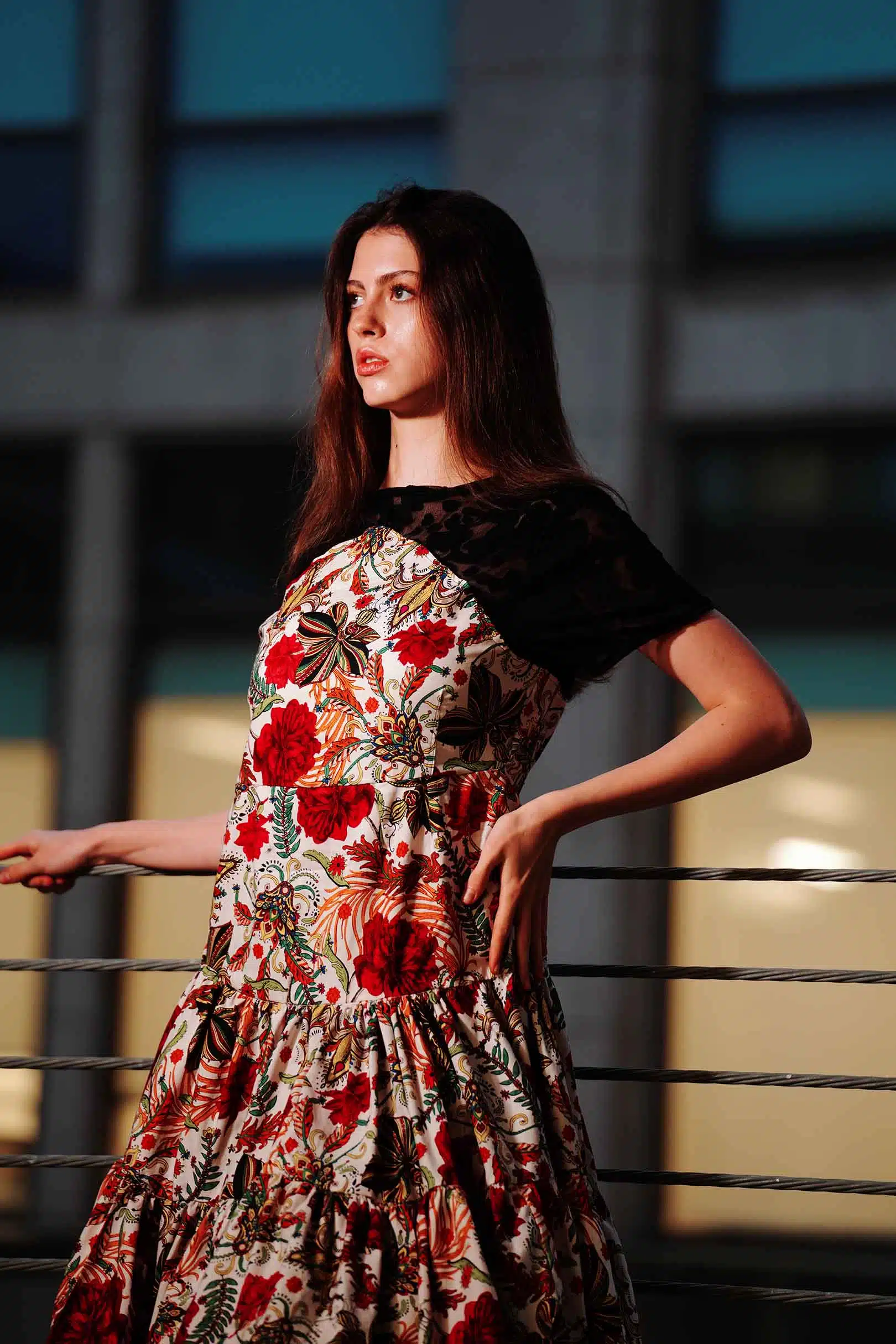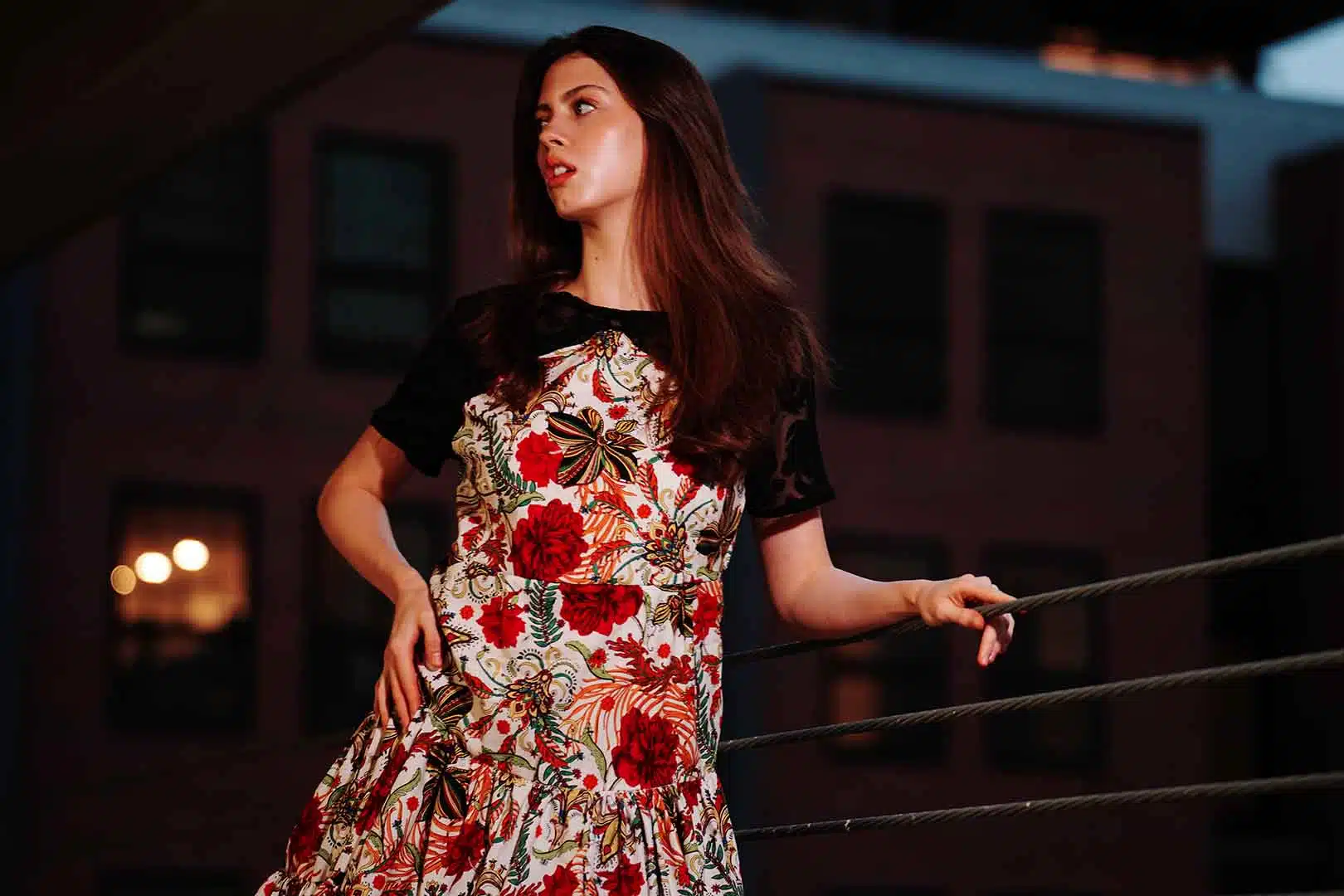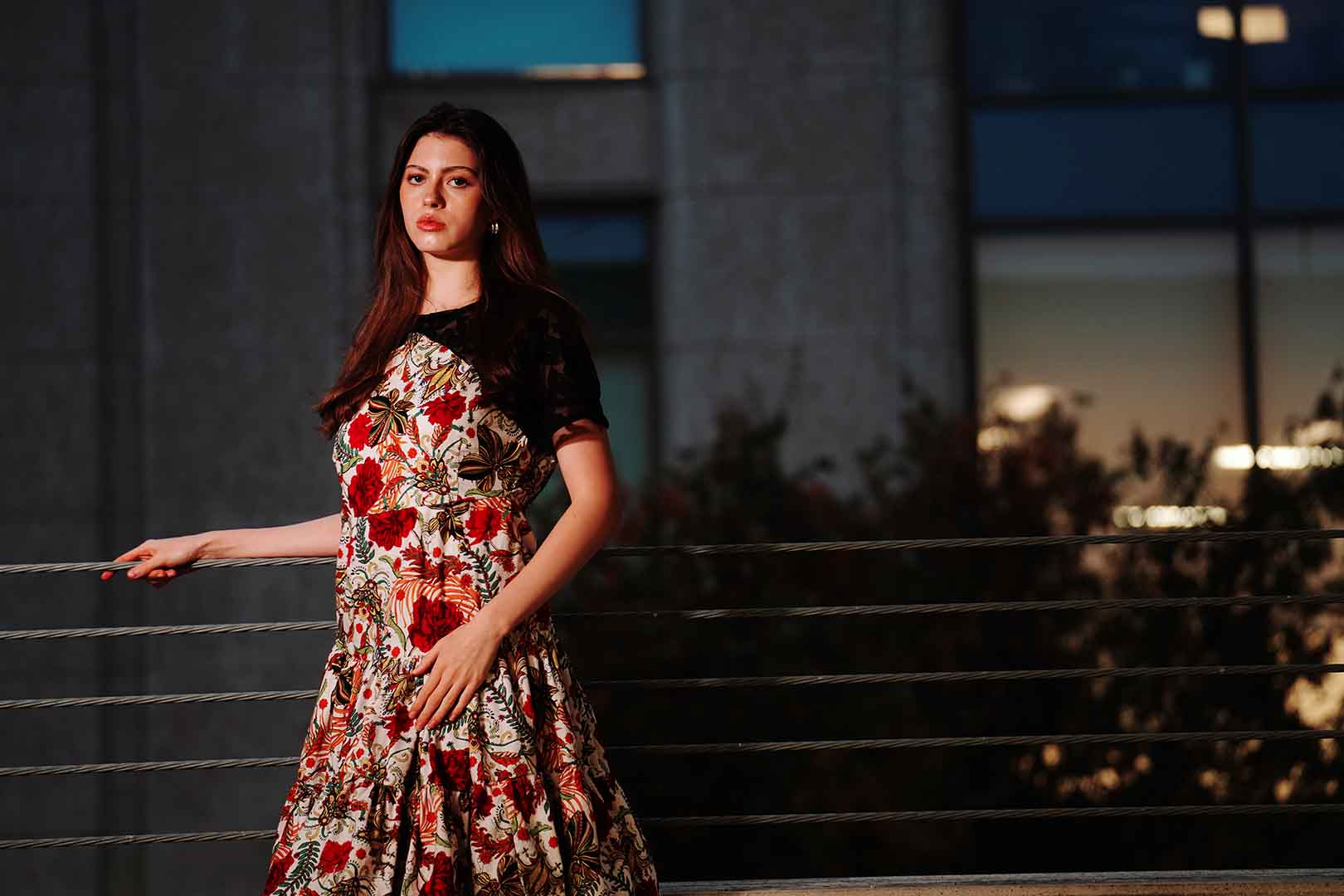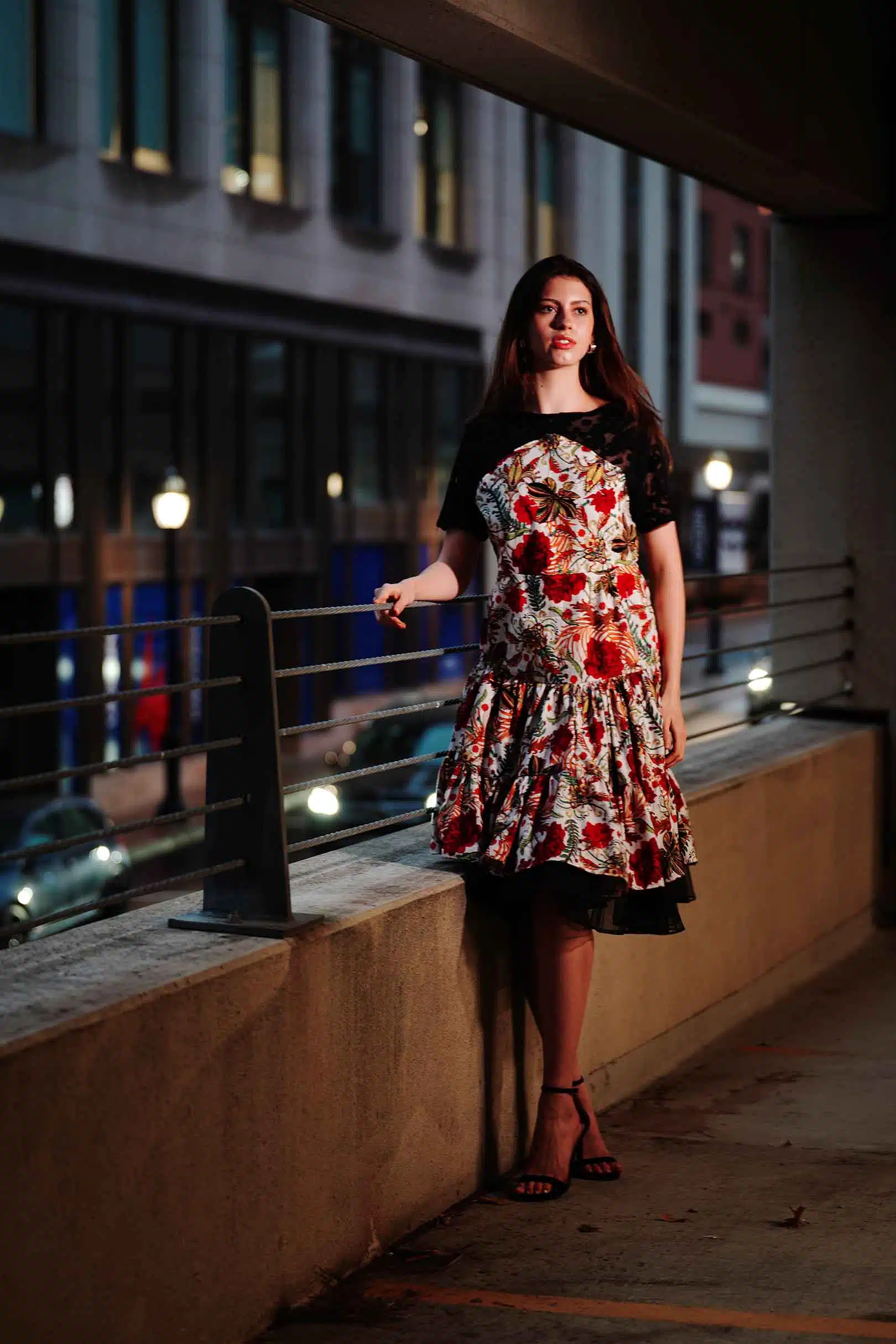 Posing against the backdrop of the sterile concrete of a parking garage in Hartford, model Maja Esposito blooms in the scenery by wearing a contrasting floral print from the latest collection created by La’Moo Designs Bertha Angelo.