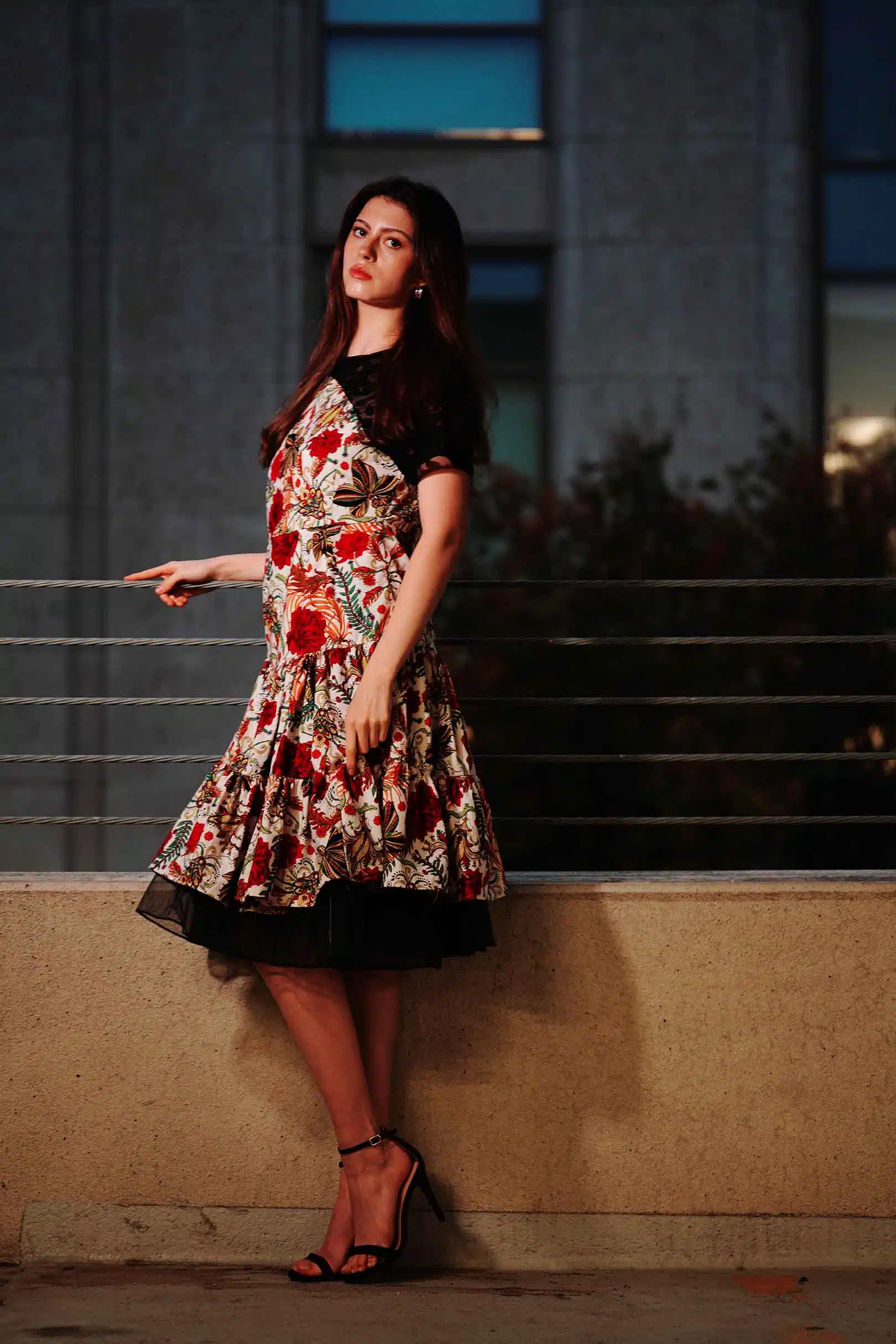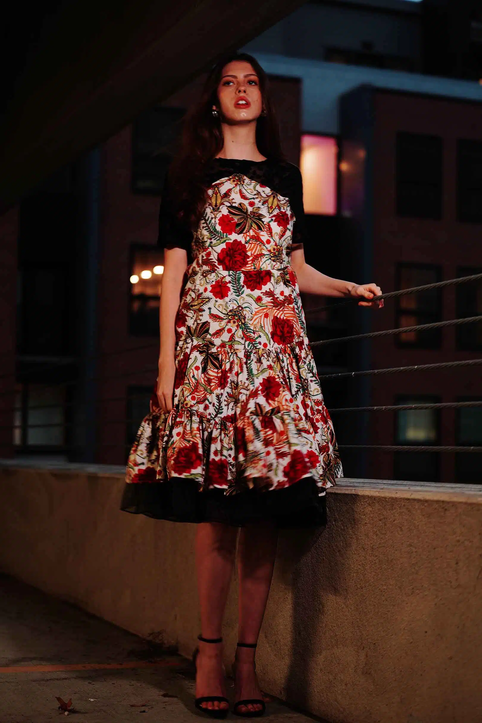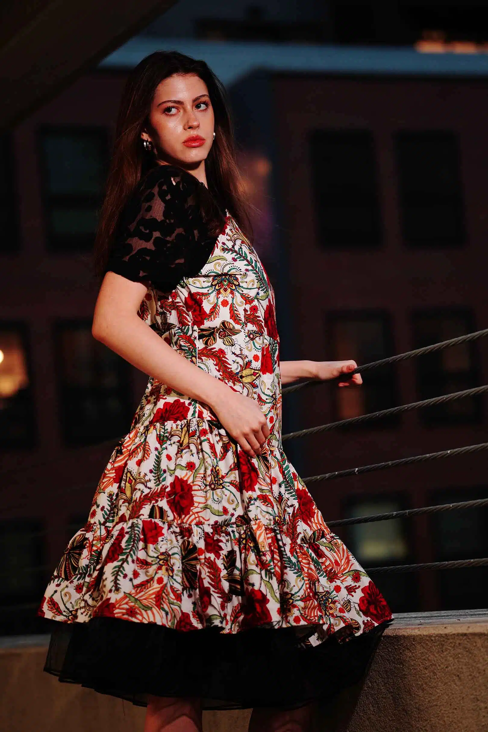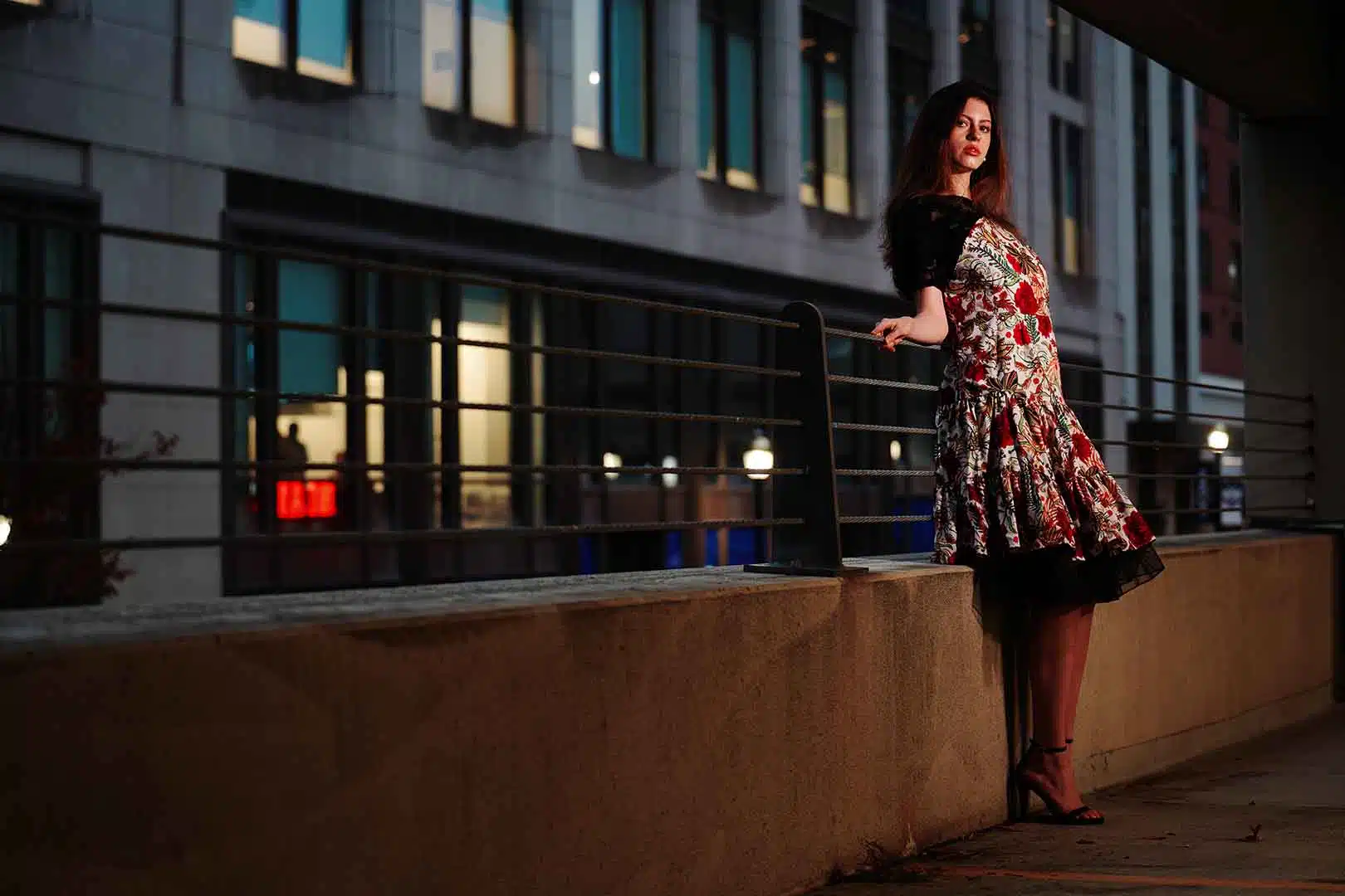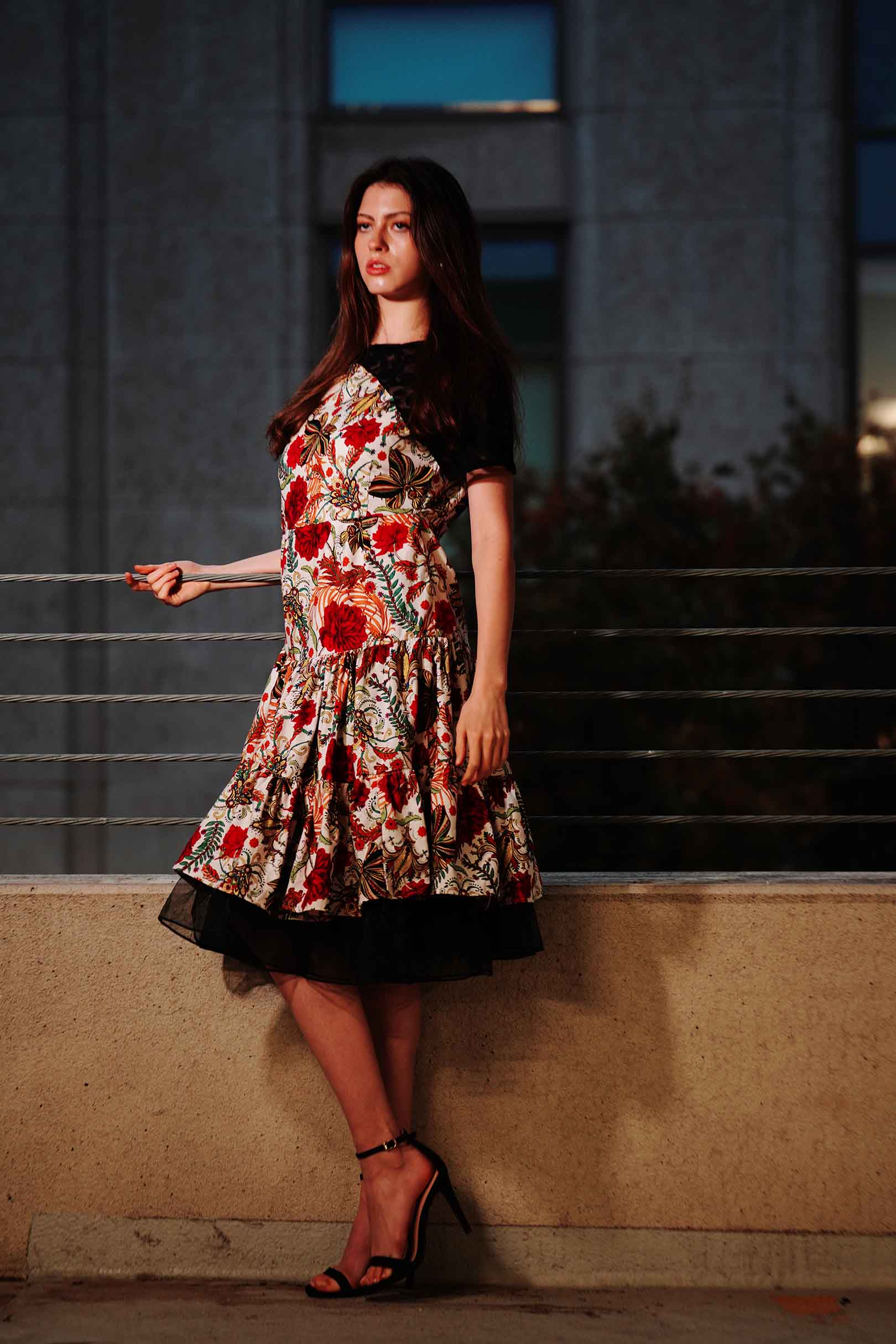 Posing against the backdrop of the sterile concrete of a parking garage in Hartford, model Maja Esposito blooms in the scenery by wearing a contrasting floral print from the latest collection created by La’Moo Designs Bertha Angelo.
