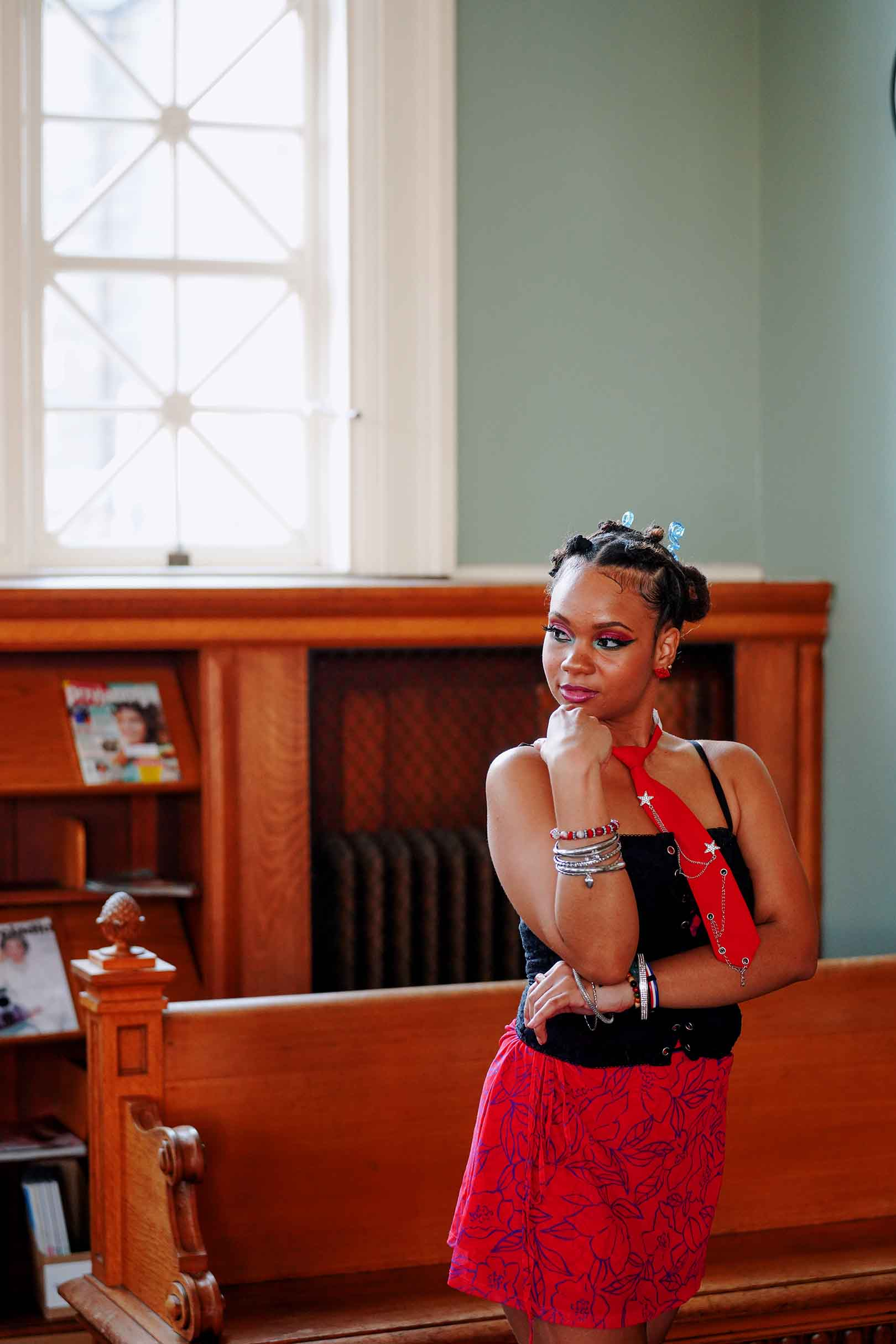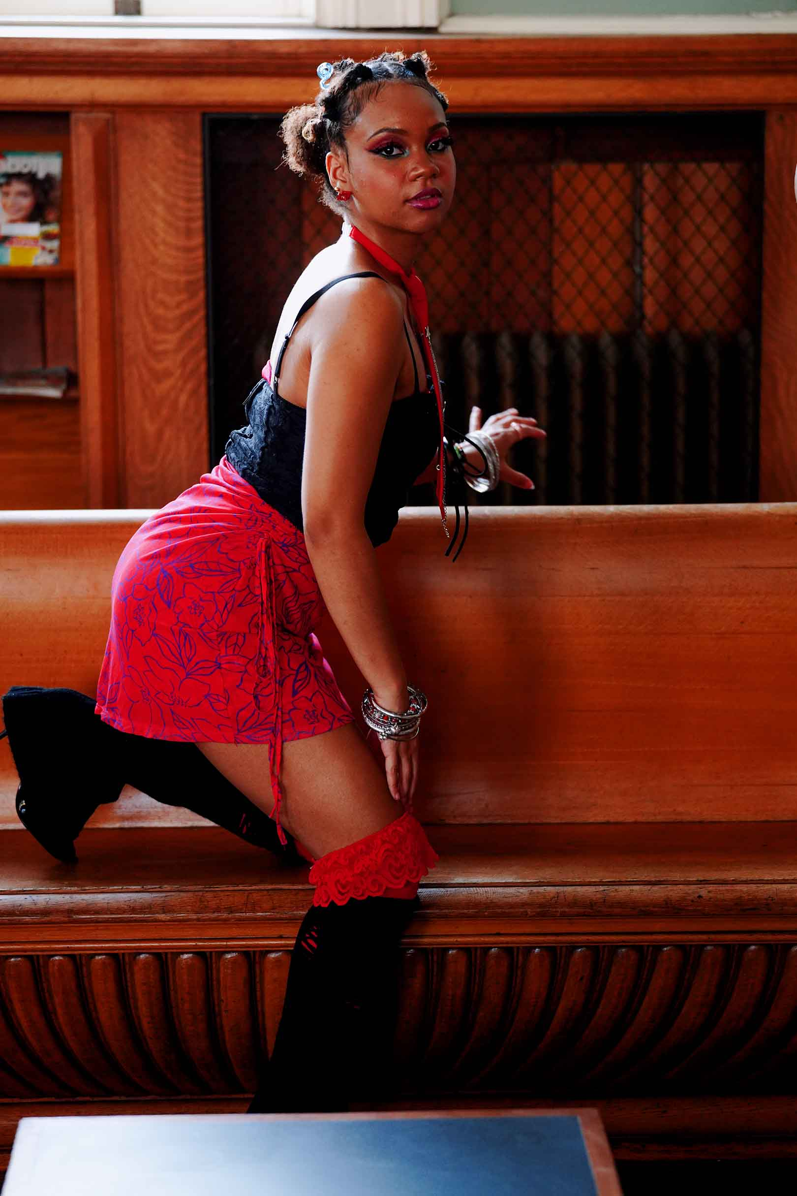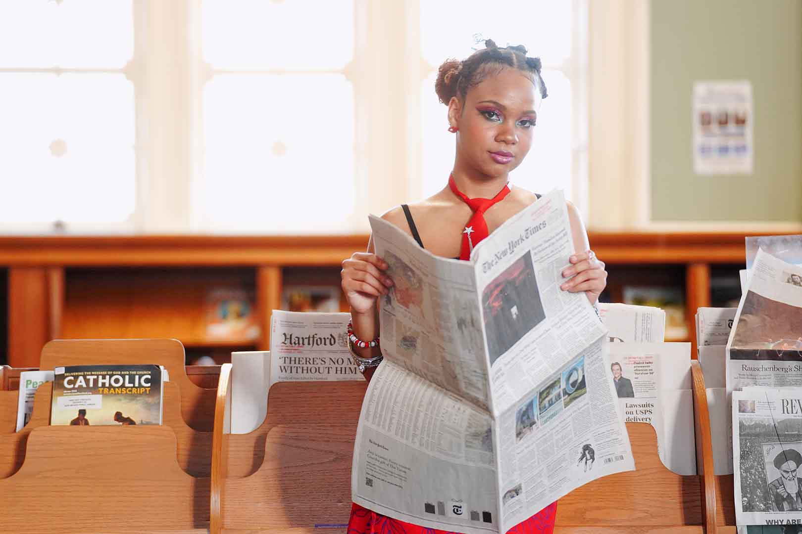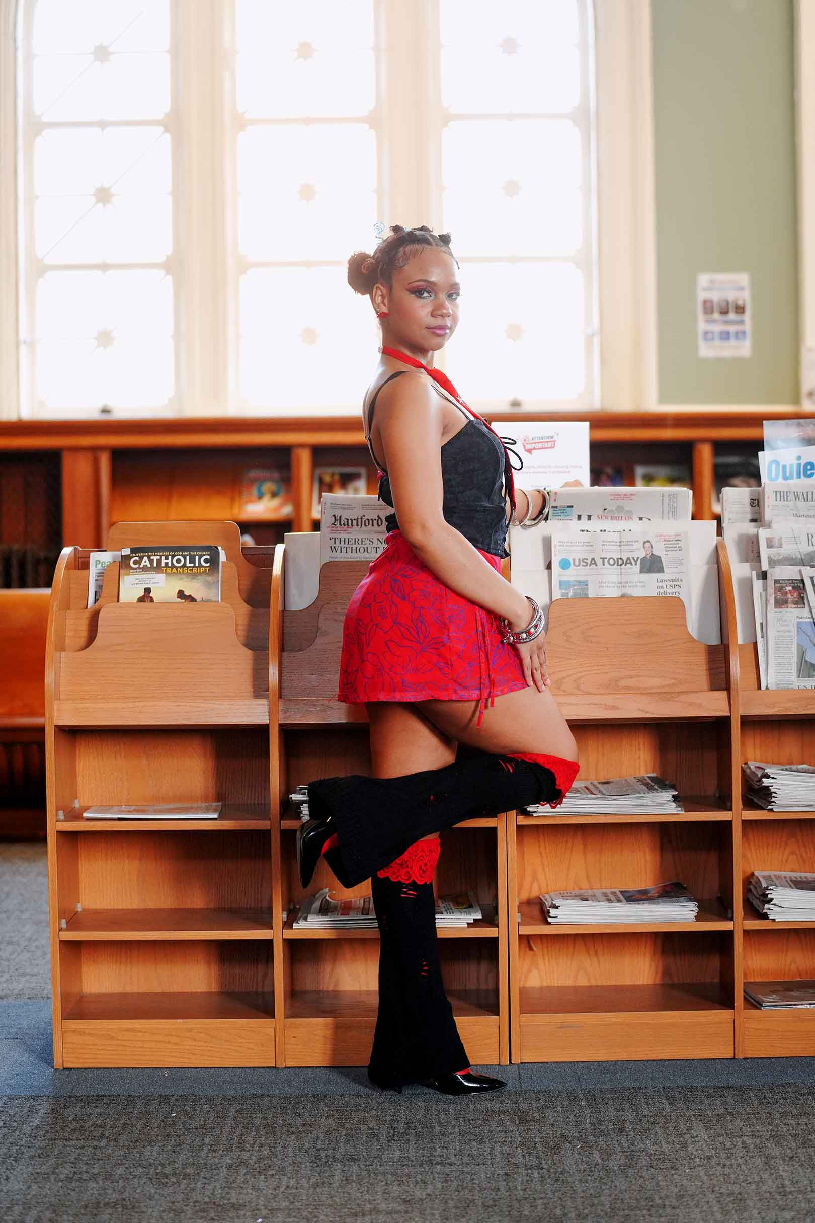 In this fashion editorial, model Jusma takes advantage of the moments after a fashion show by Gorgy By Candy to take some editorial shots in the designer’s garments inside the historic New Britain Public Library.