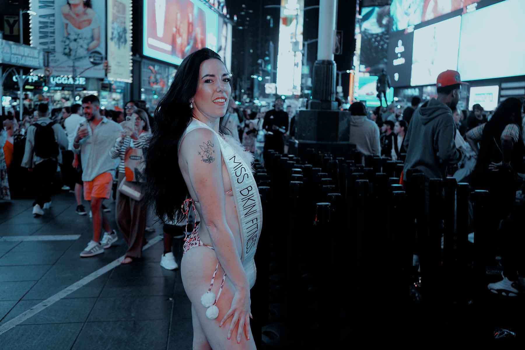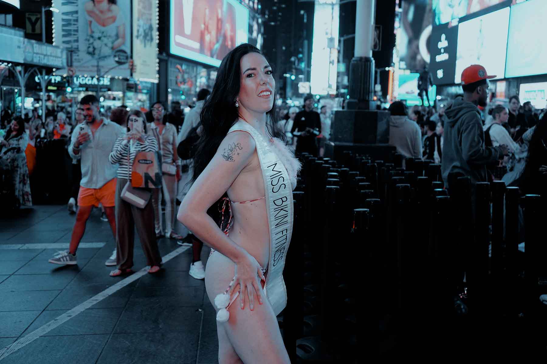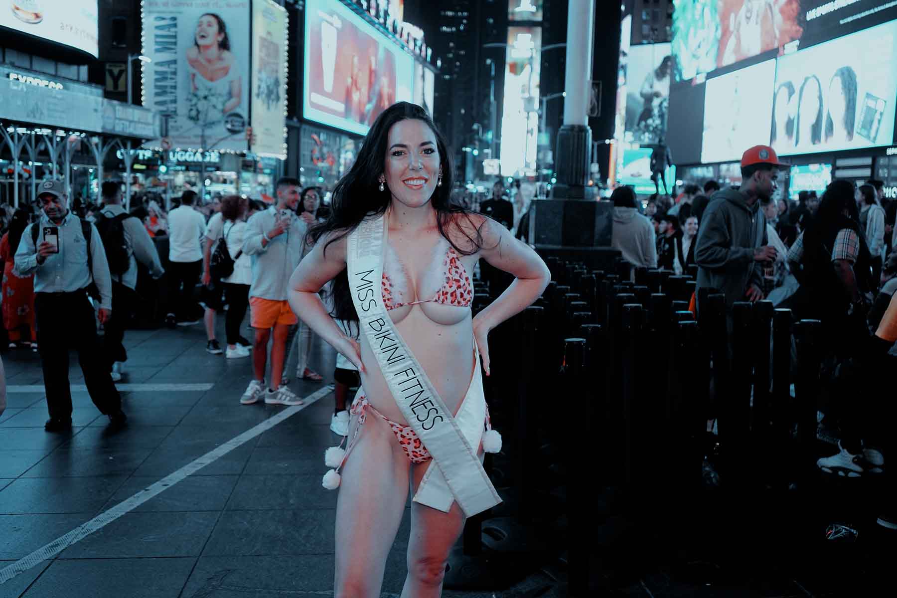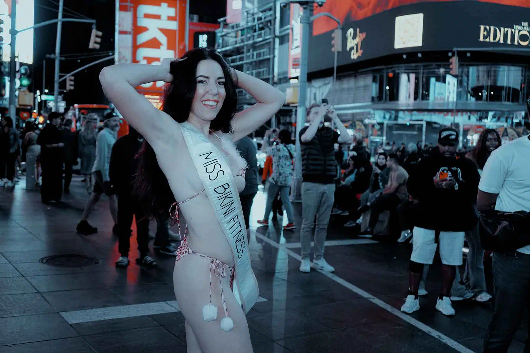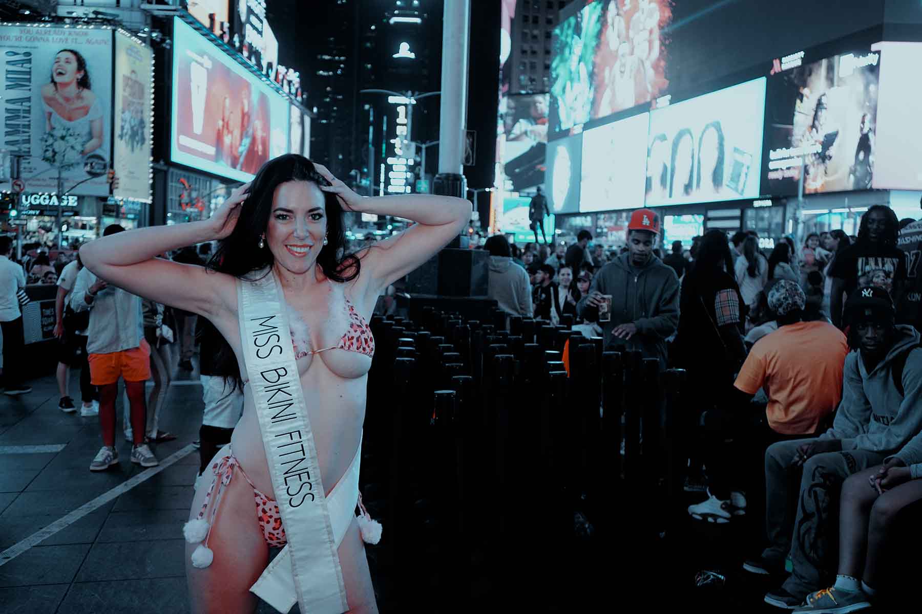 With the lights of Times Square to illuminate her — and dozens of cellphone cameras directed her way– Miss Bikini Fitness Katie Quintana of Arizona flipped on her starpower switch and worked the poses for the camera in this fashion editorial taken during New York Fashion Week in New York City.