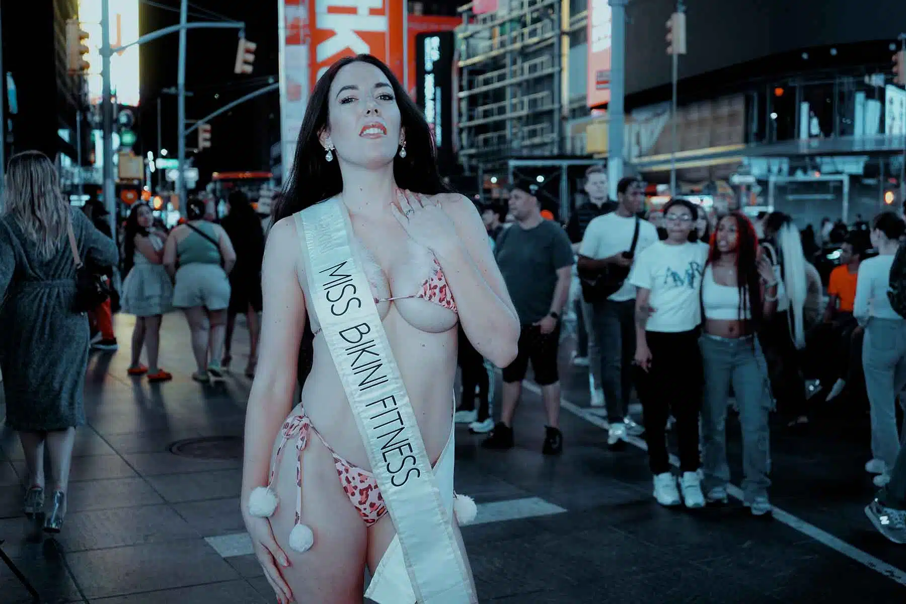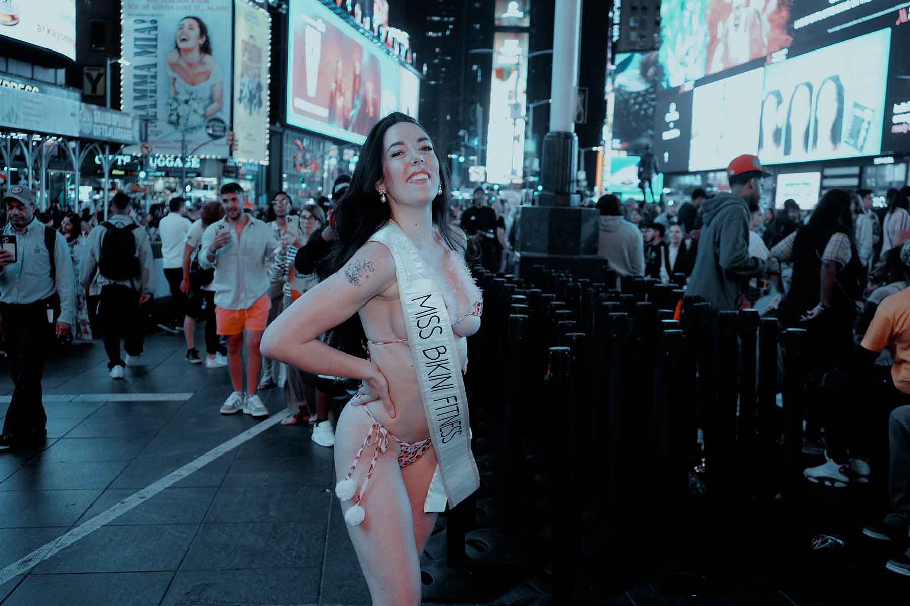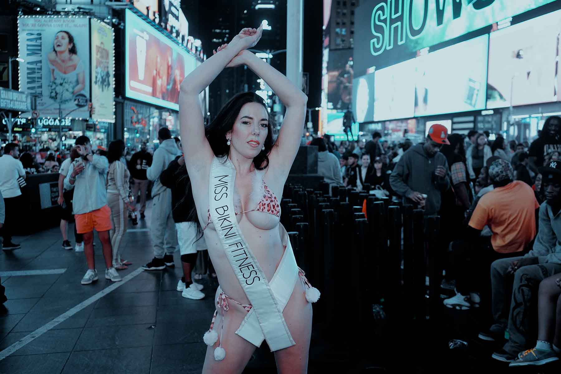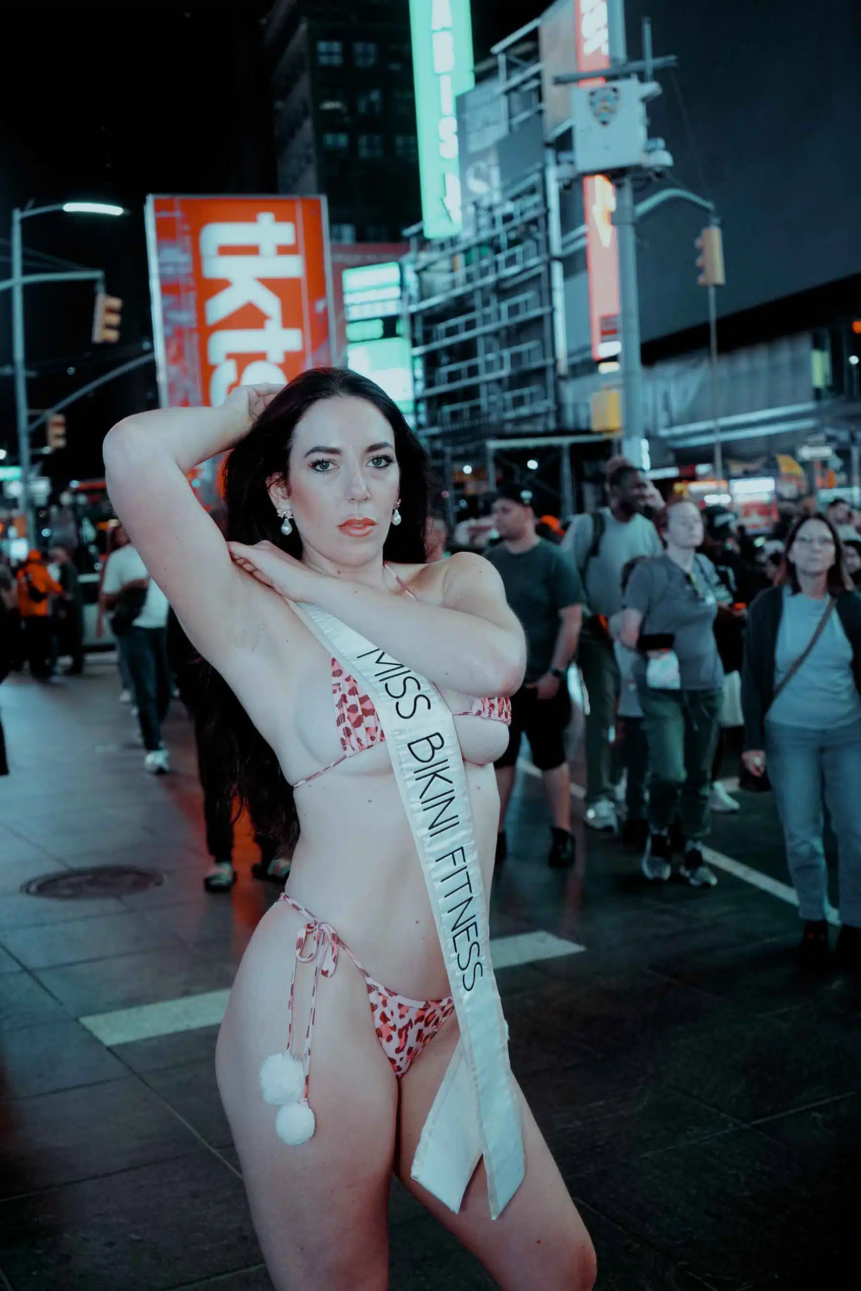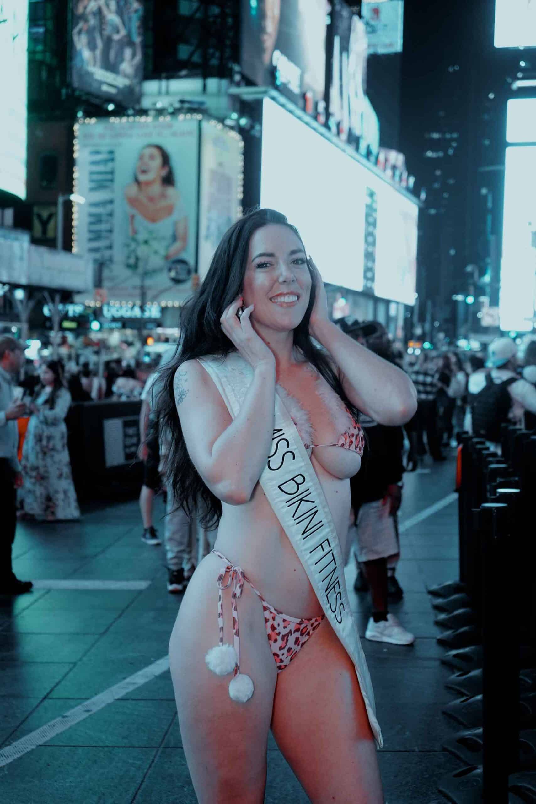 With the lights of Times Square to illuminate her — and dozens of cellphone cameras directed her way– Miss Bikini Fitness Katie Quintana of Arizona flipped on her starpower switch and worked the poses for the camera in this fashion editorial taken during New York Fashion Week in New York City.