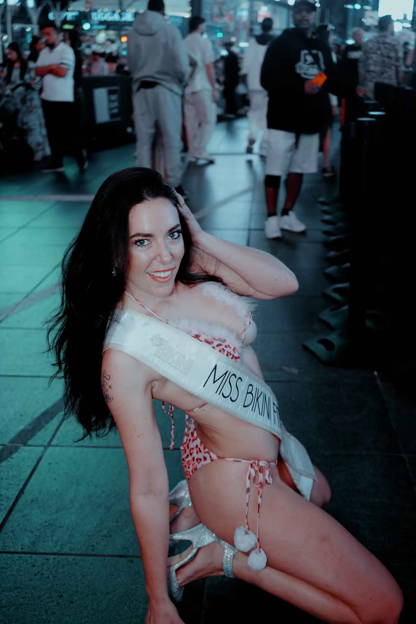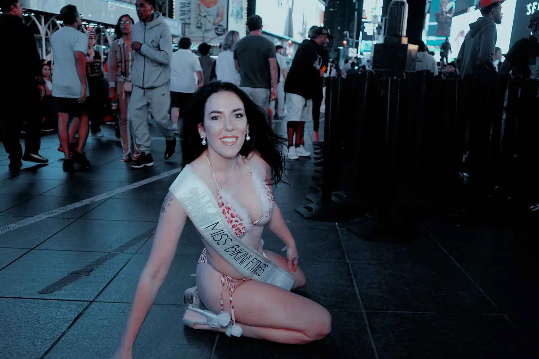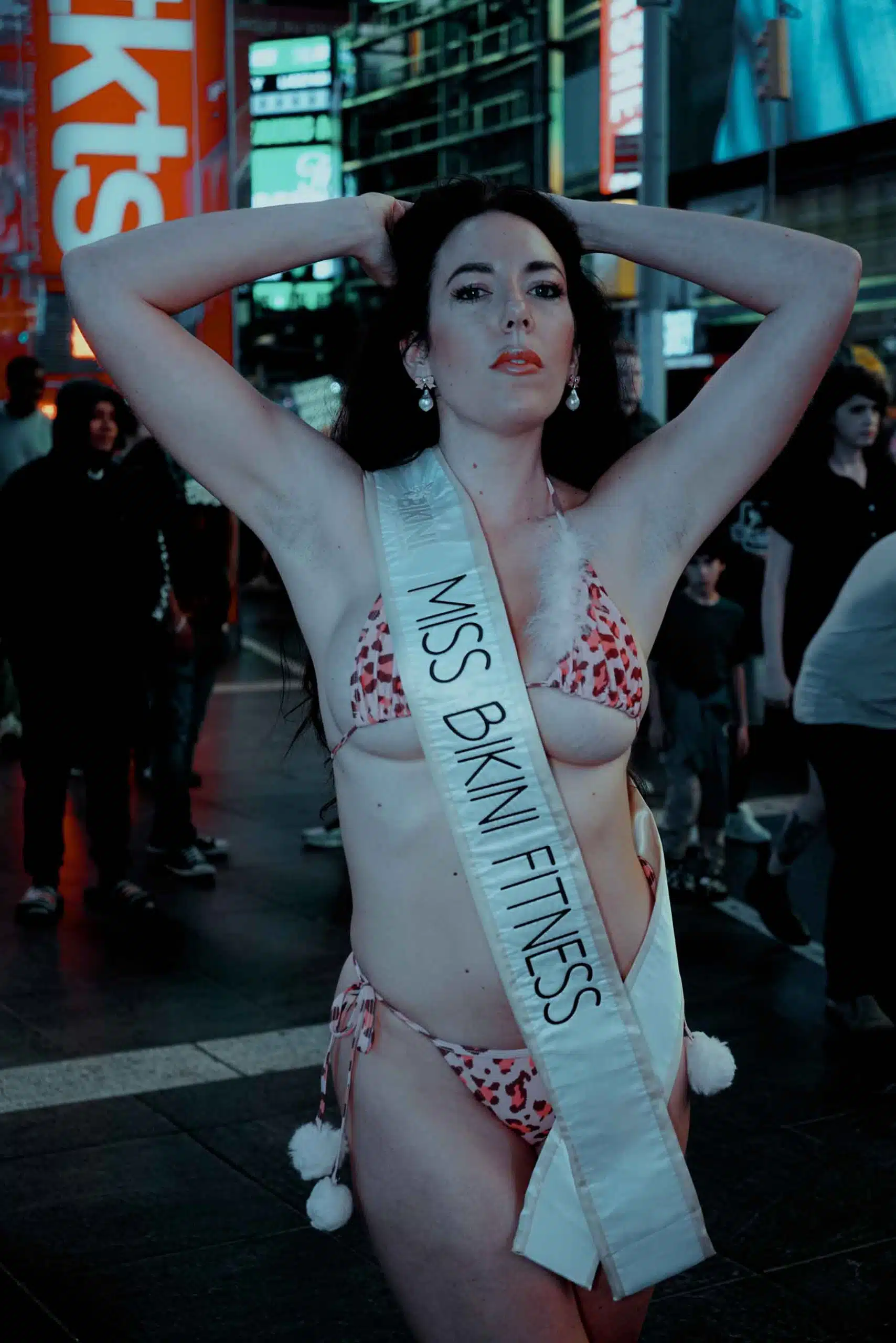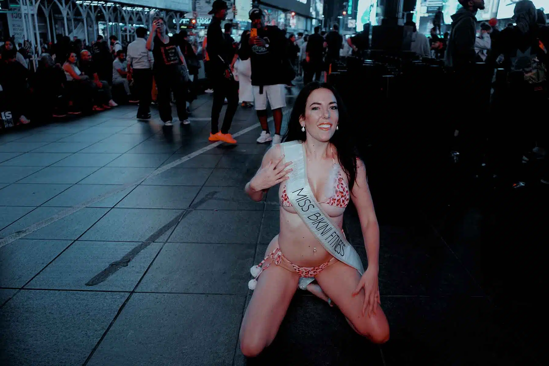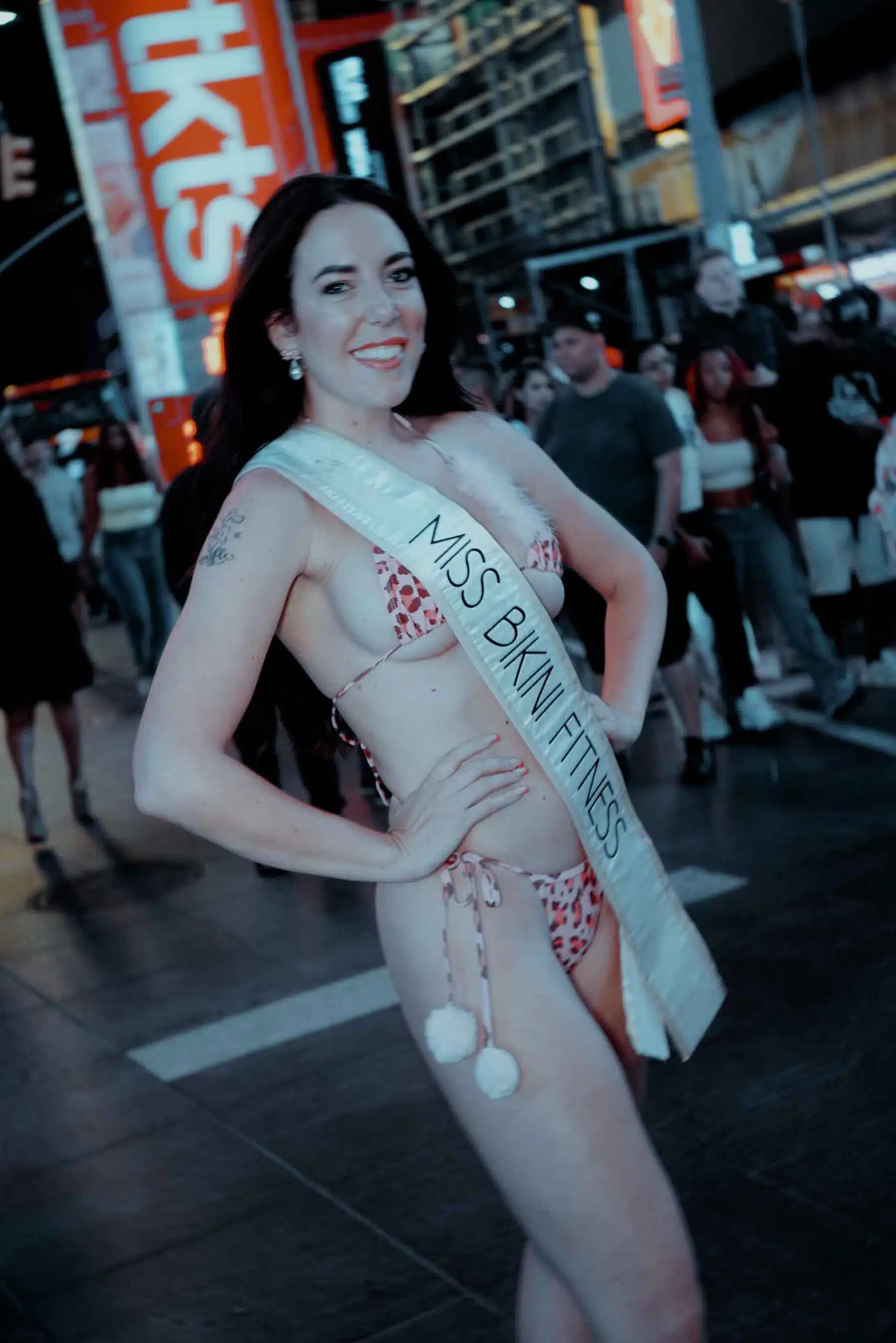With the lights of Times Square to illuminate her — and dozens of cellphone cameras directed her way– Miss Bikini Fitness Katie Quintana of Arizona flipped on her starpower switch and worked the poses for the camera in this fashion editorial taken during New York Fashion Week in New York City.