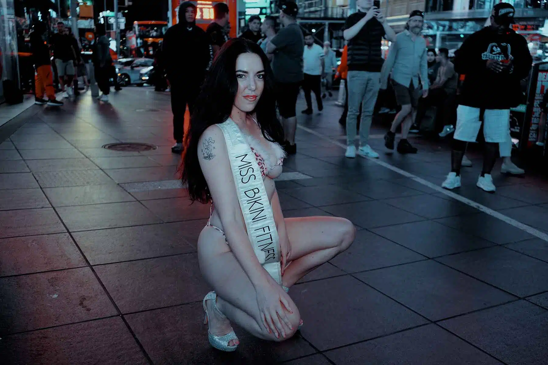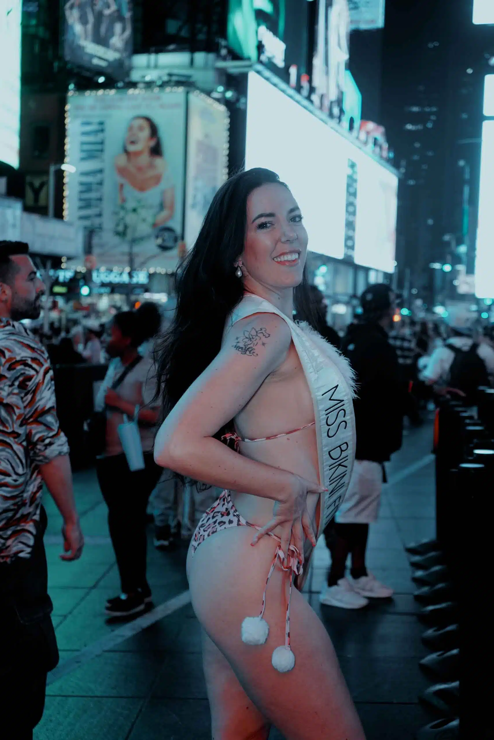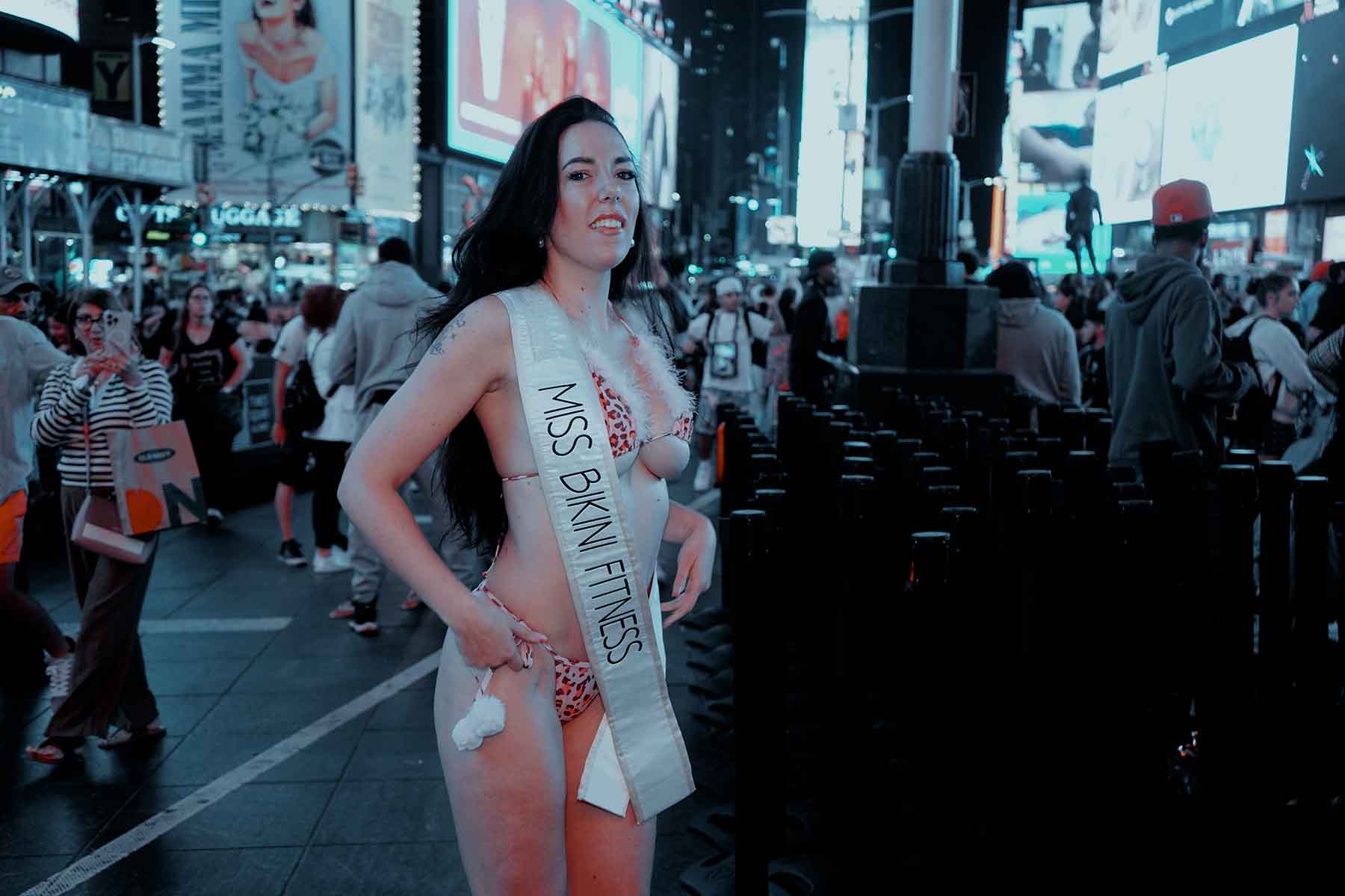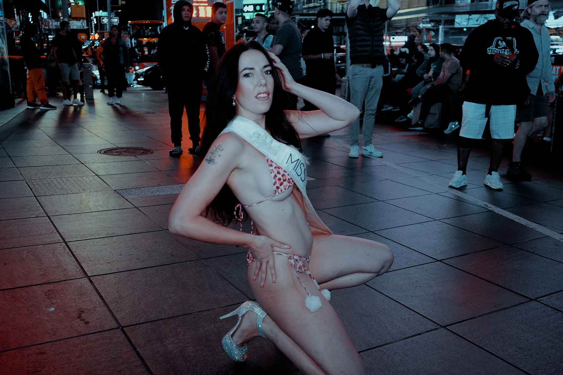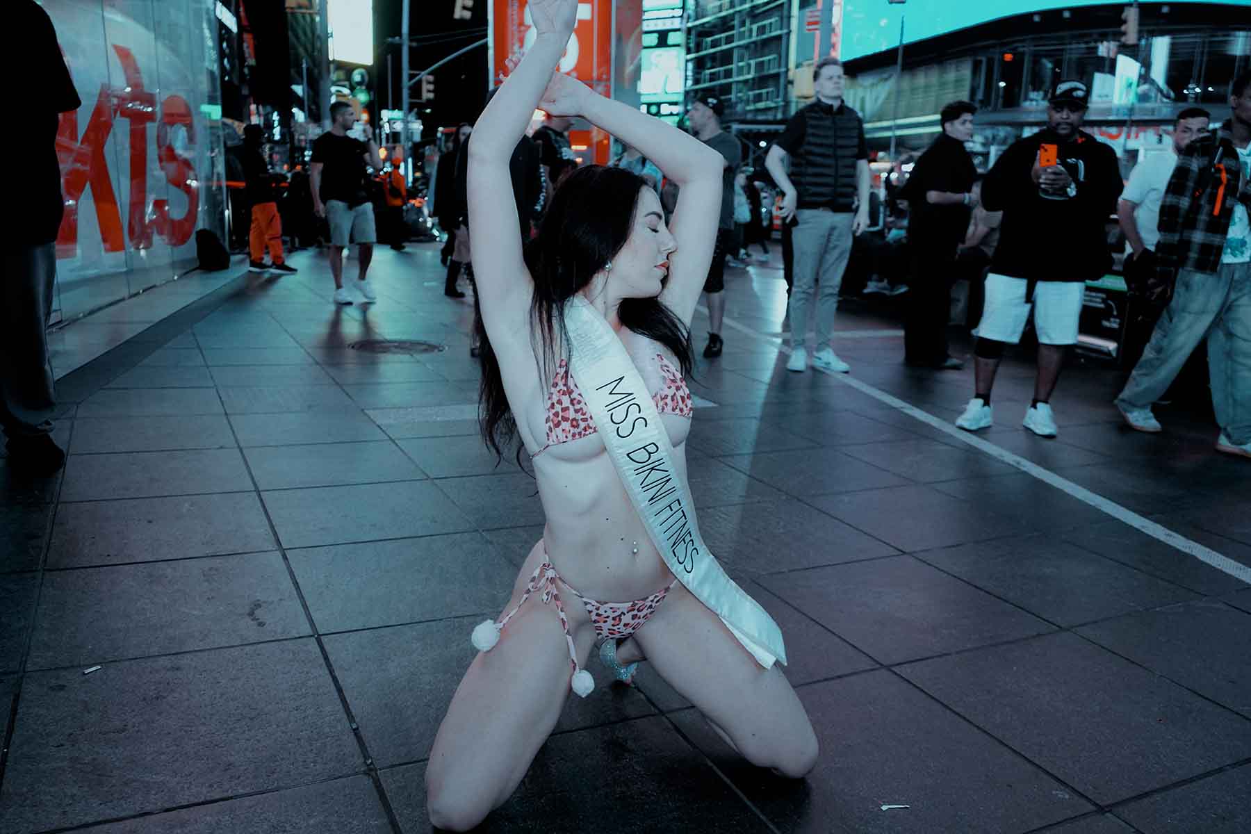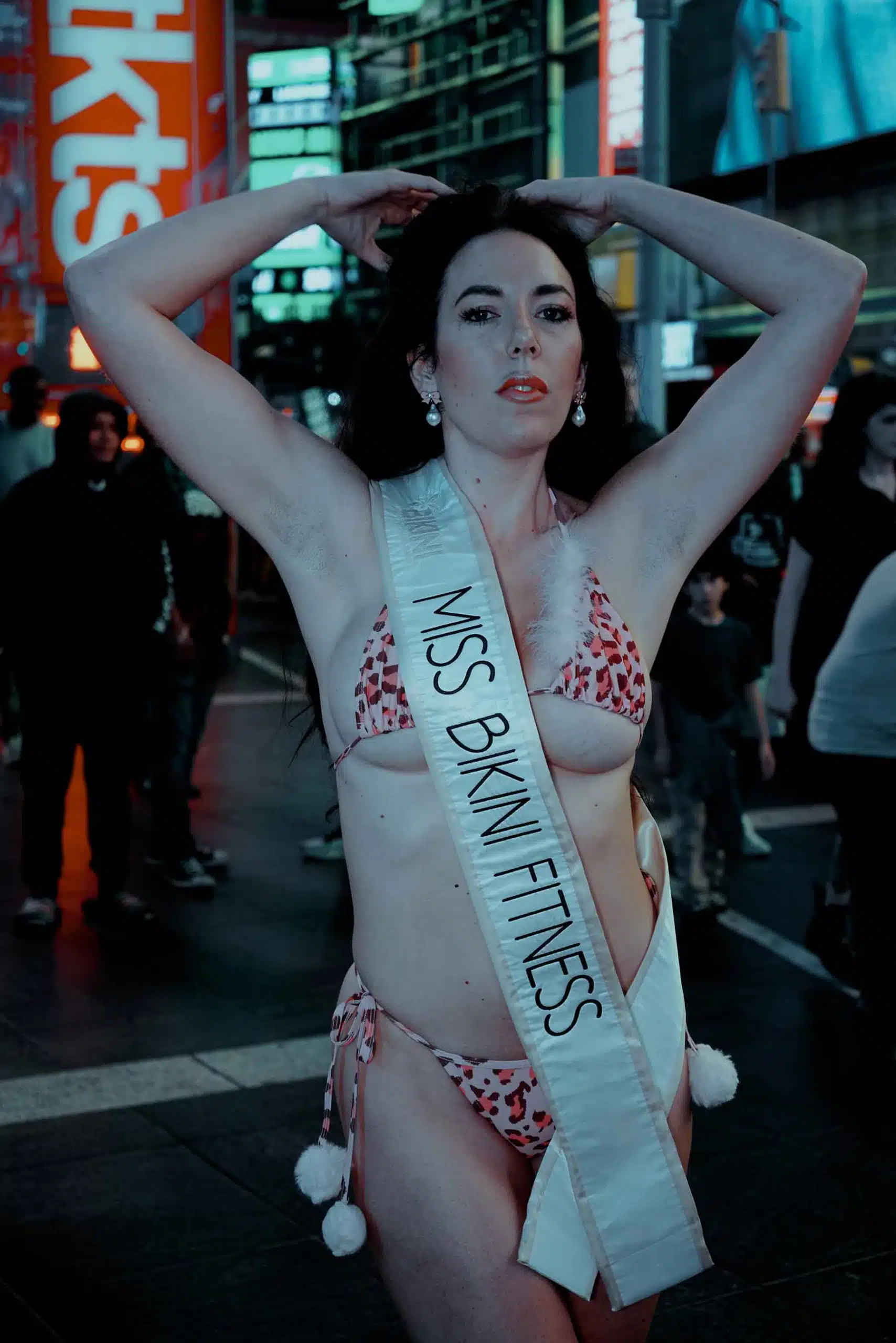 With the lights of Times Square to illuminate her — and dozens of cellphone cameras directed her way– Miss Bikini Fitness Katie Quintana of Arizona flipped on her starpower switch and worked the poses for the camera in this fashion editorial taken during New York Fashion Week in New York City.