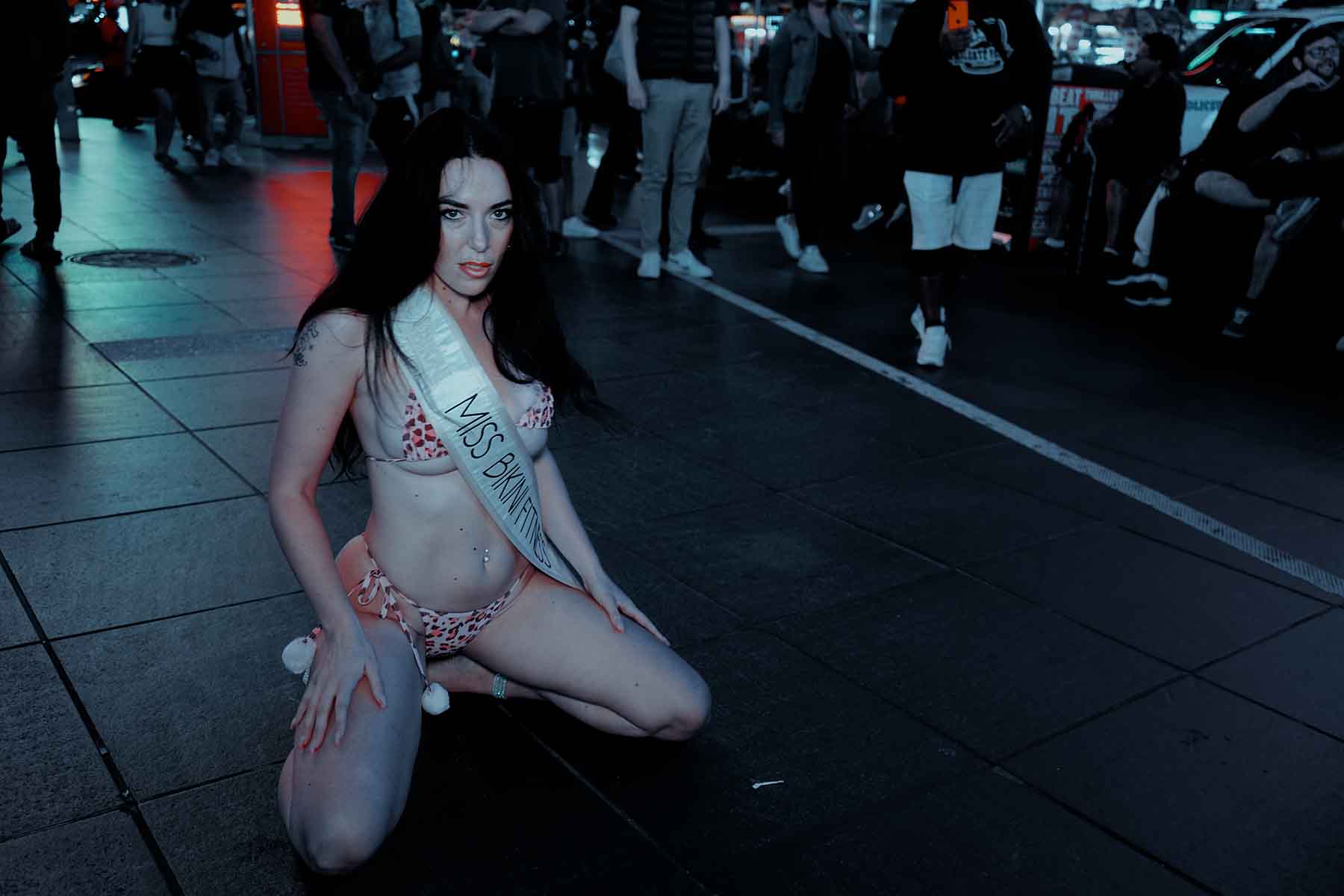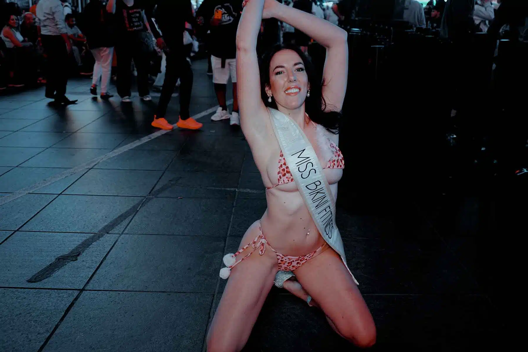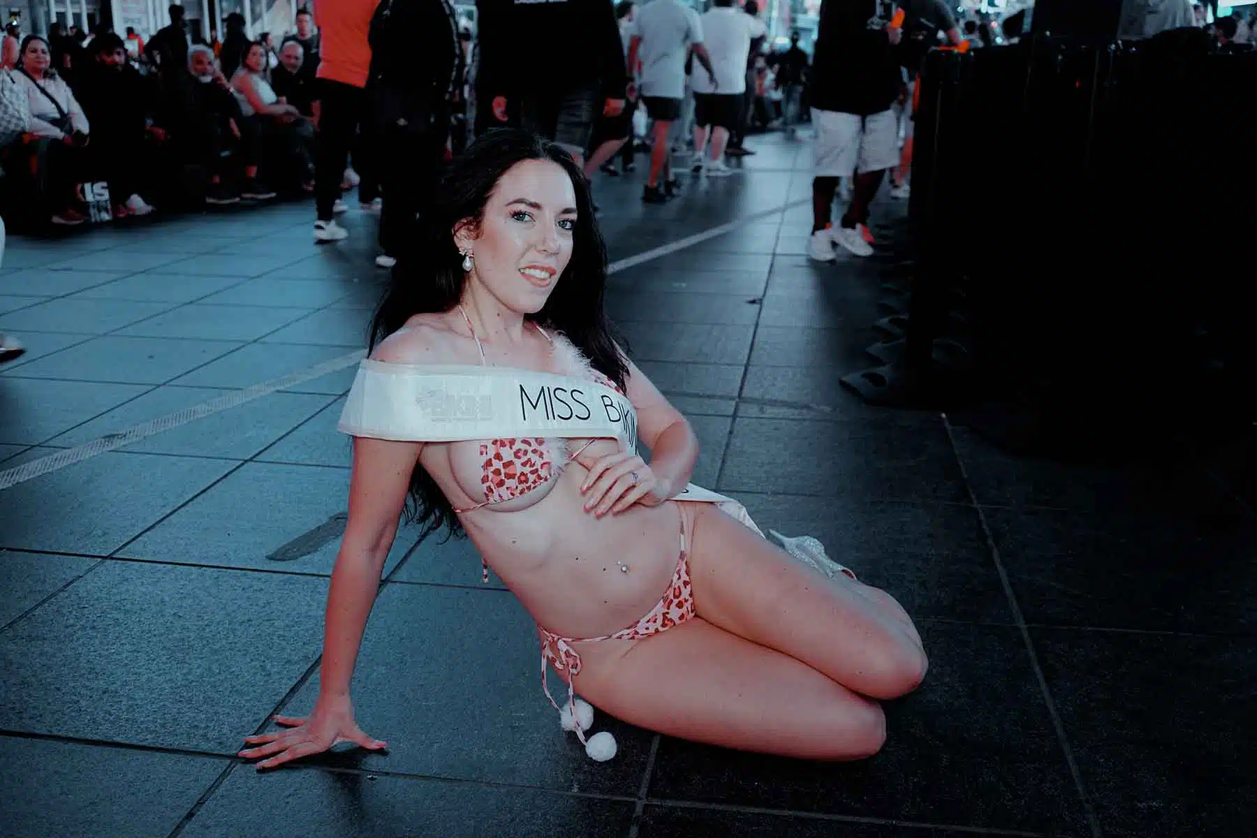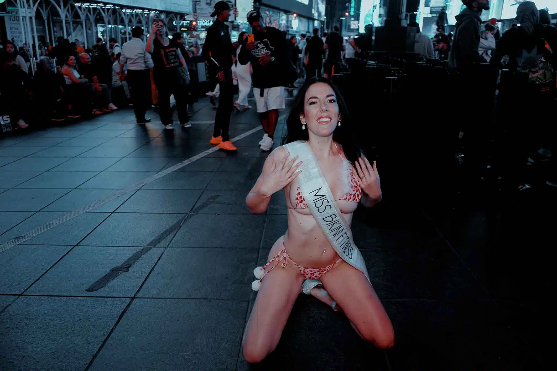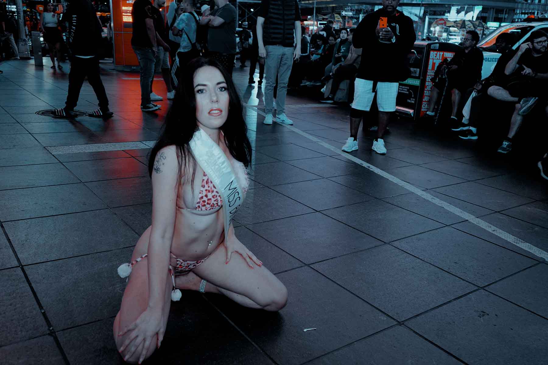 With the lights of Times Square to illuminate her — and dozens of cellphone cameras directed her way– Miss Bikini Fitness Katie Quintana of Arizona flipped on her starpower switch and worked the poses for the camera in this fashion editorial taken during New York Fashion Week in New York City.