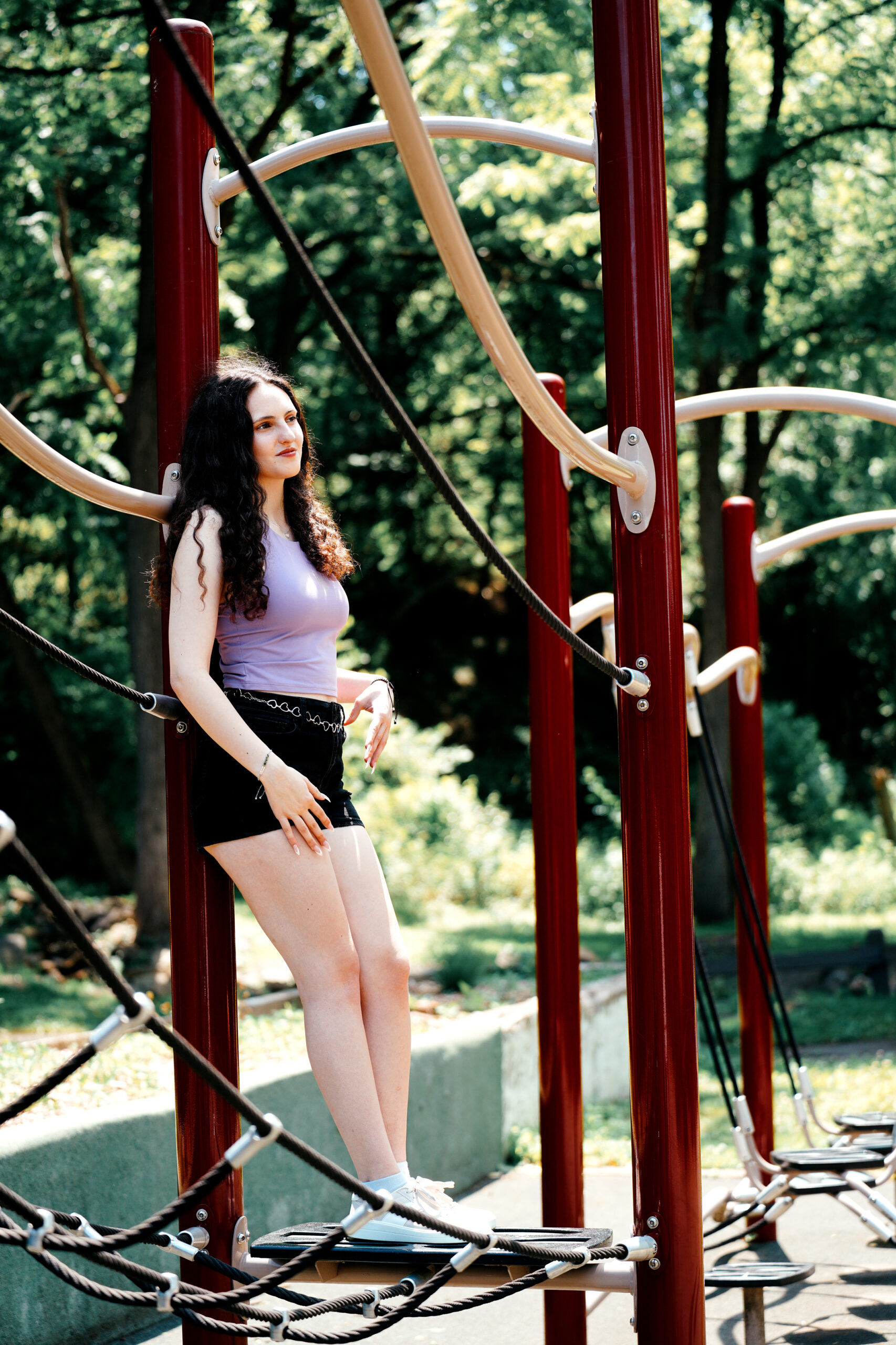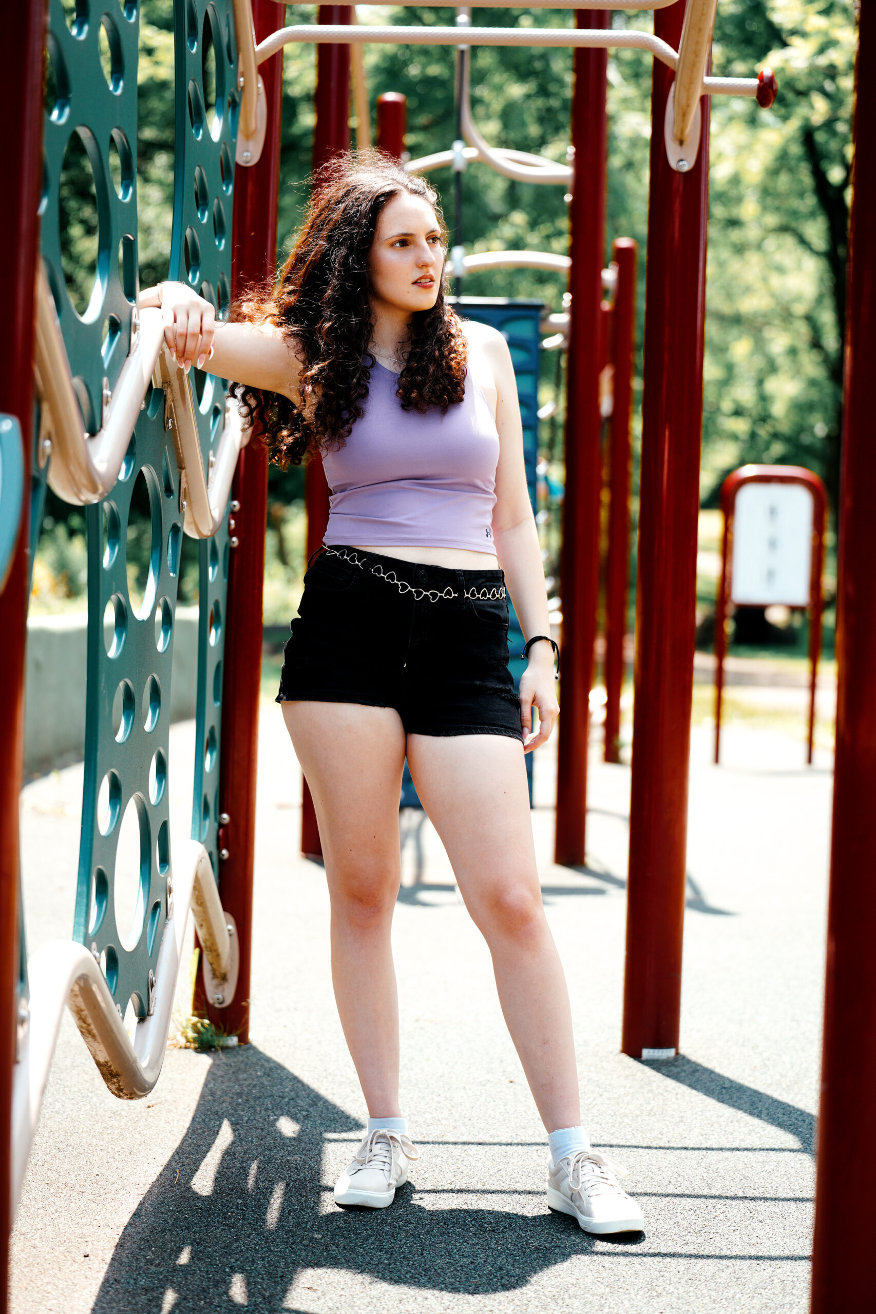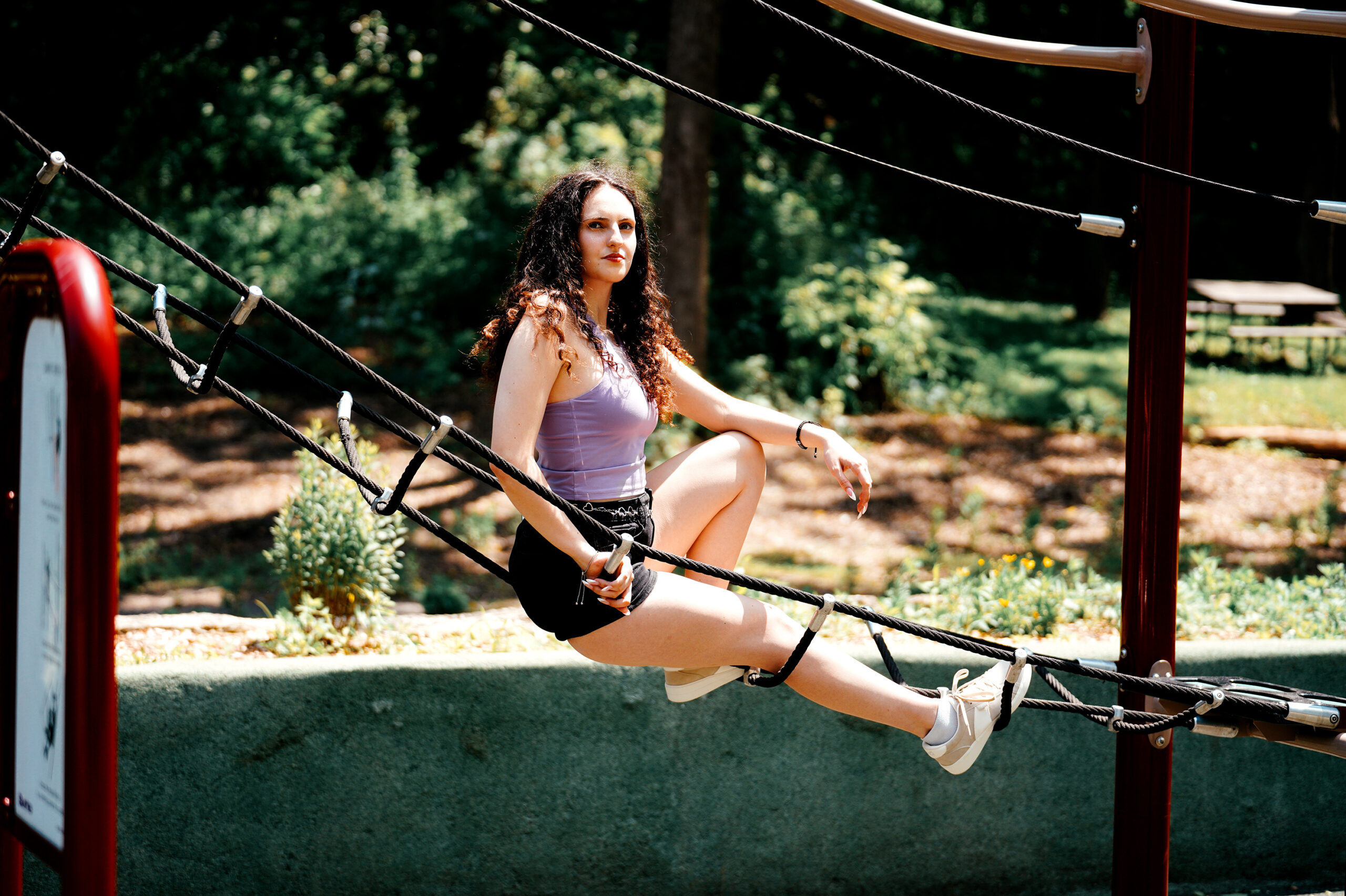 Fashion model Alyssa Barna gives the workout equipment a try but she finds greater comfort just chilling in the summer New England sun.