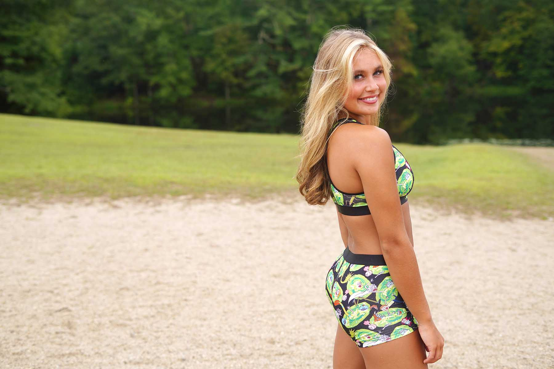 Model Manette Masse is dreaming of roaming the universe as she prepares to work out in her workout wear from SWAG (http://swagboxers.com) emblazoned with imagery from the animated series “Rick and Morty.”