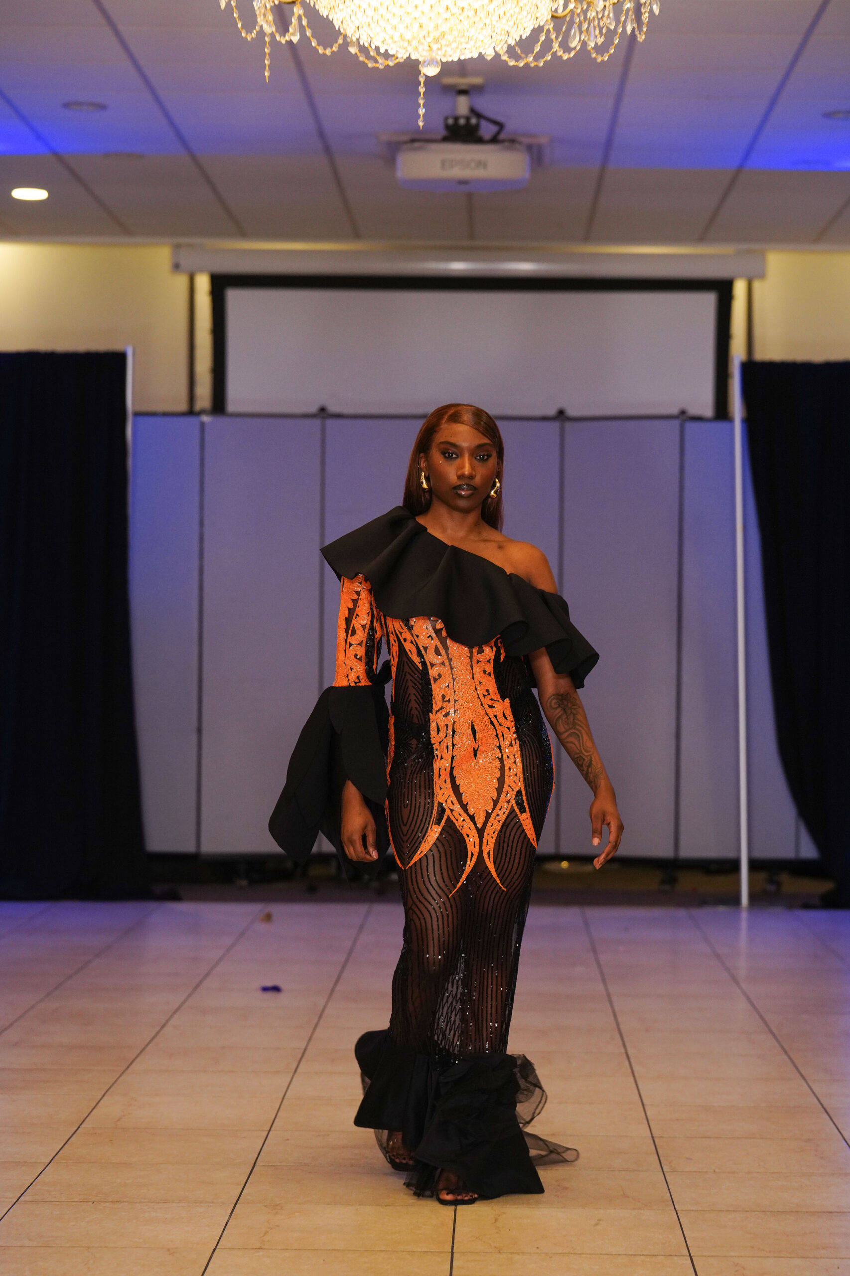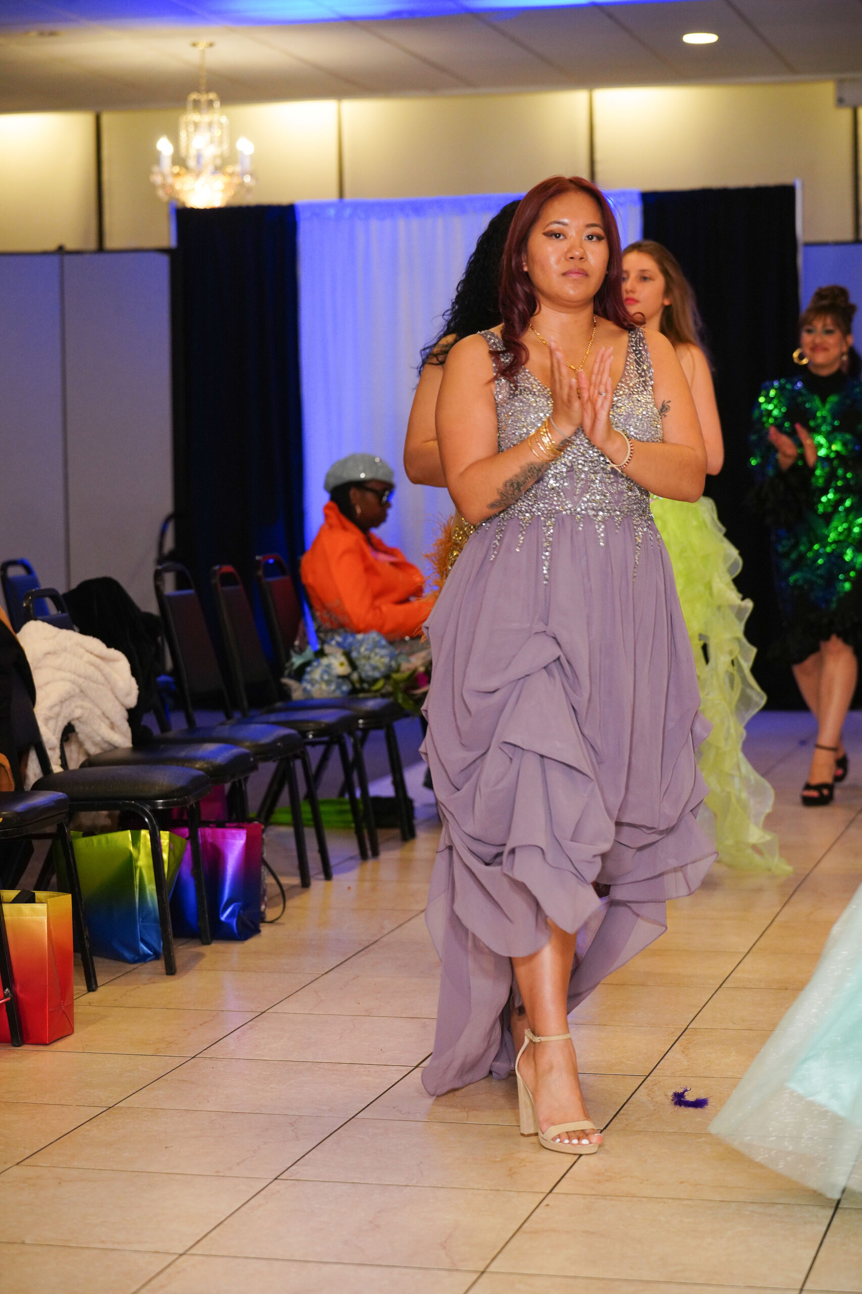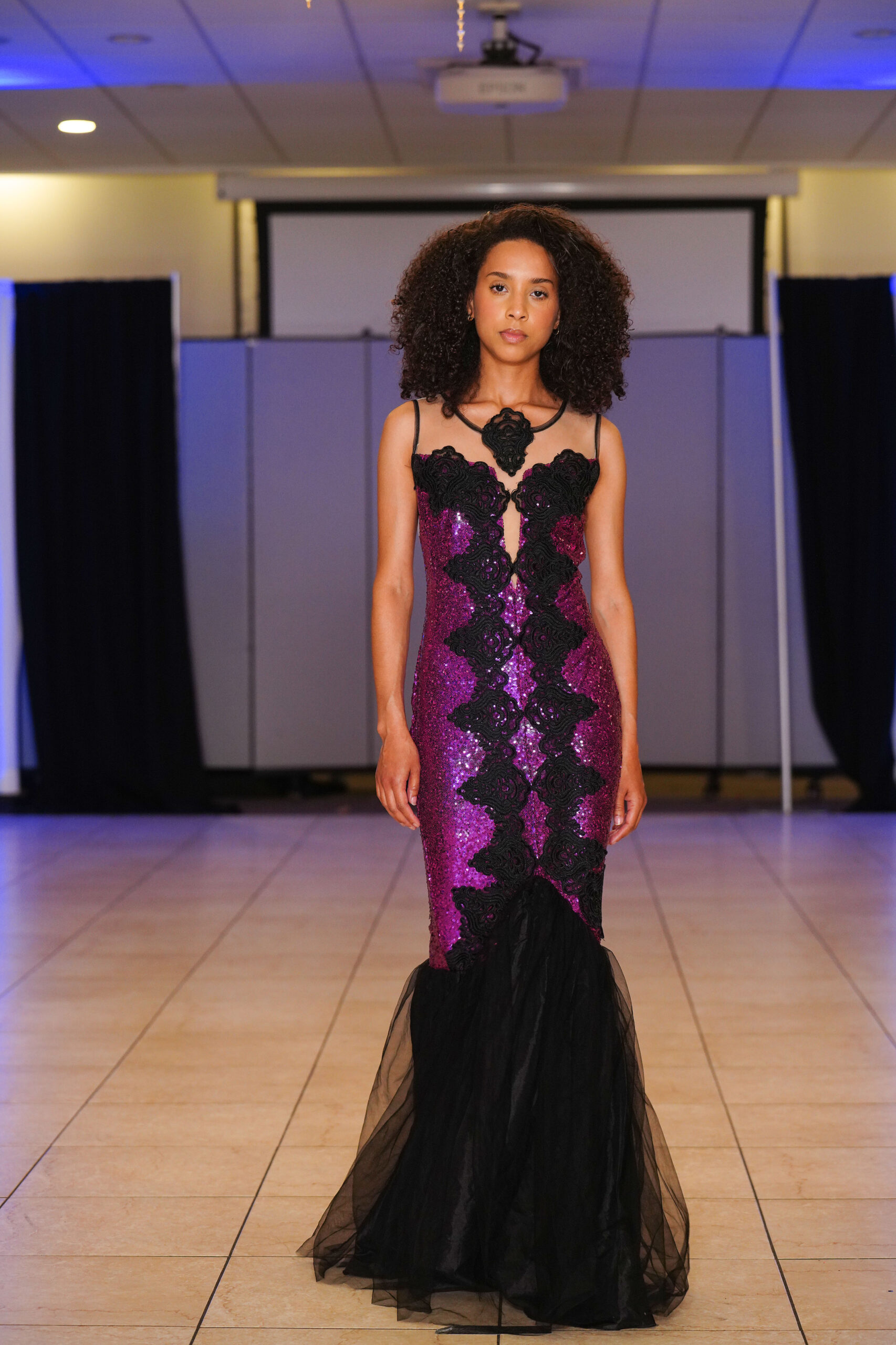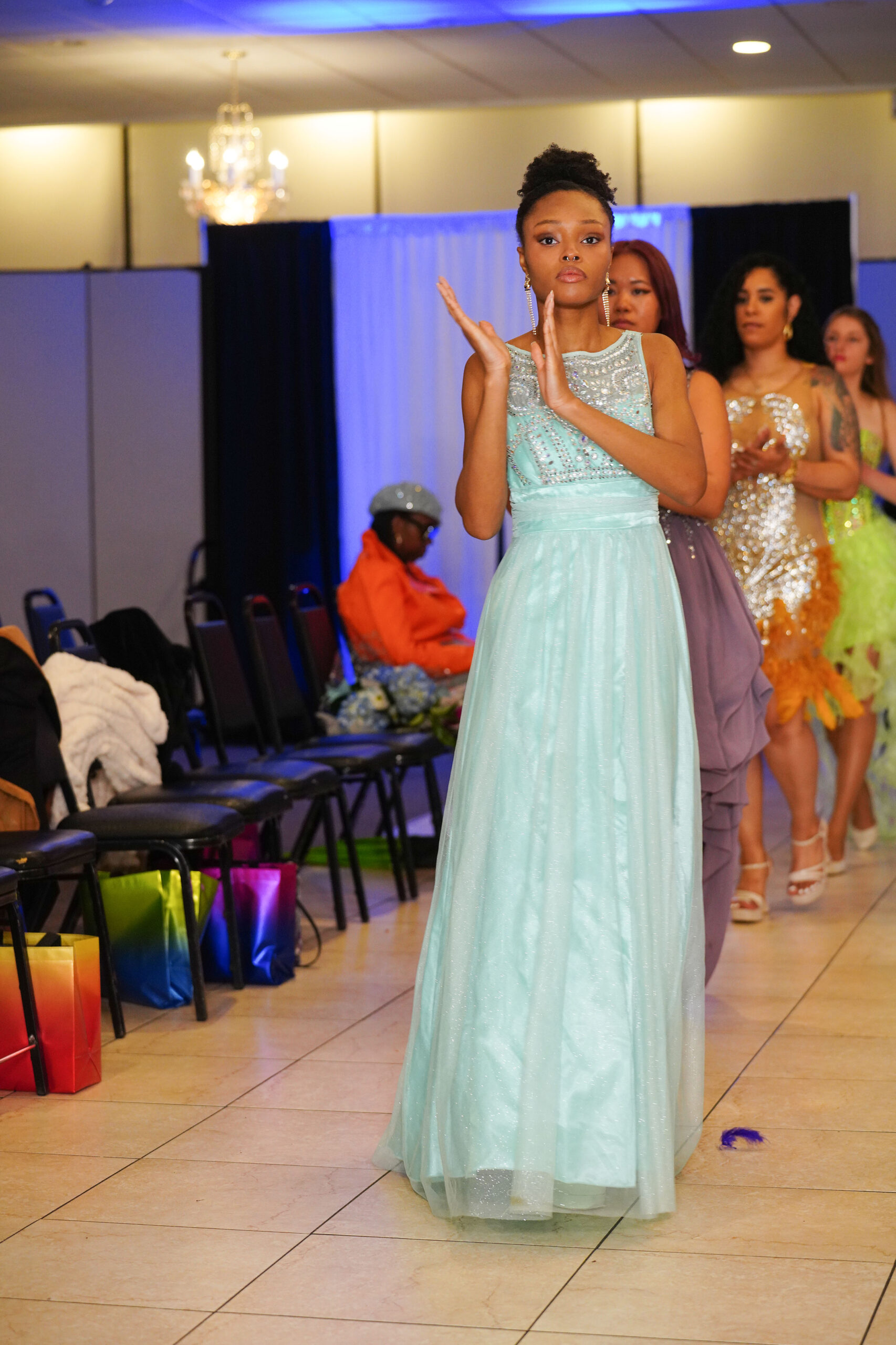 The Connecticut-based brand presented pieces that offered a cinematic allure to the catwalk set up in the Middletown Elks Club beneath the chandeliers on May 9.