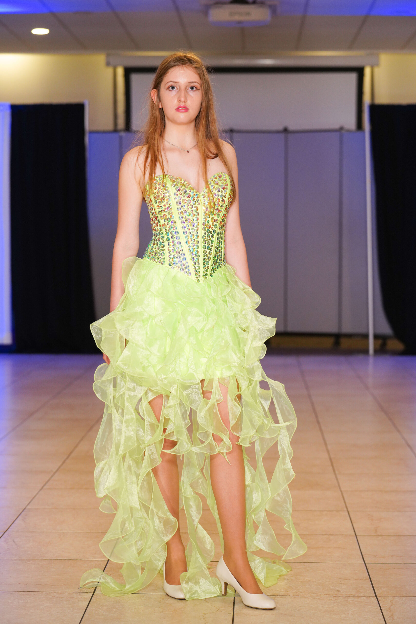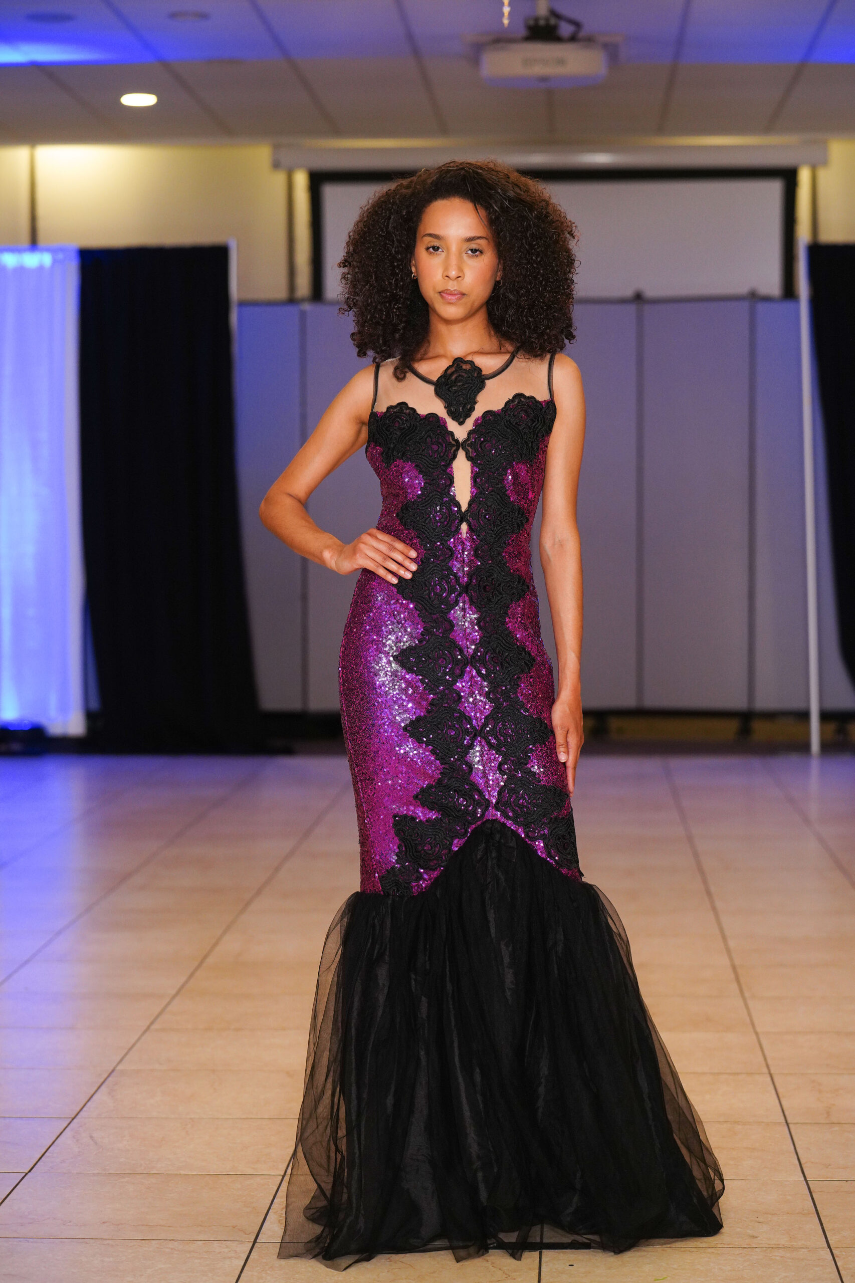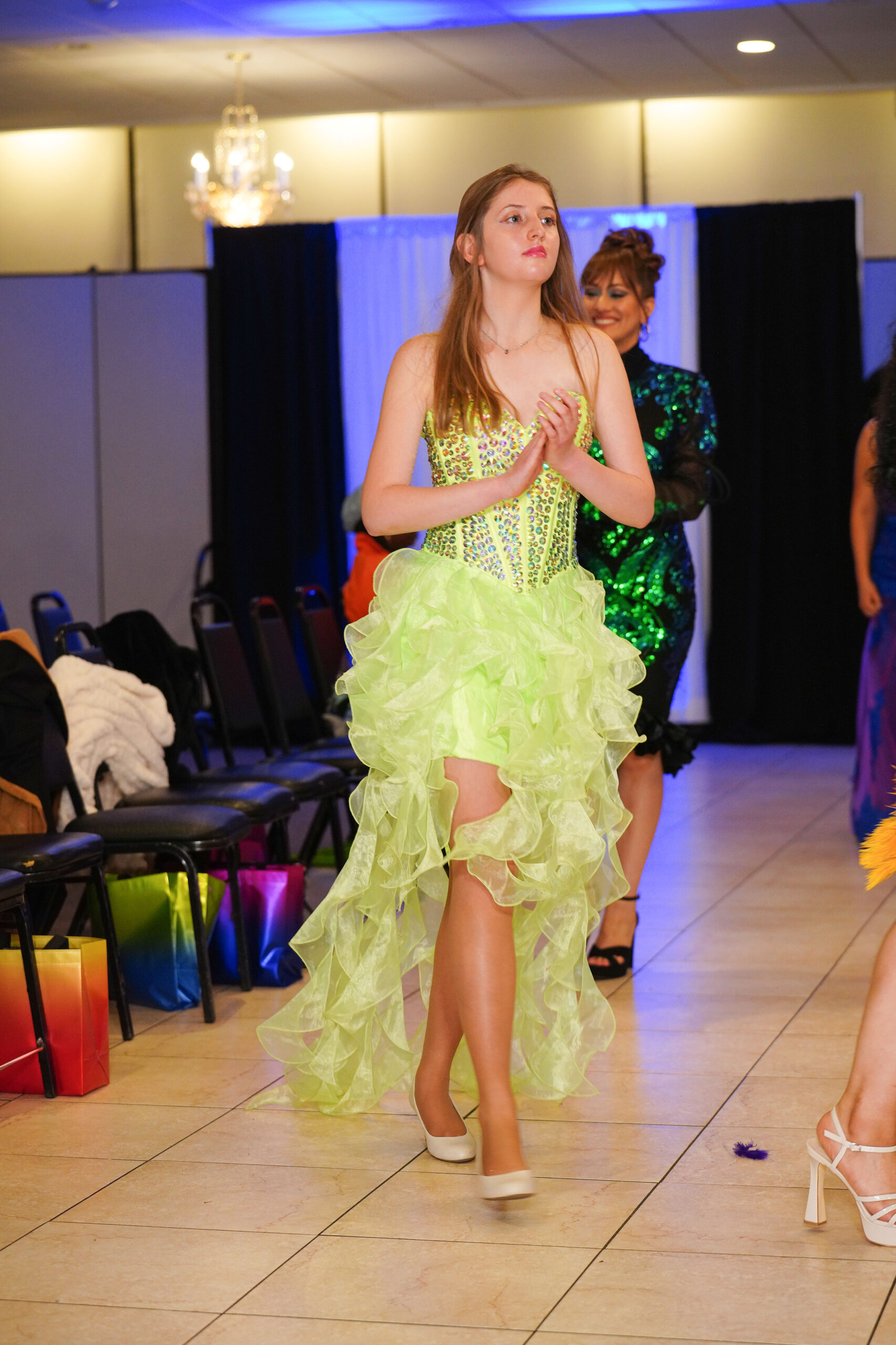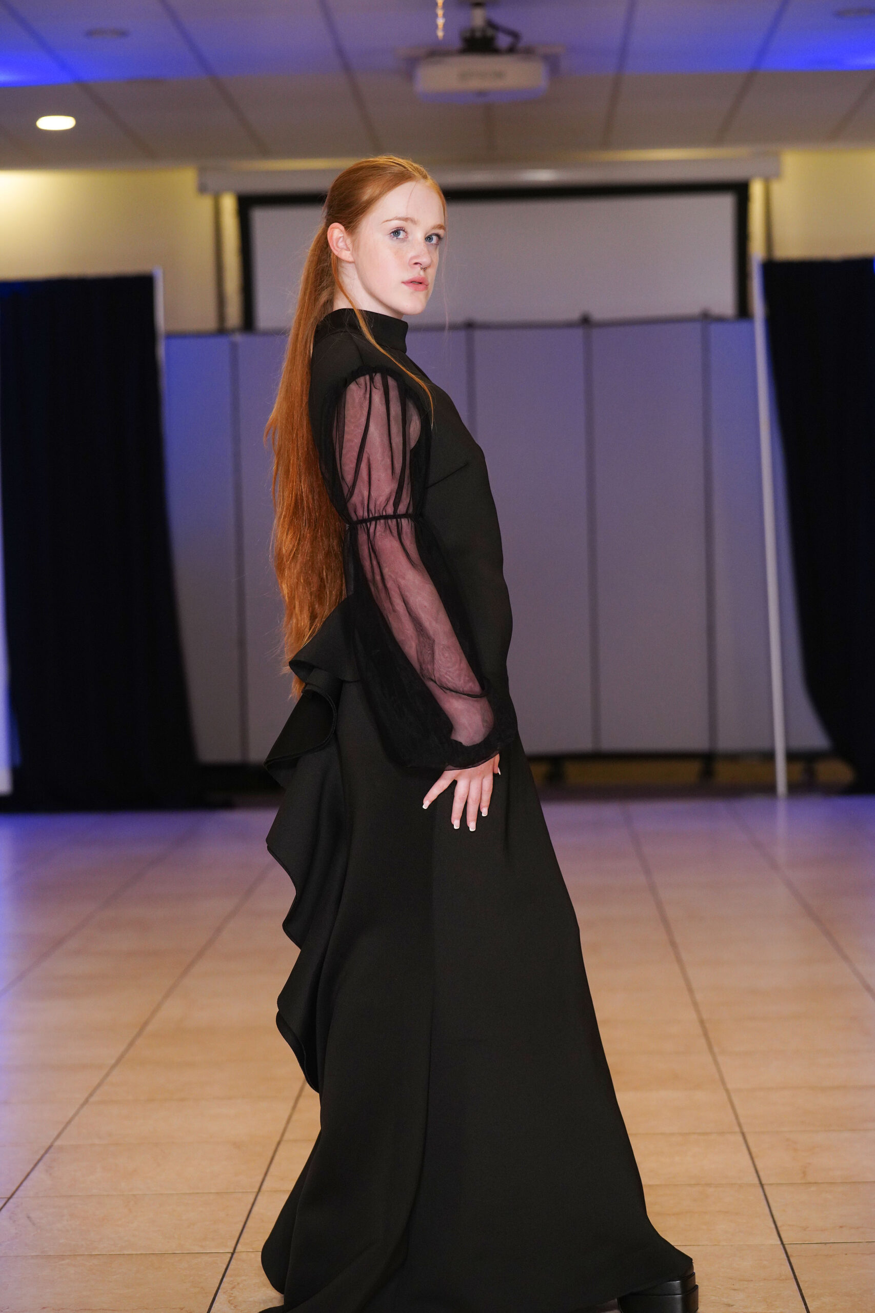 The Connecticut-based brand presented pieces that offered a cinematic allure to the catwalk set up in the Middletown Elks Club beneath the chandeliers on May 9.