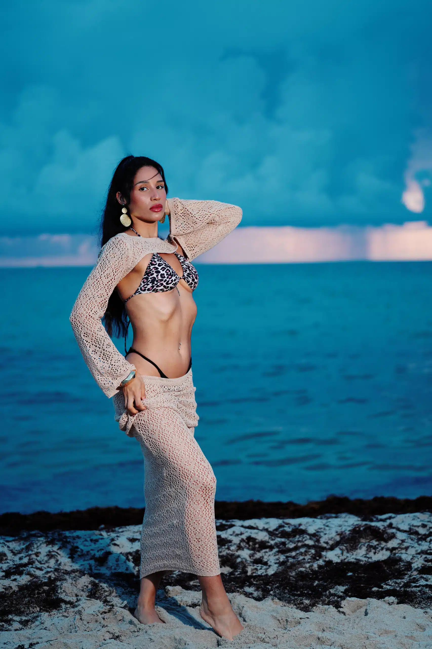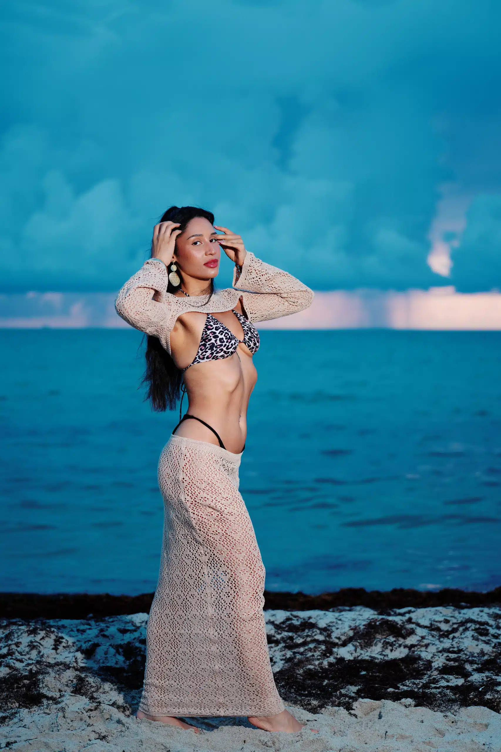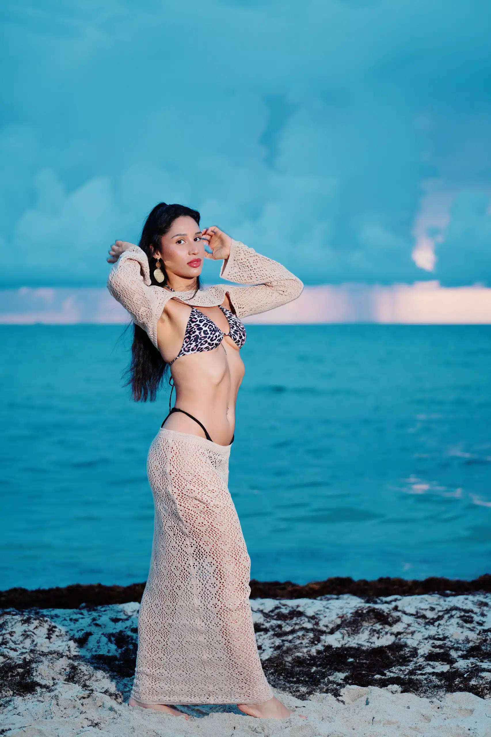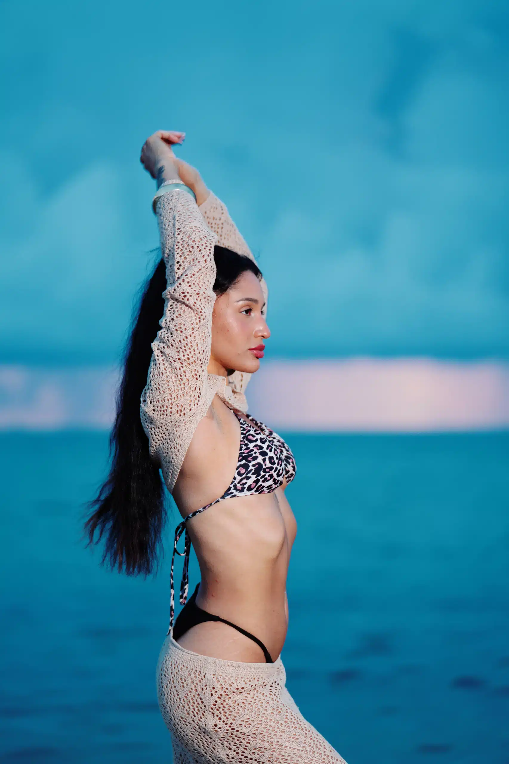 Kaleya Blake, who was competing as Miss Bikini Golden Alchemy Model at Miss Bikini US, stretches toward the dawn in an early morning photo shoot that was part of this yearโs judging process.