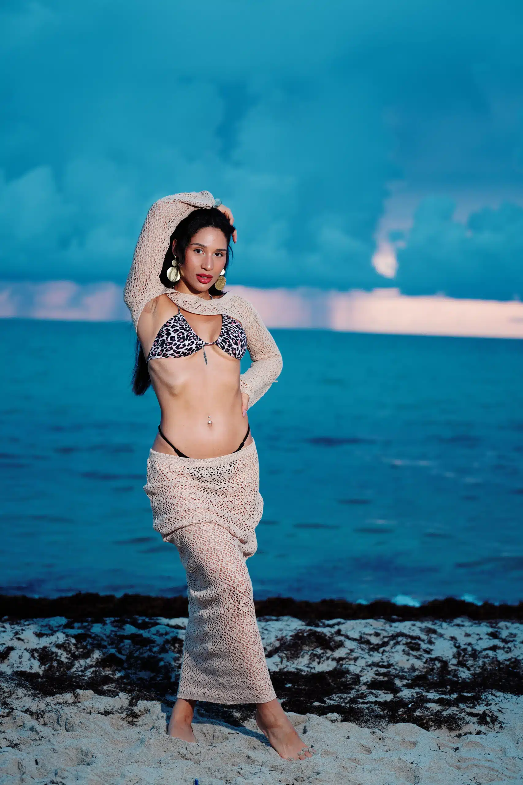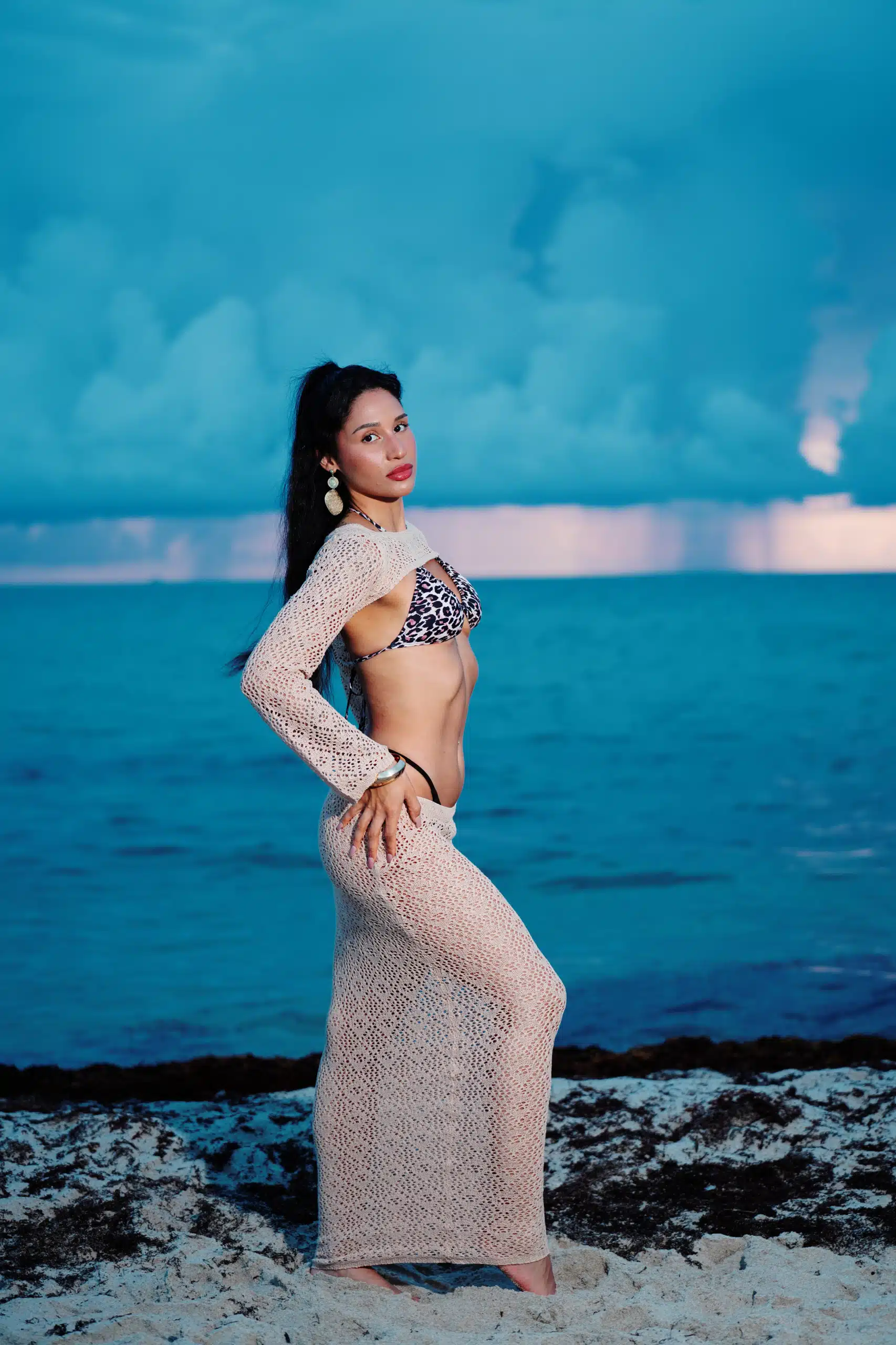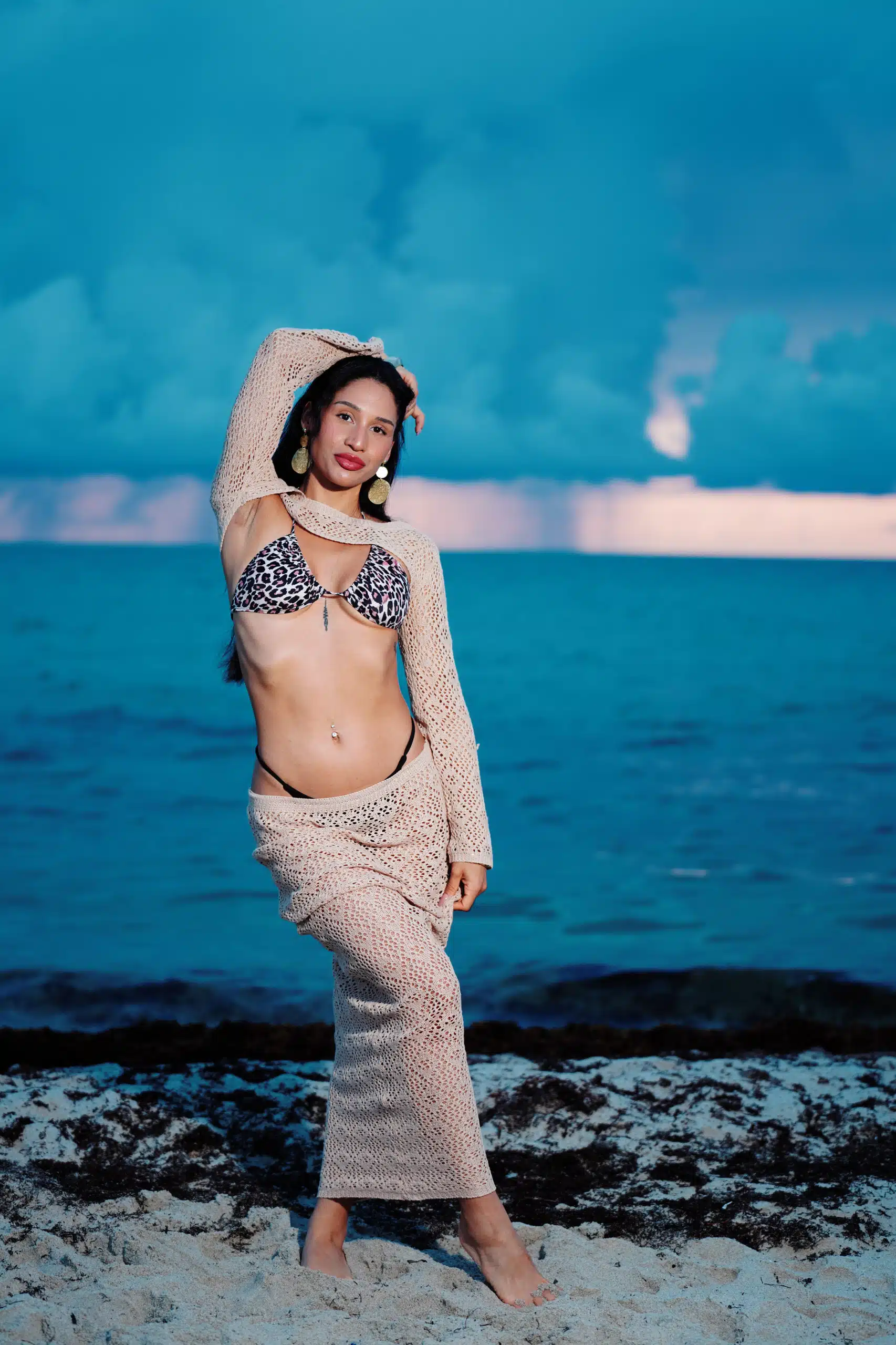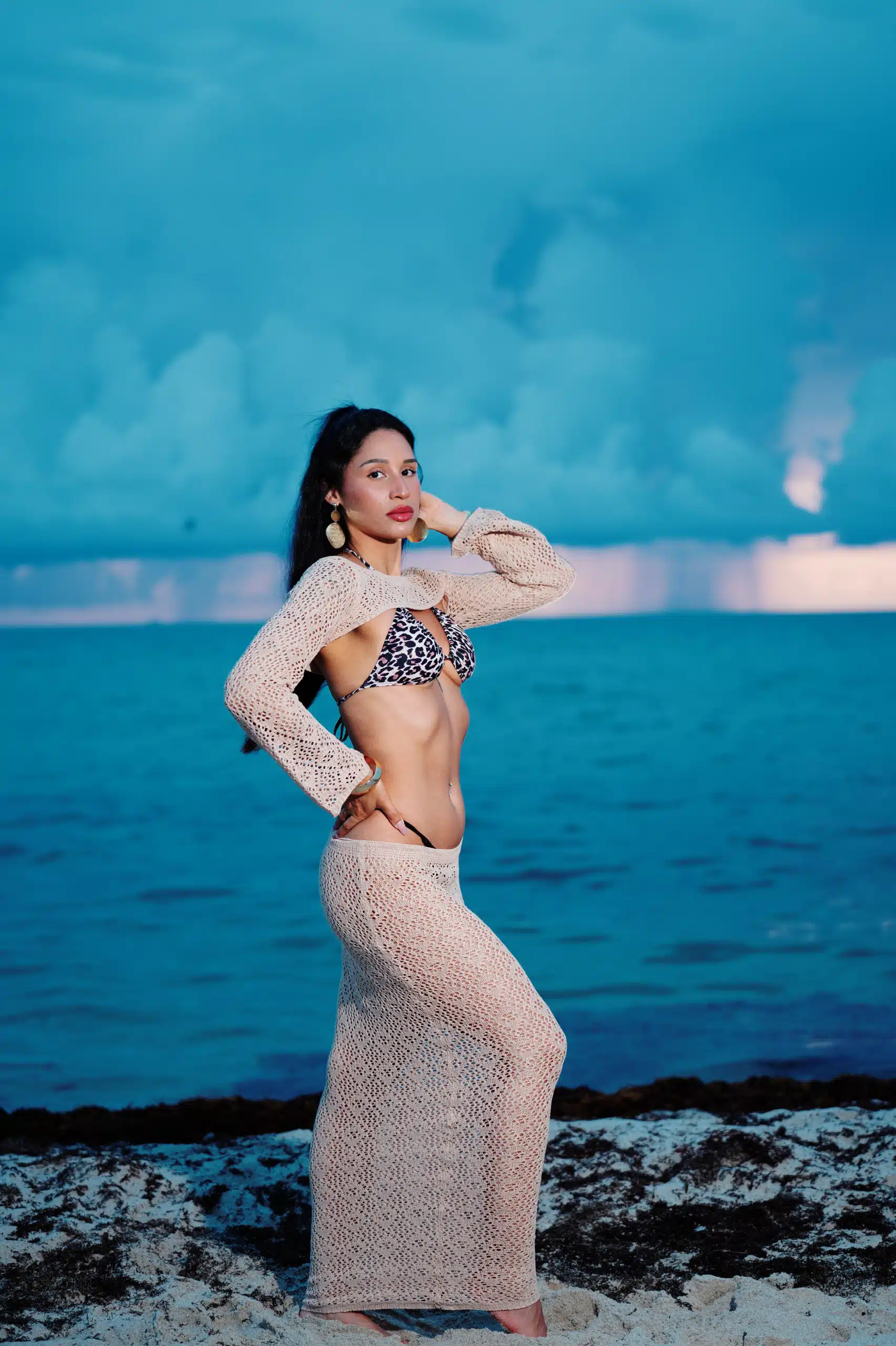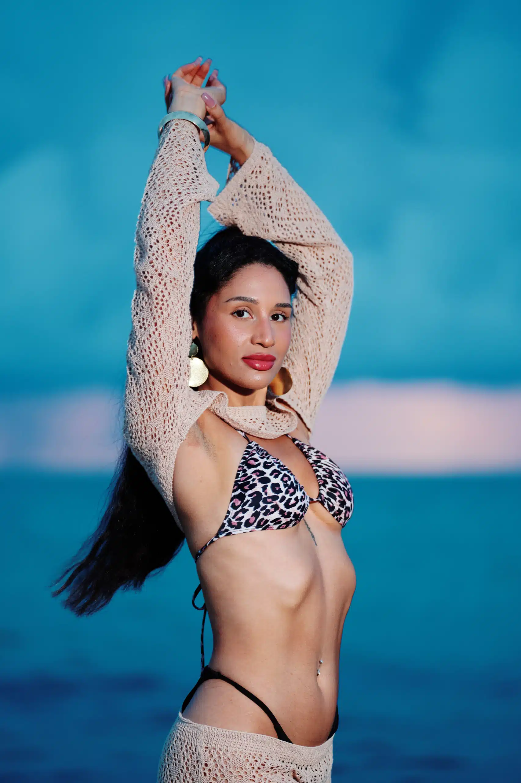 Kaleya Blake, who was competing as Miss Bikini Golden Alchemy Model at Miss Bikini US, stretches toward the dawn in an early morning photo shoot that was part of this yearโs judging process.
