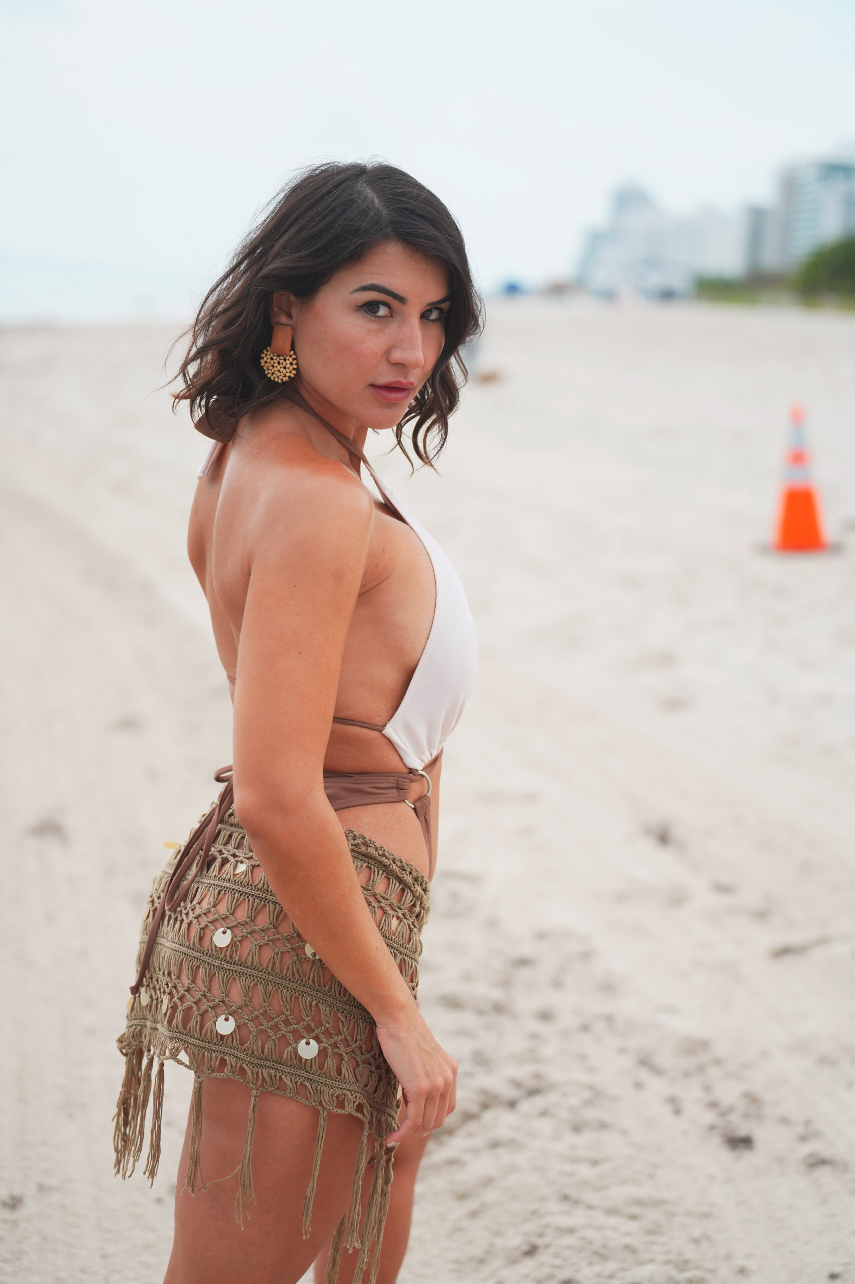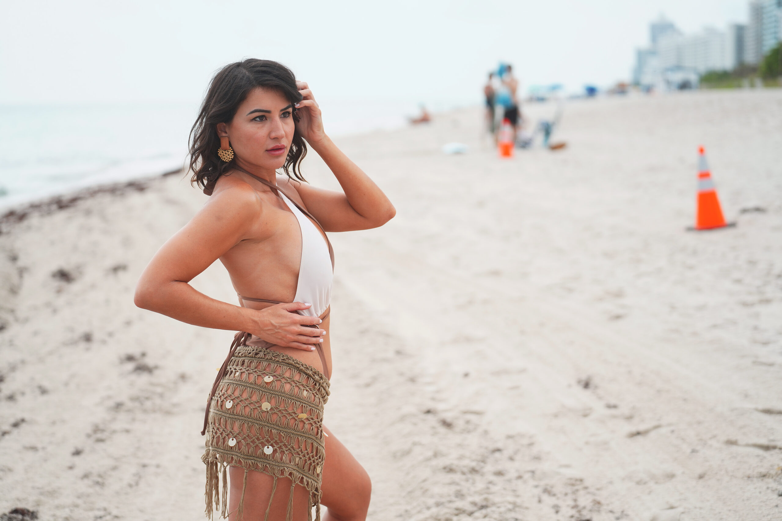 Miami model Erika Fundora works out her posing muscles on the beach during a jam-packed Miami Swim Week itinerary of runway shows and fashion shoots.