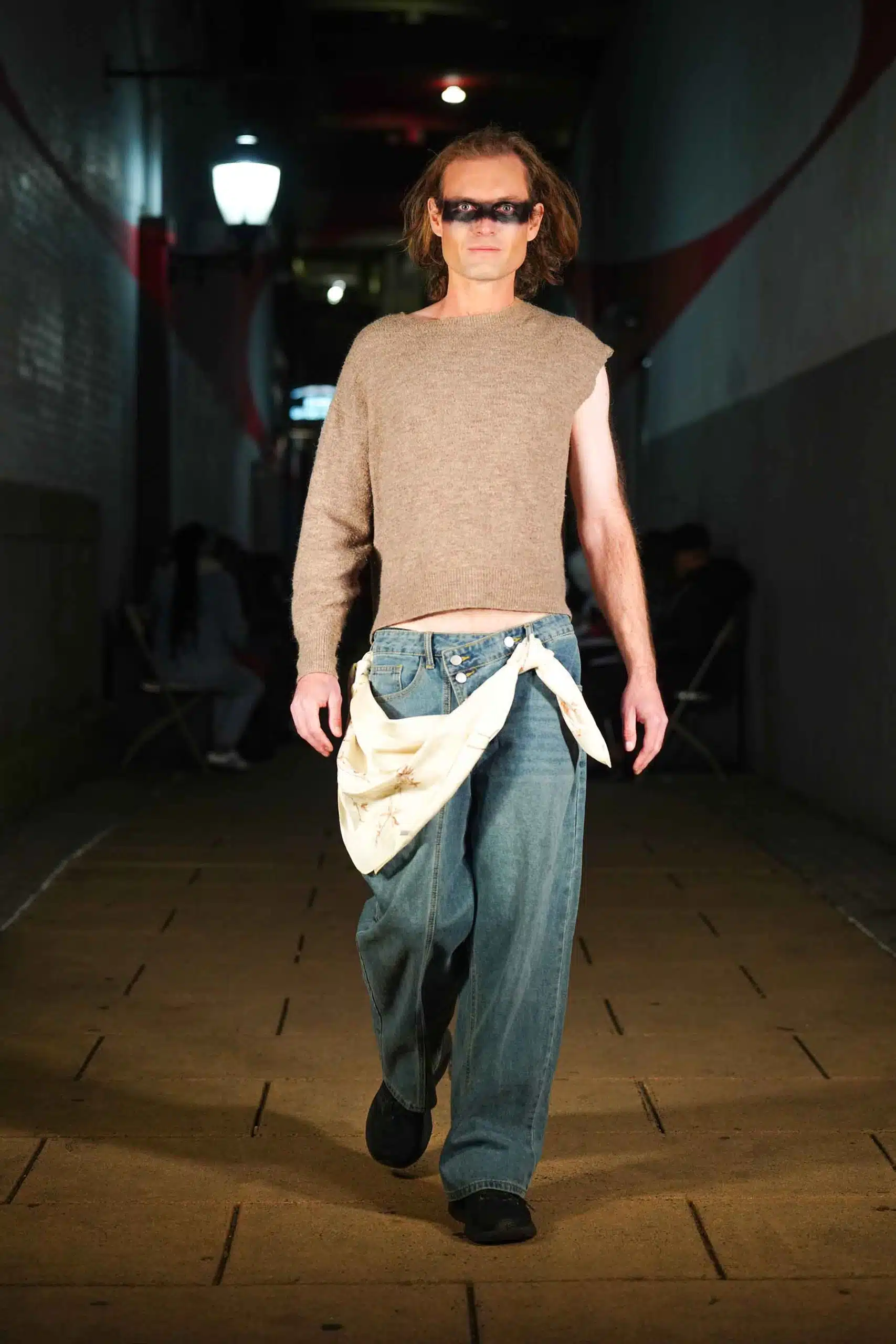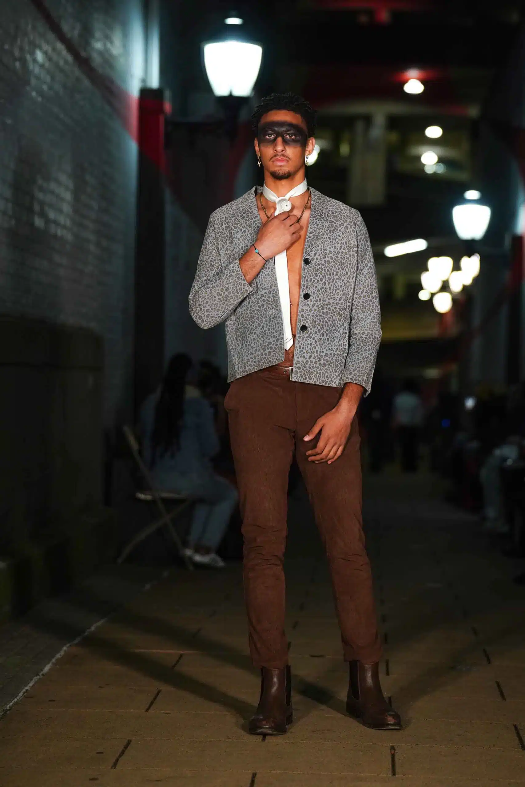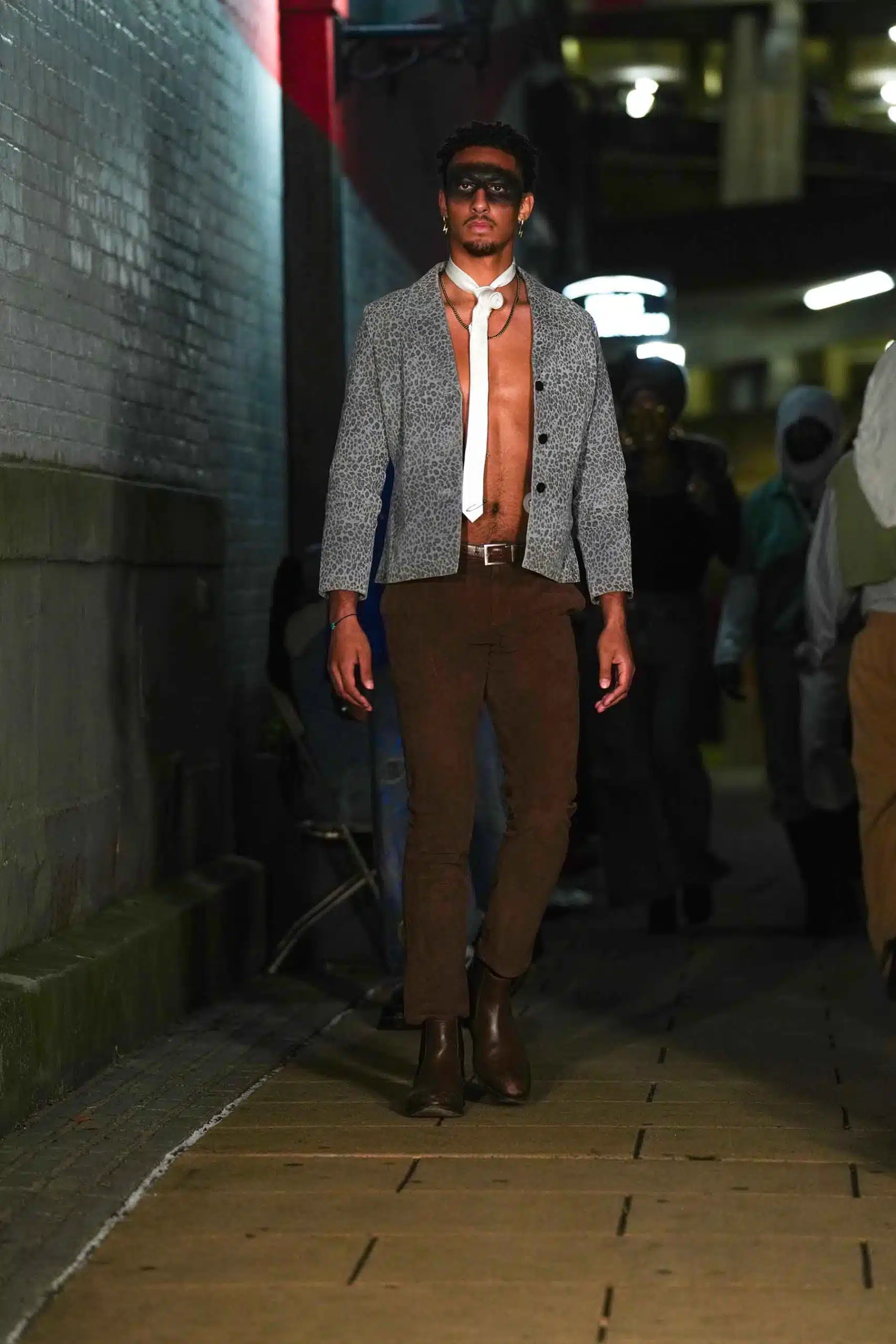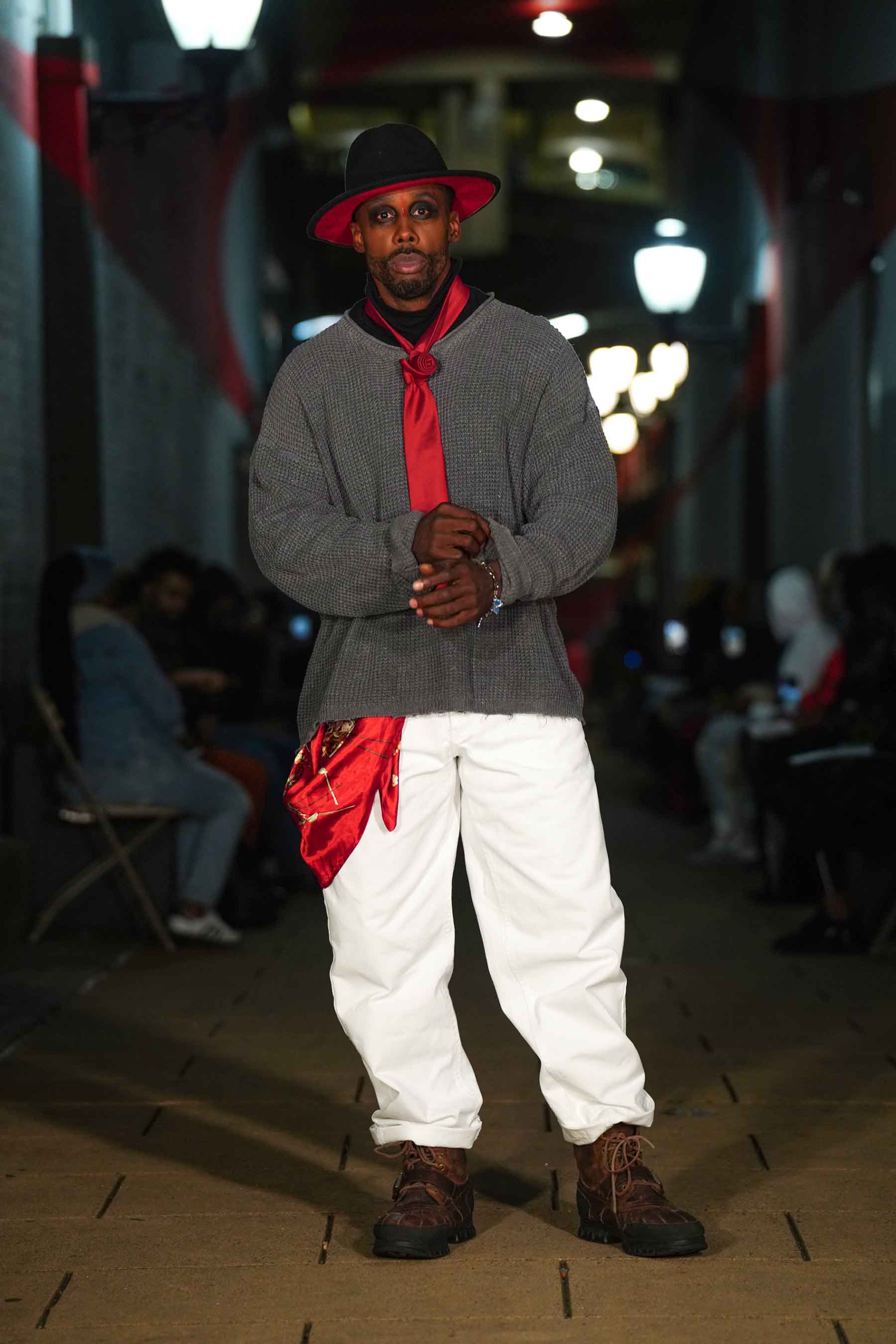 AMT.C presented its latest creations for men in an alley off Chapel Street in New Haven as NHFW (New Haven Fashion Week) held a pop-up fashion show staged against the backdrop of the public art piece, “Four Circles and a Square.”