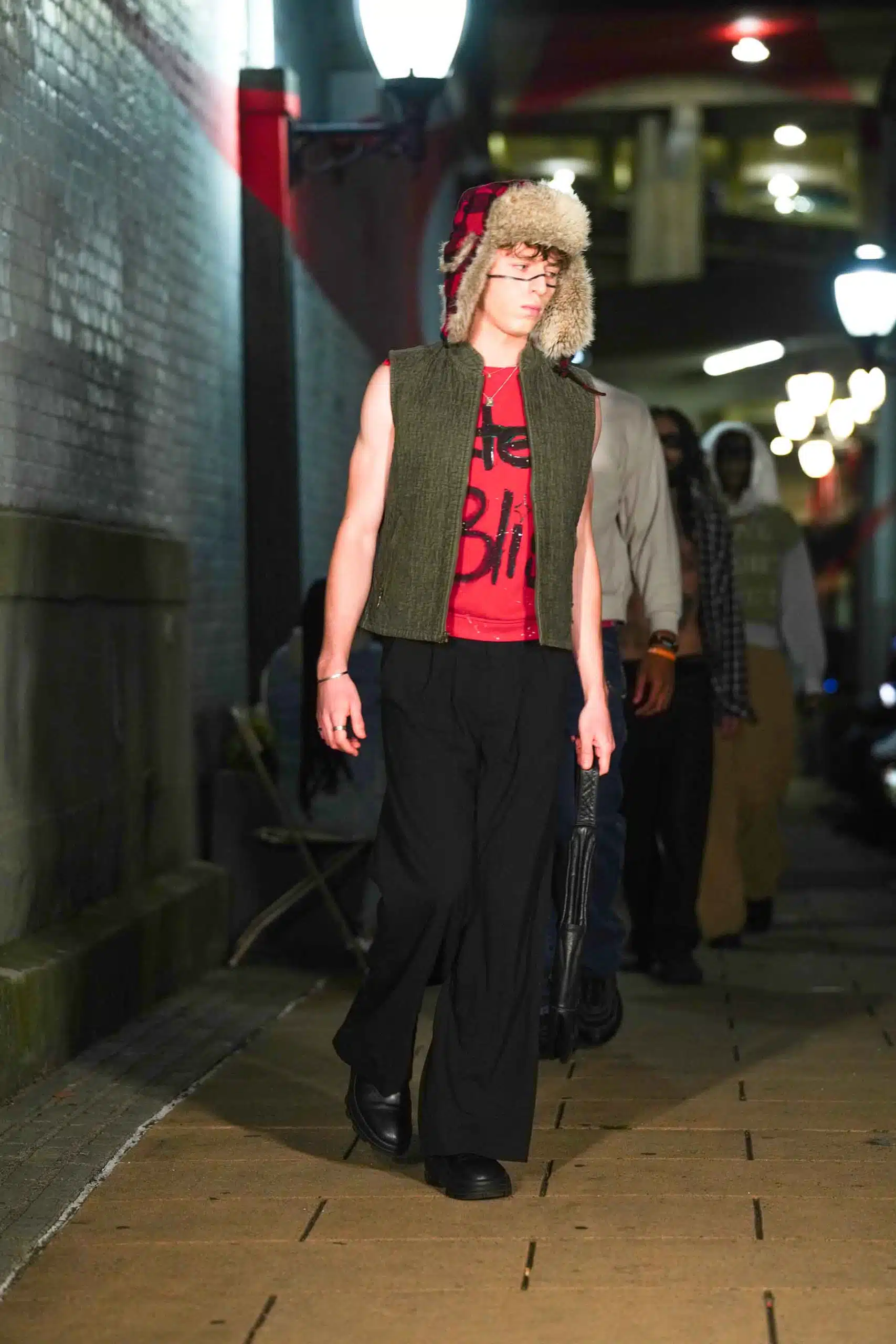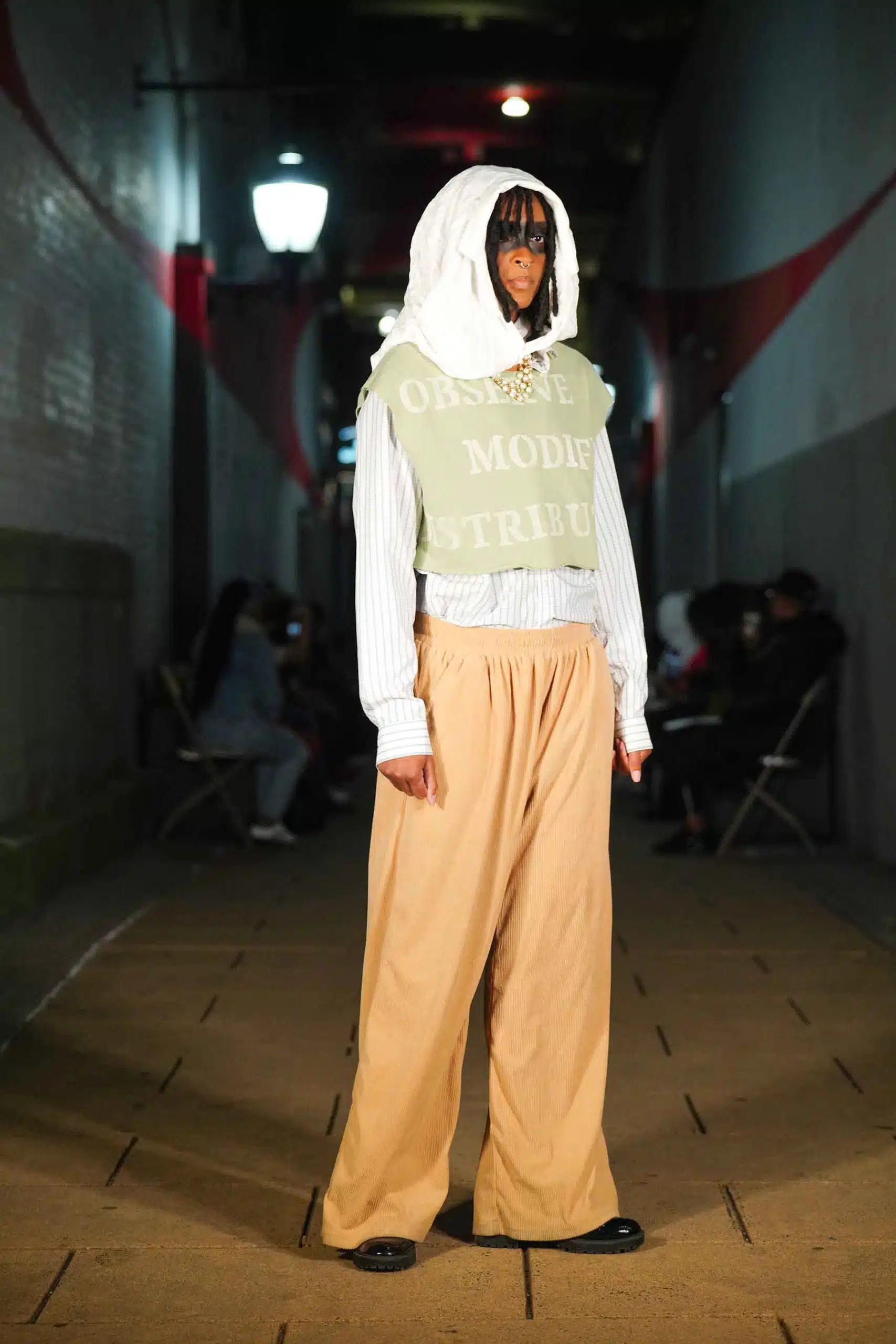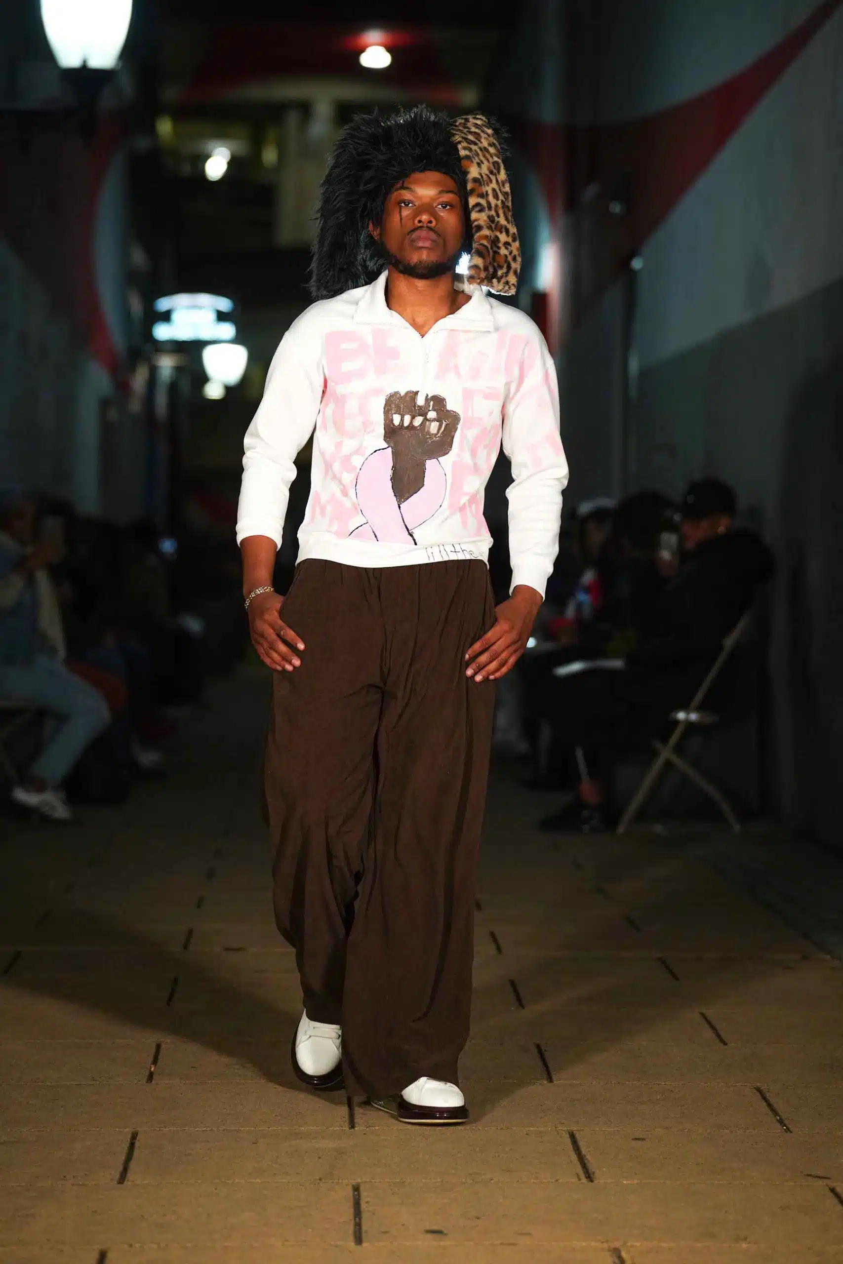 AMT.C presented its latest creations for men in an alley off Chapel Street in New Haven as NHFW (New Haven Fashion Week) held a pop-up fashion show staged against the backdrop of the public art piece, “Four Circles and a Square.”