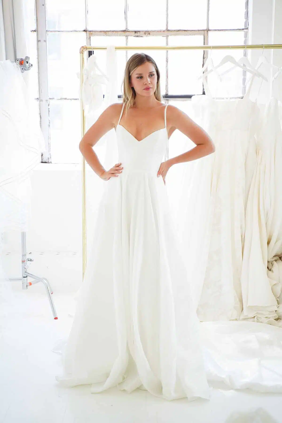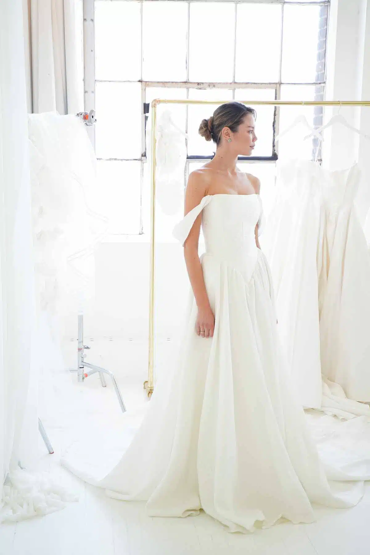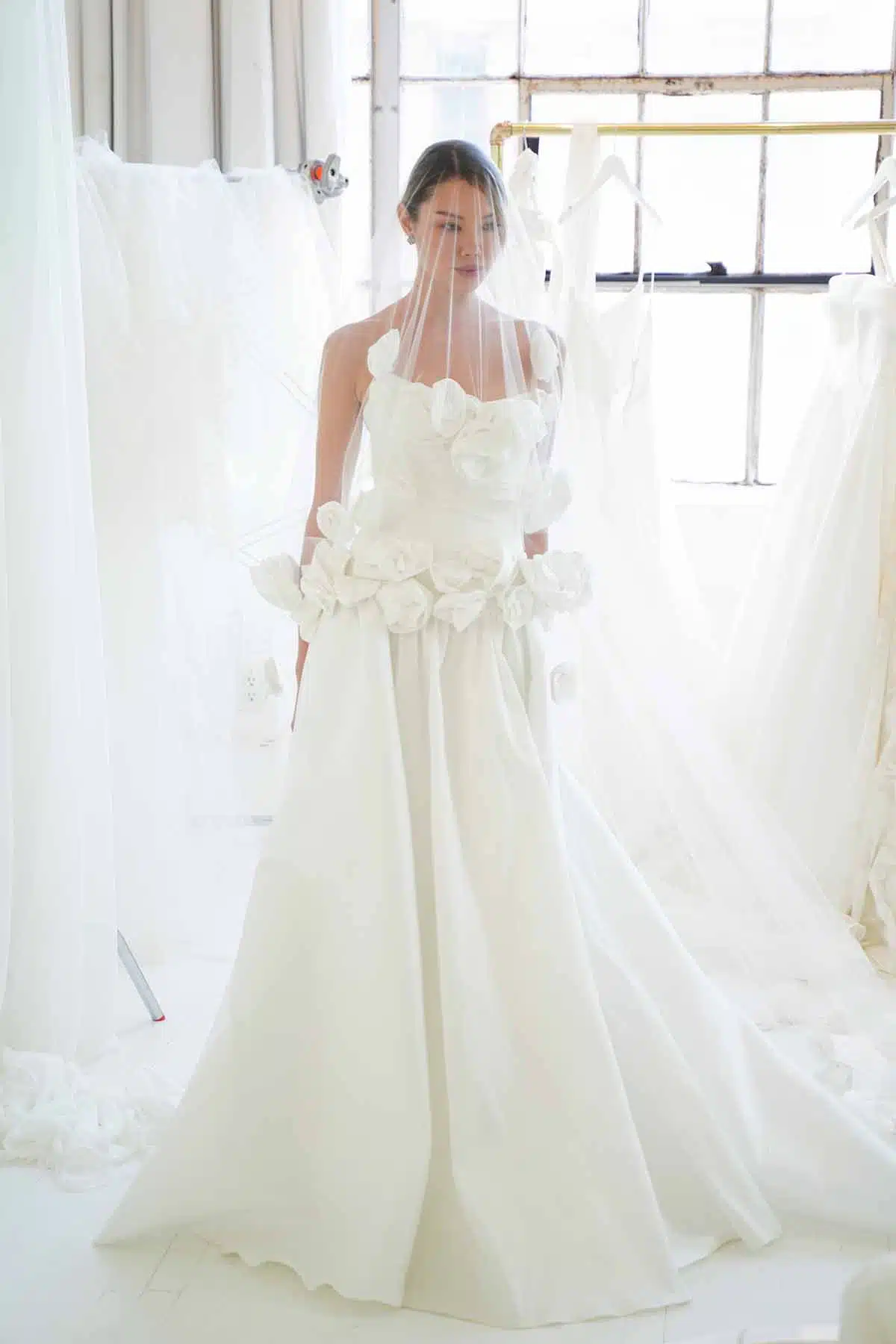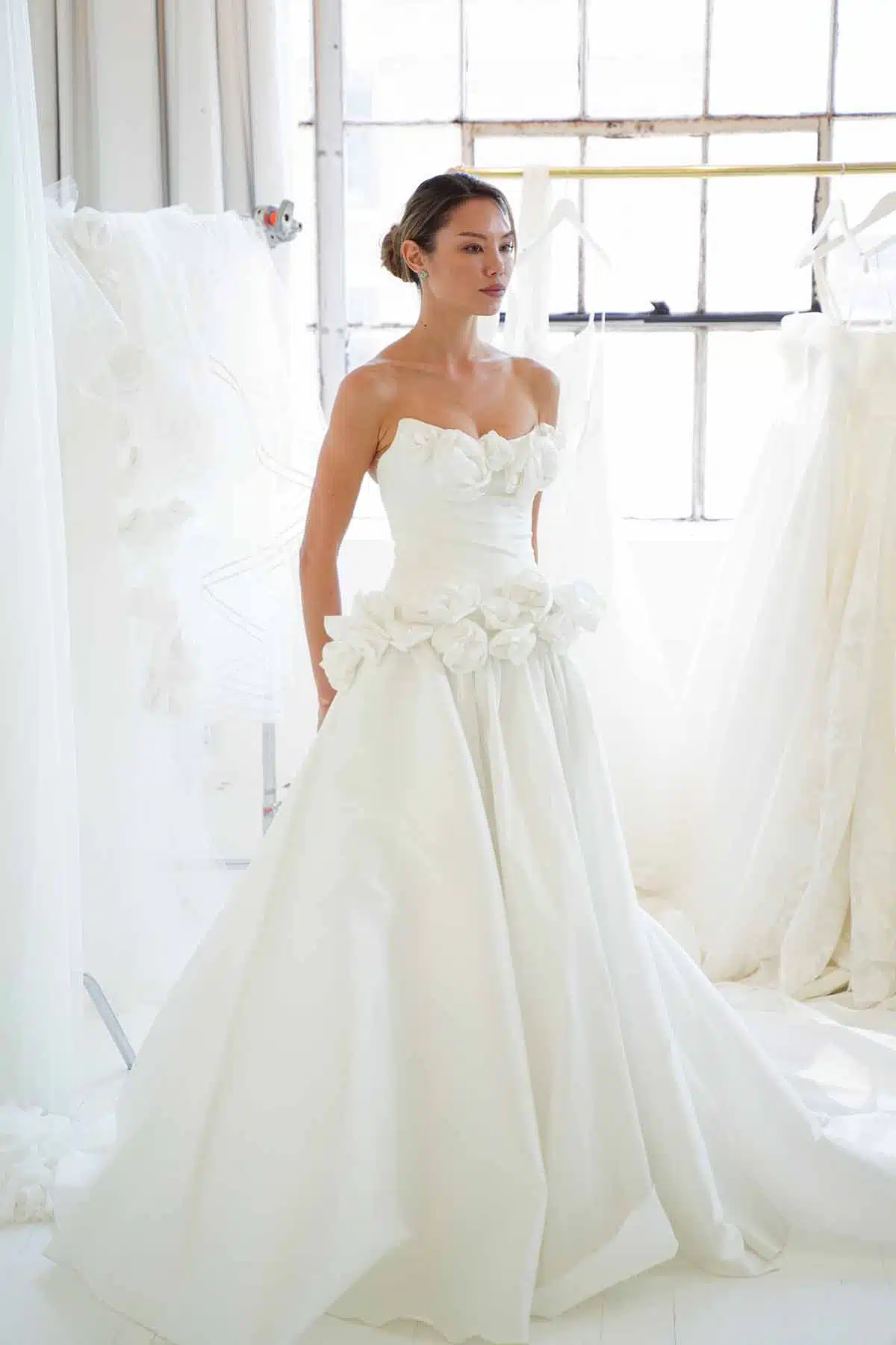 Models pose in the latest offerings from Truvelle Laudae Aesling (https://truvelle.com/, https://www.laudae.com/, https://aesling.com/) booth at One Fine Day Bridal Market during New York Bridal Fashion Week on April 9.