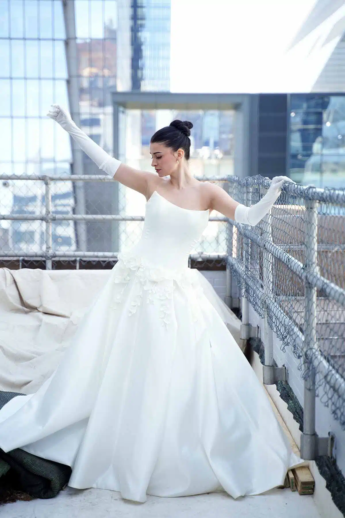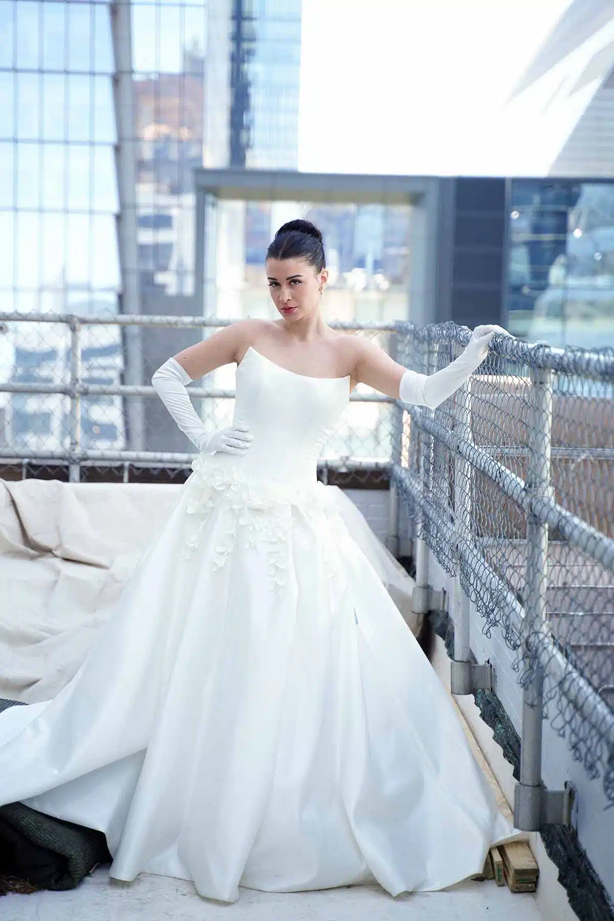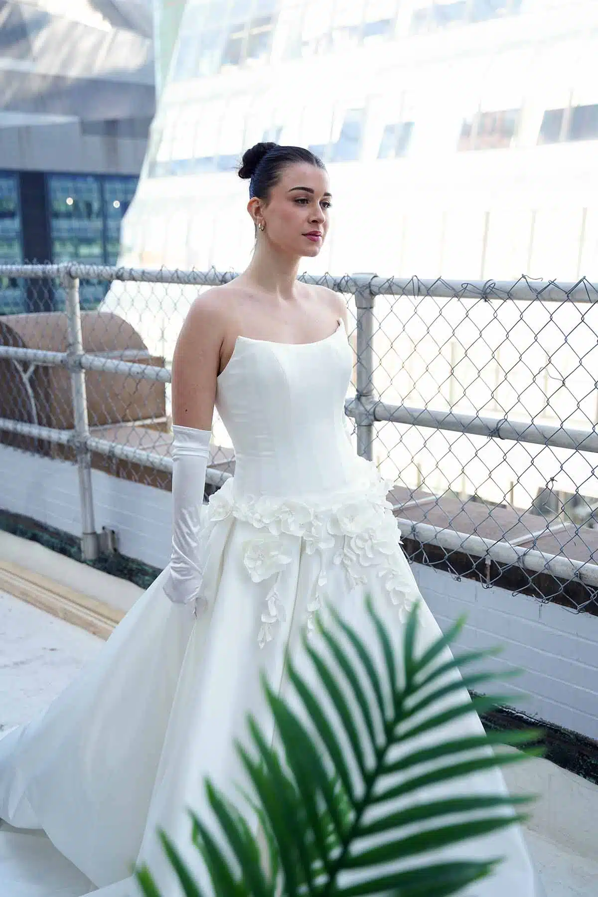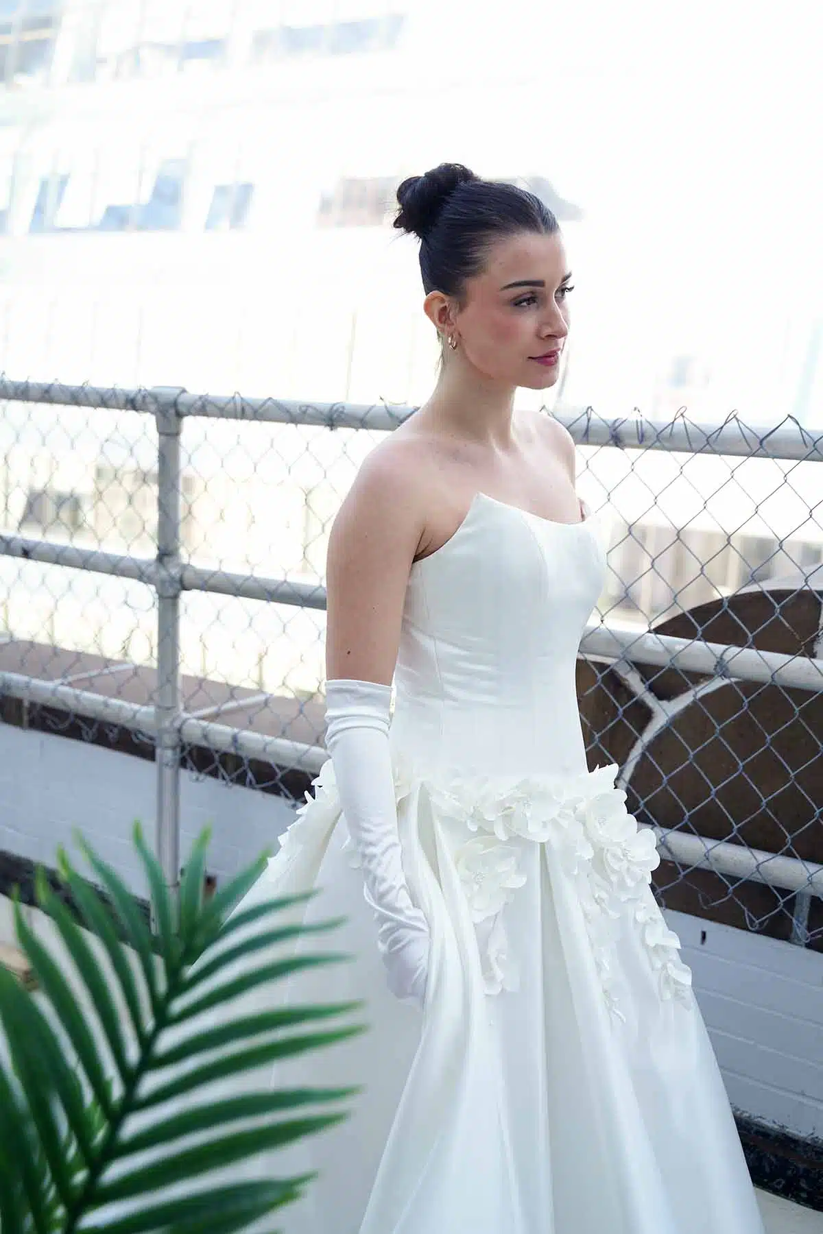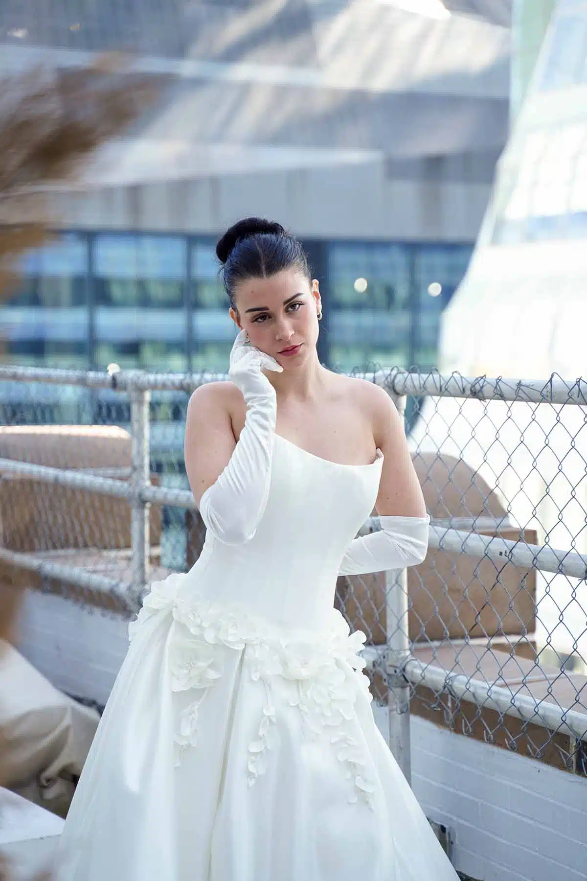 At the One Fine Day bridal market during New York Bridal Fashion Week April 9, a model steps outside to pose in one of the latest gowns available from White Rose Bridal (www.whiterosebridal.com).