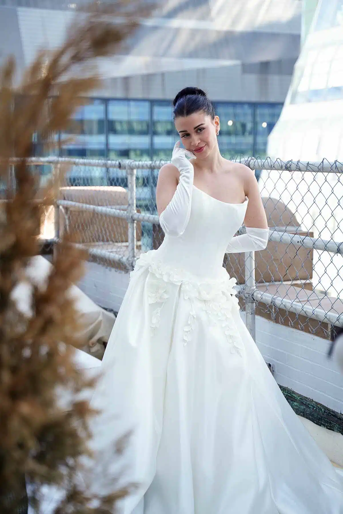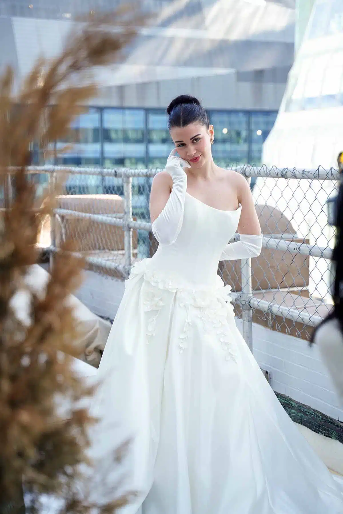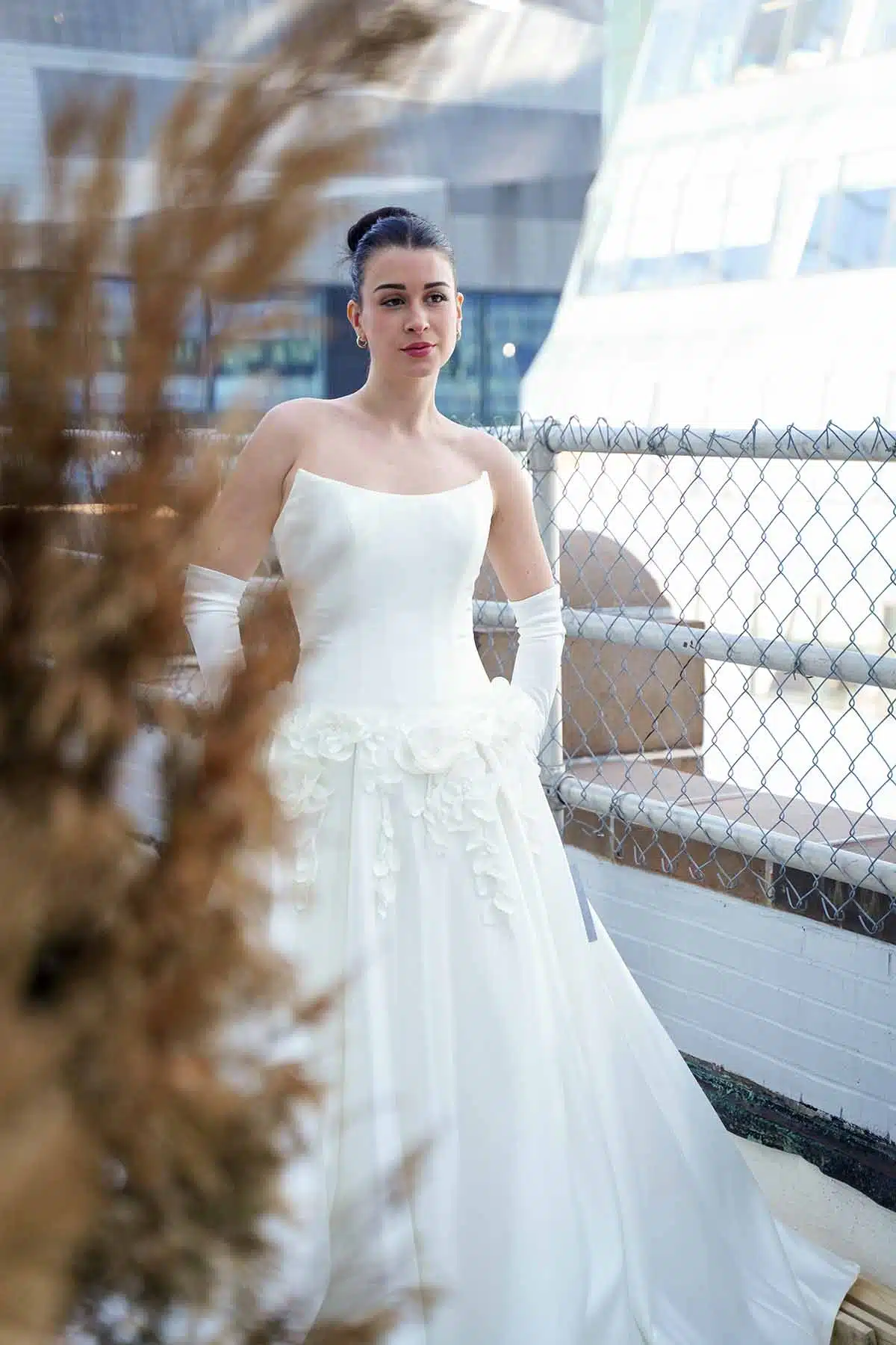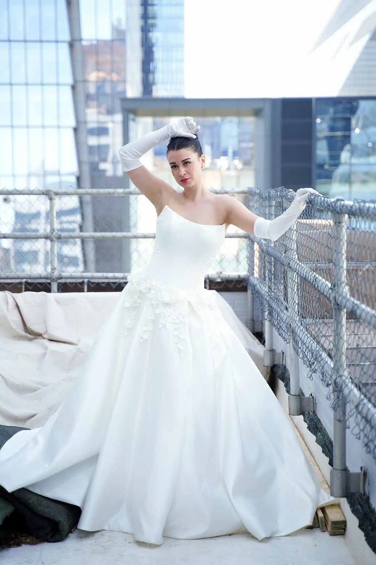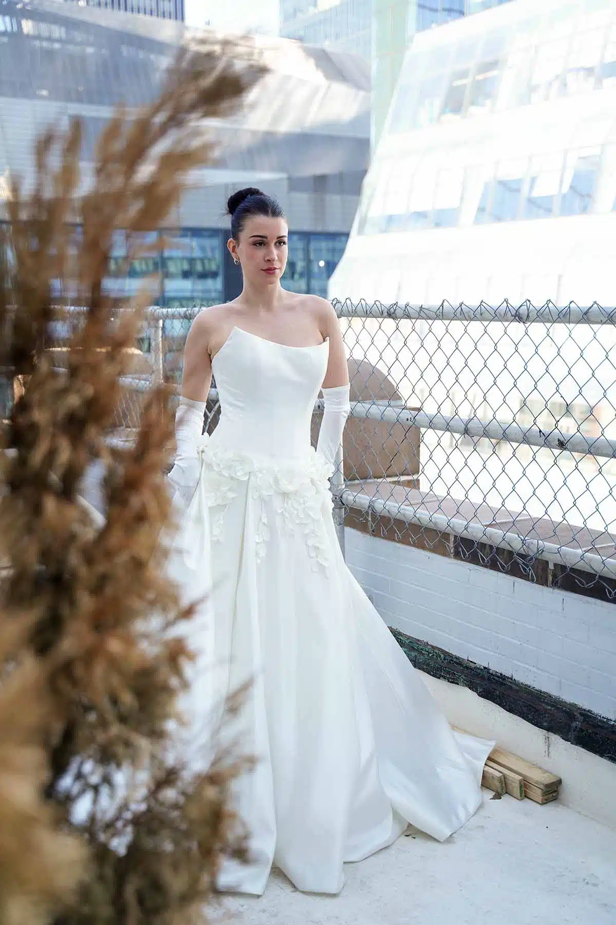 At the One Fine Day bridal market during New York Bridal Fashion Week April 9, a model steps outside to pose in one of the latest gowns available from White Rose Bridal (www.whiterosebridal.com).