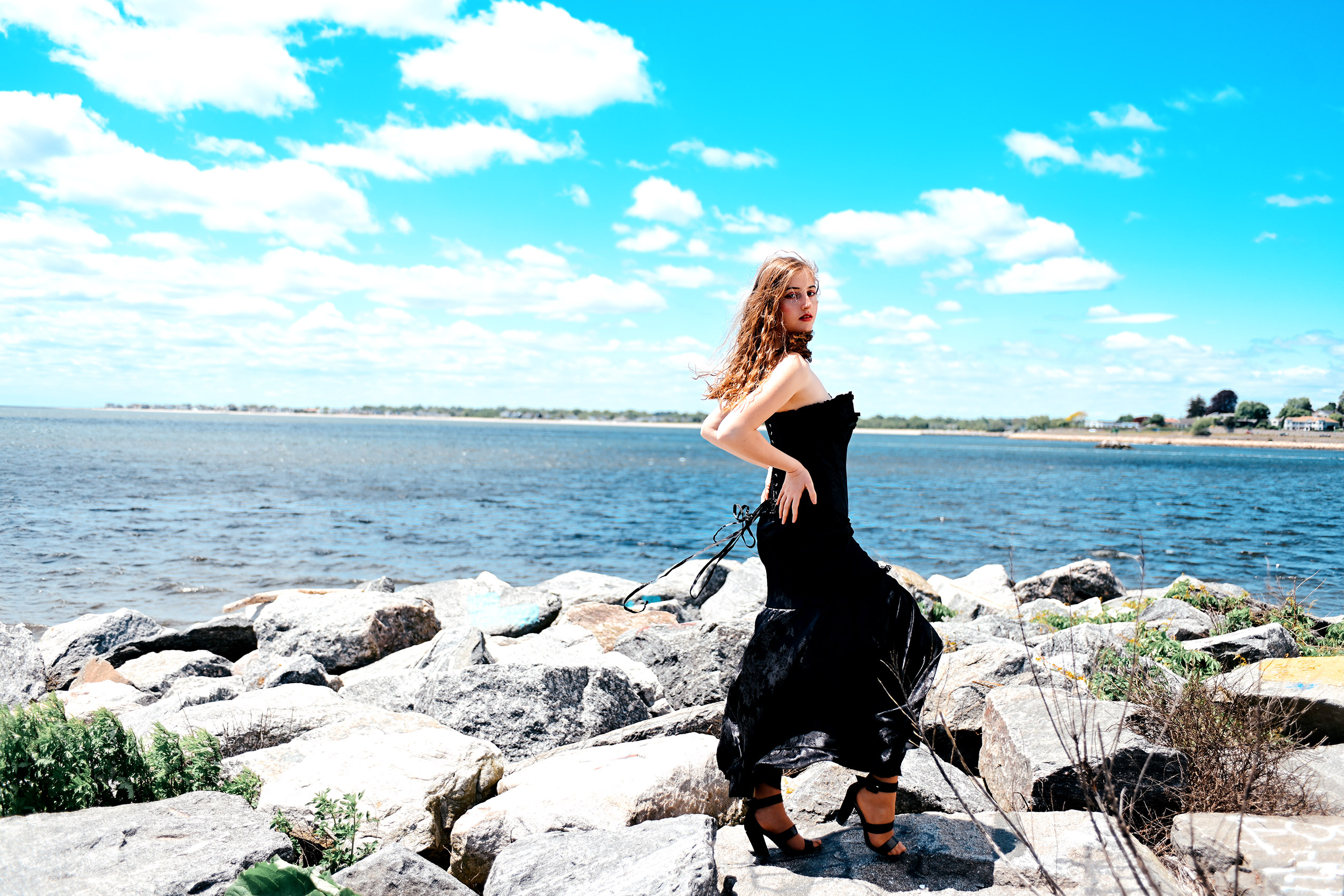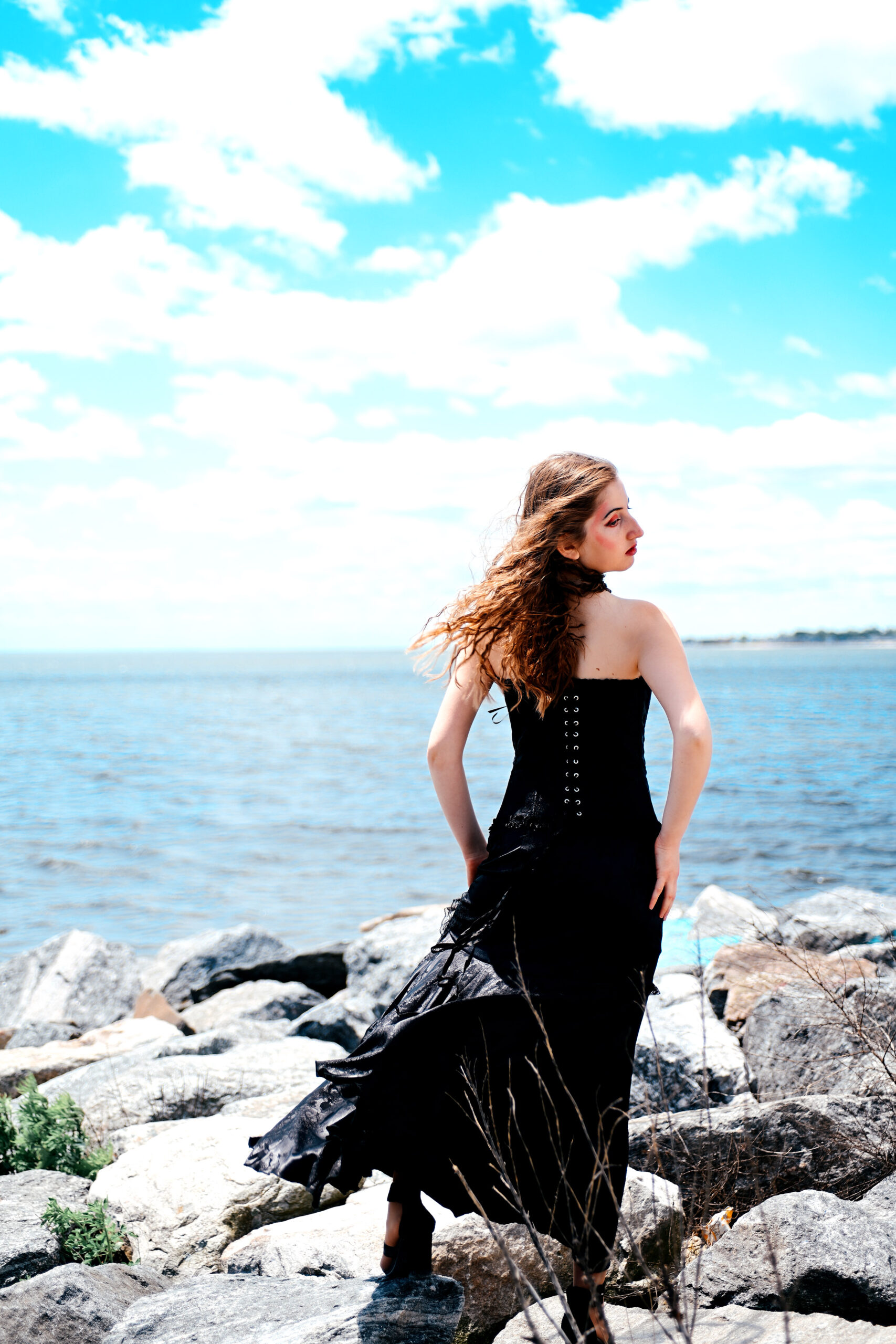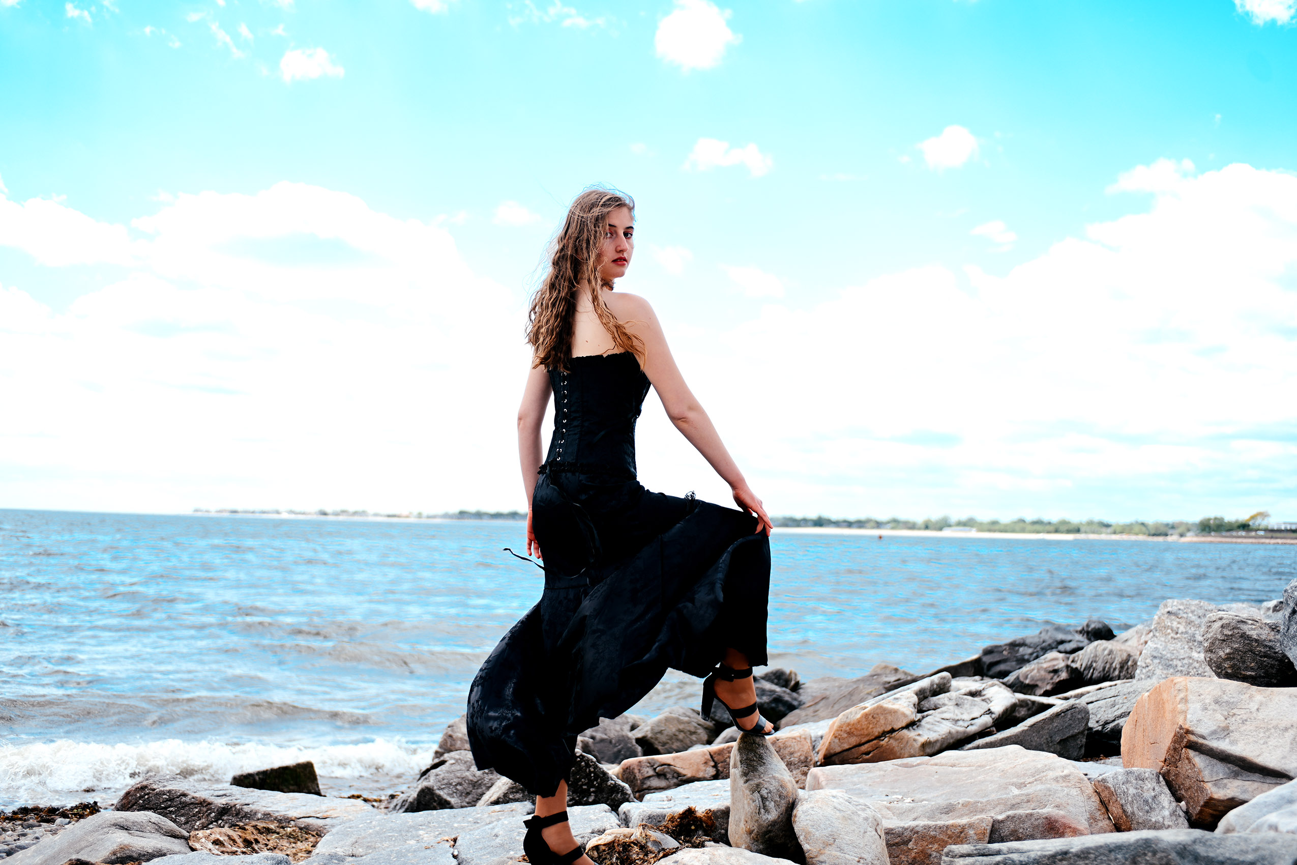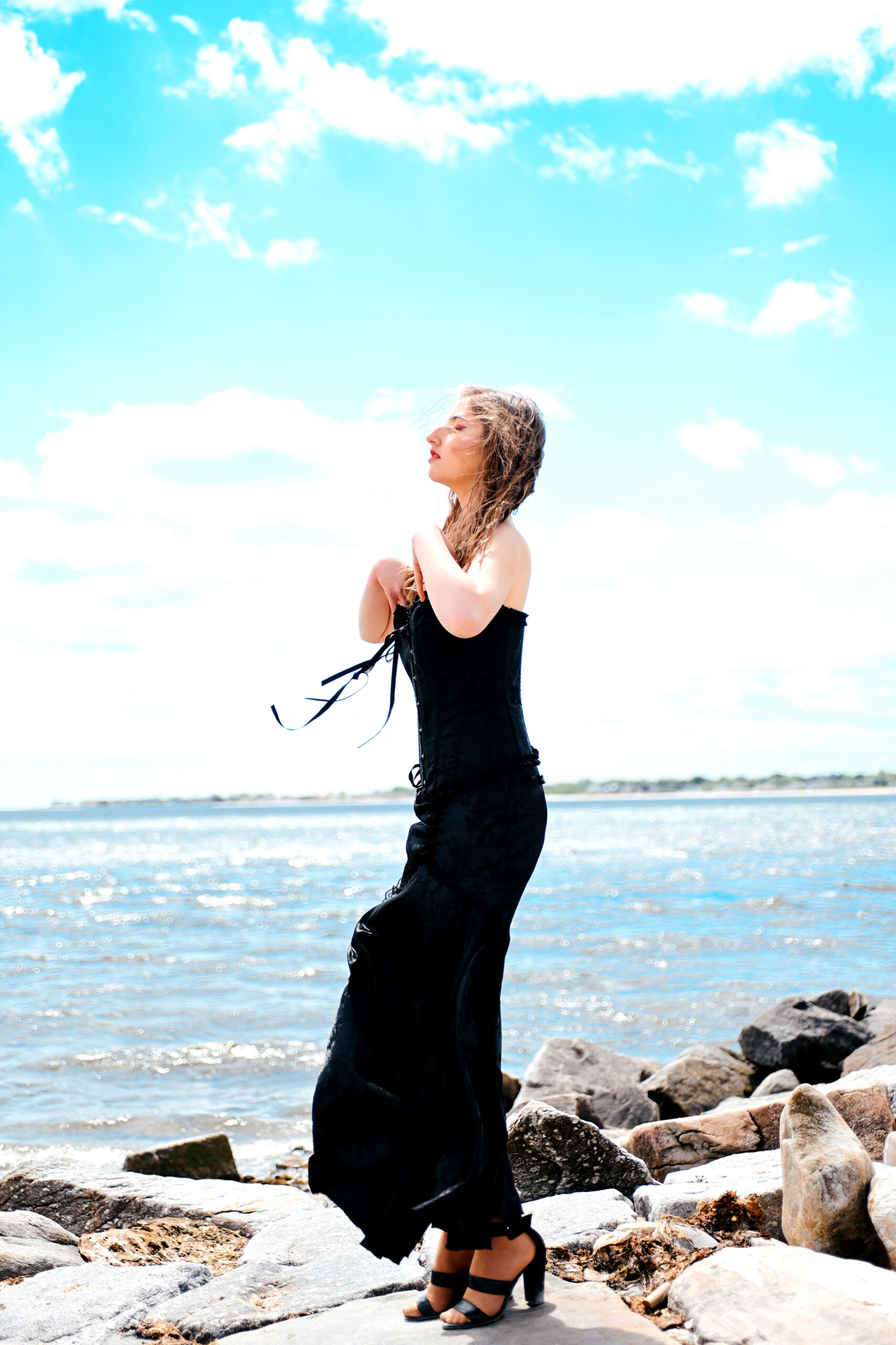 Fashion model Anna Heqimi cuts a darker silhouette in a dress from Kultuur during filming of a promotional video for “Siren: Echoes of the Deep,” a fashion show to be presented by Chasity Aniece Productions in the Bond Ballroom in Hartford on July 27.