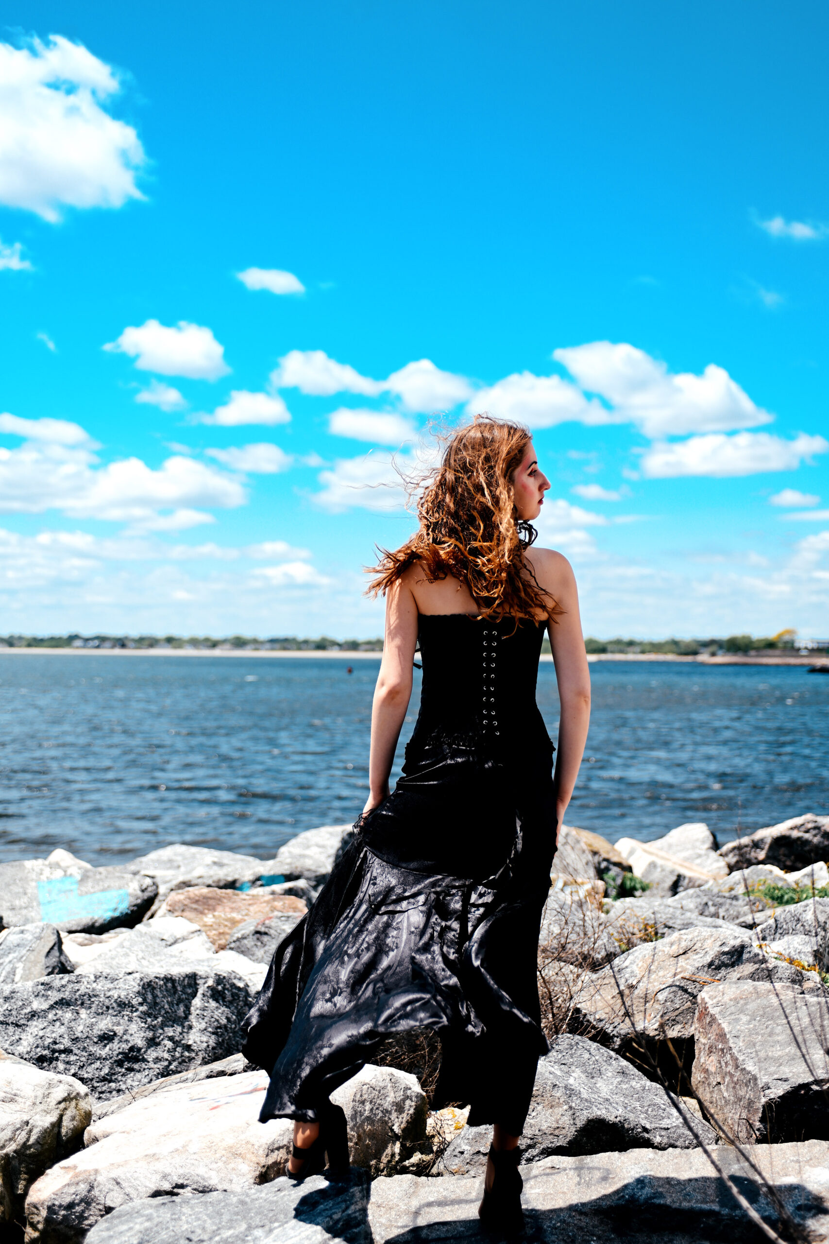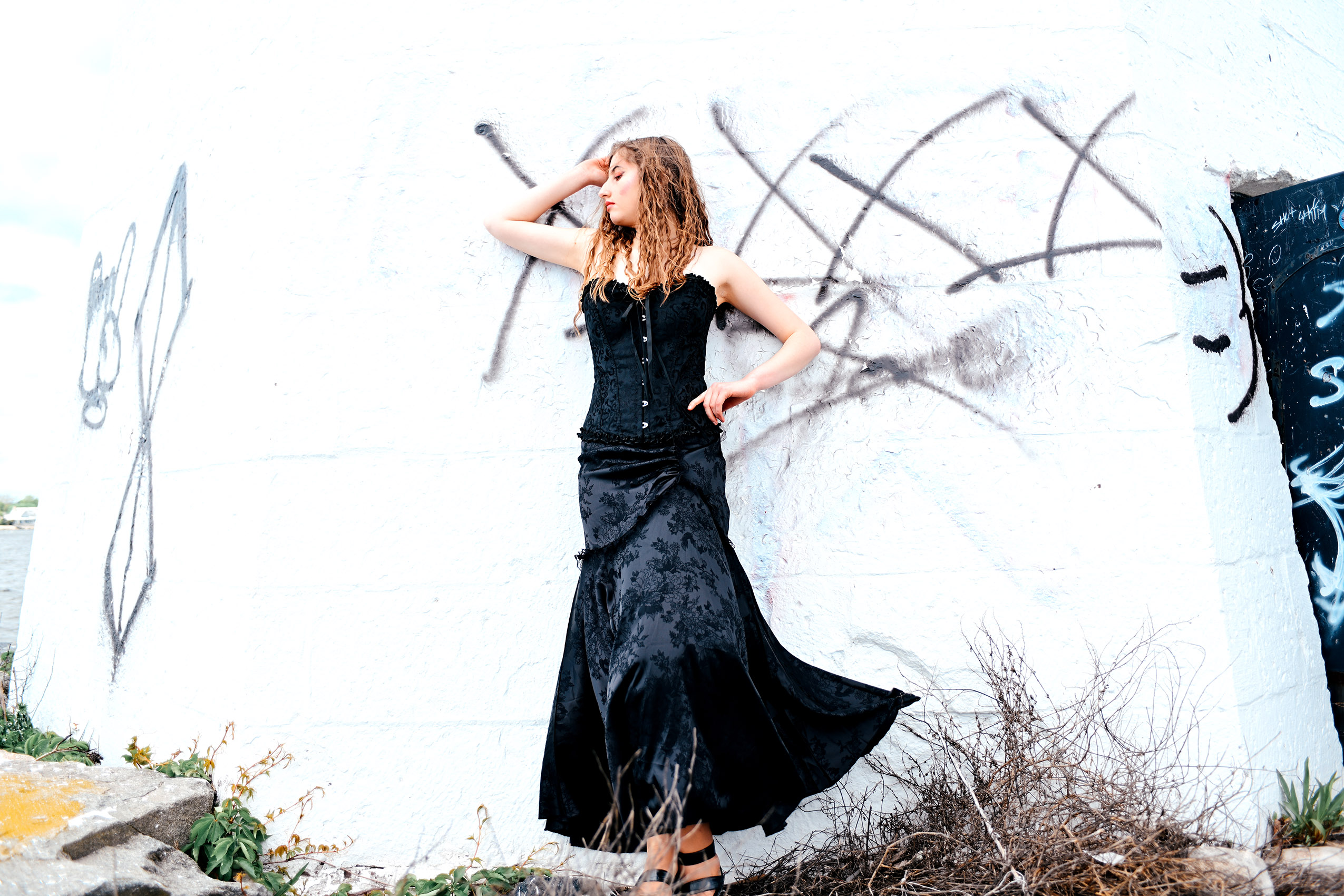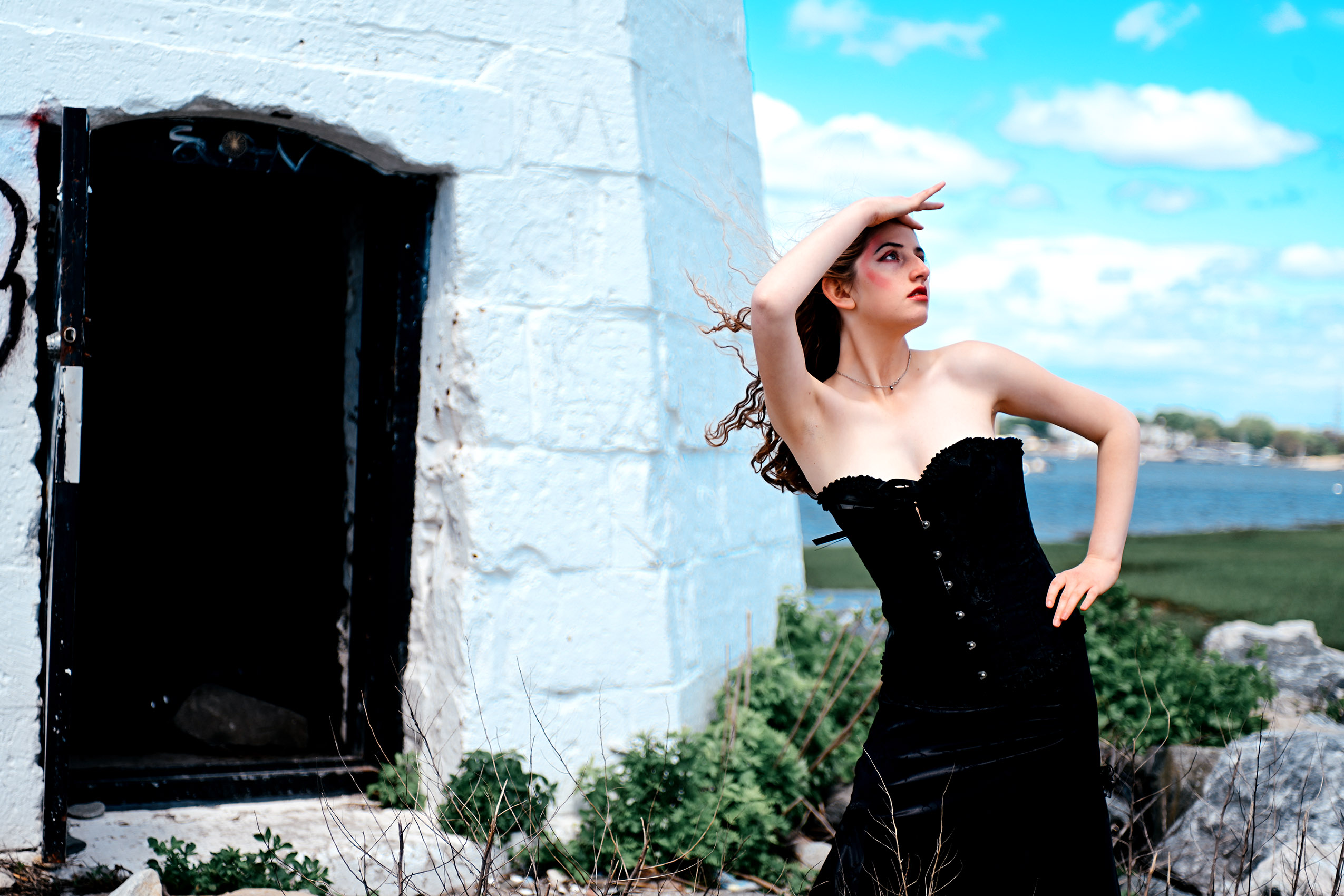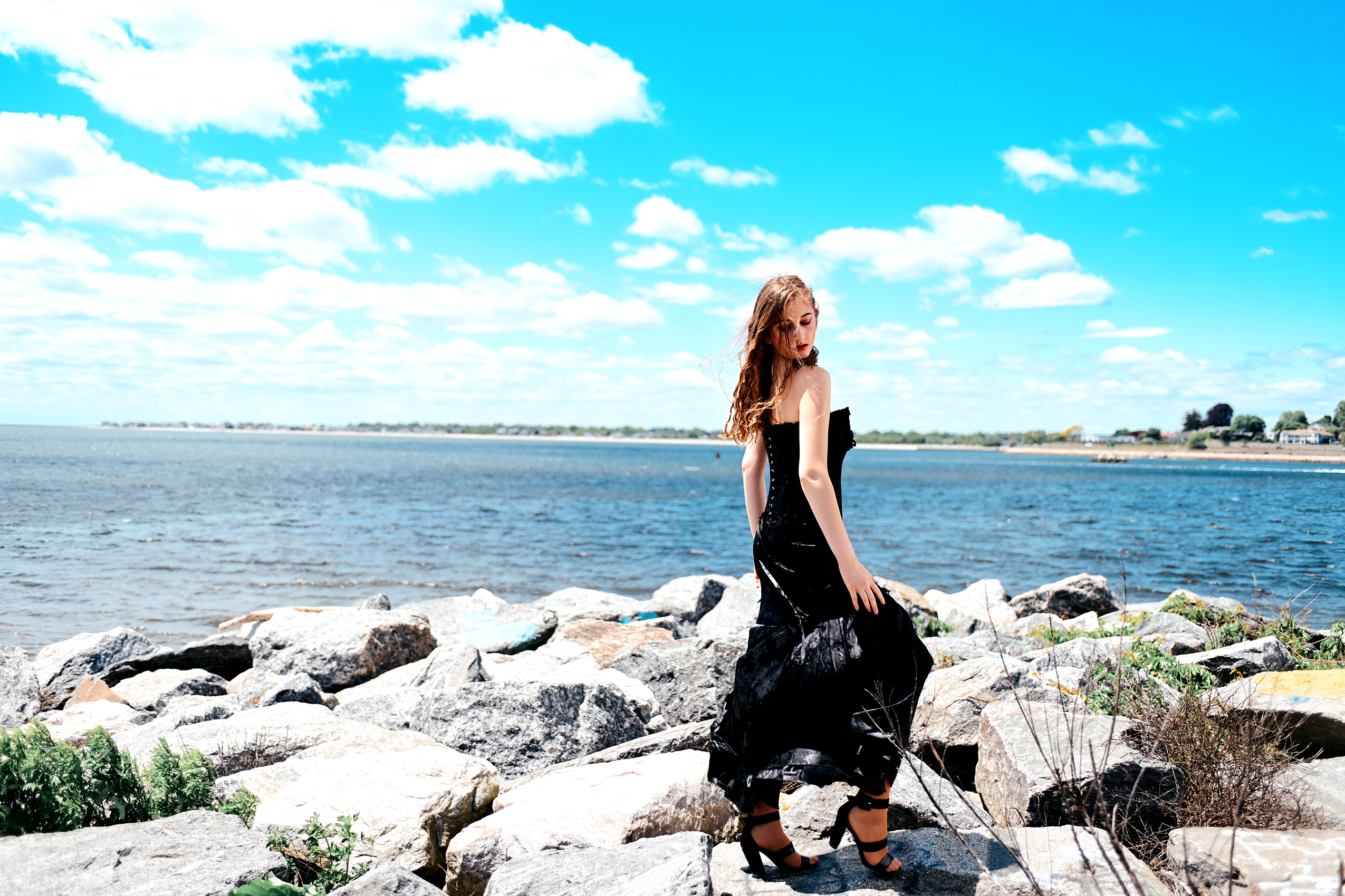 Fashion model Anna Heqimi cuts a darker silhouette in a dress from Kultuur during filming of a promotional video for “Siren: Echoes of the Deep,” a fashion show to be presented by Chasity Aniece Productions in the Bond Ballroom in Hartford on July 27.