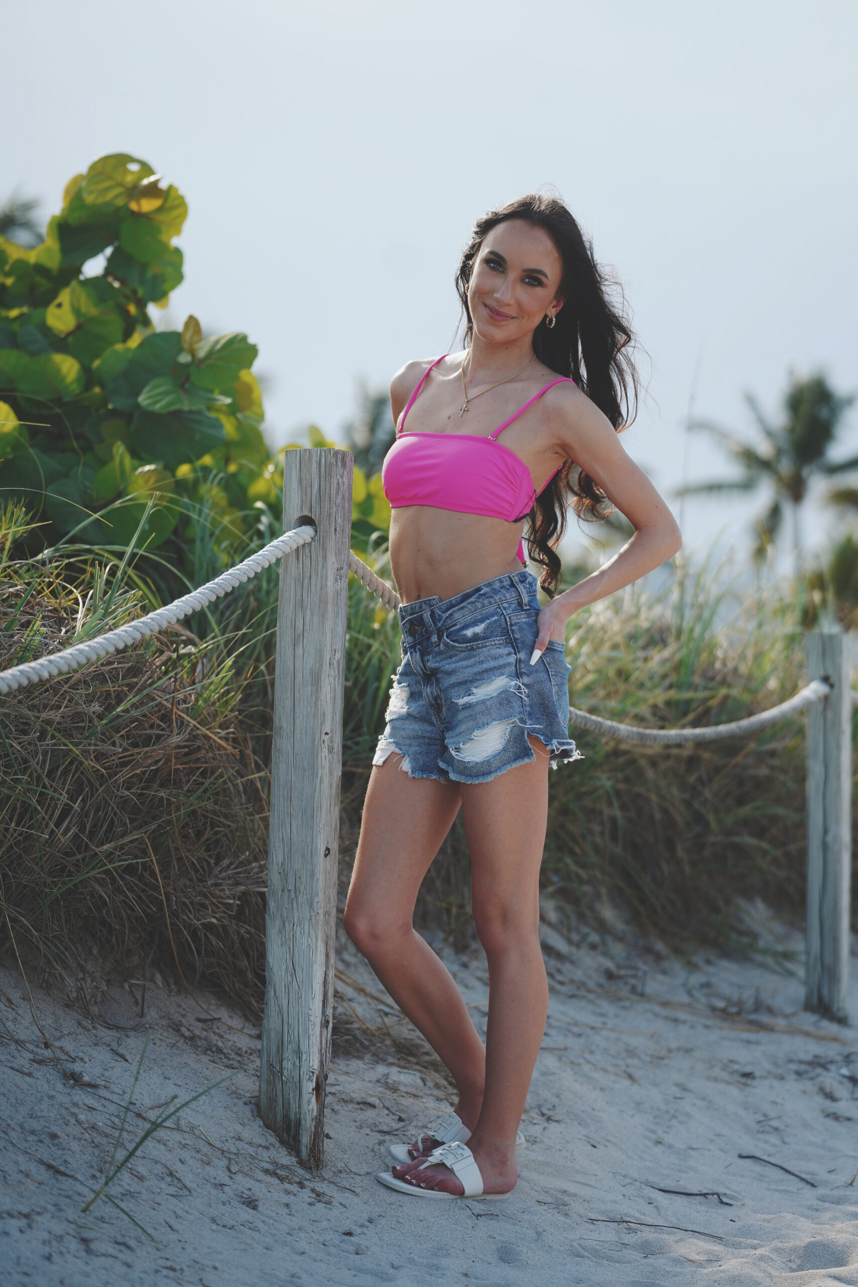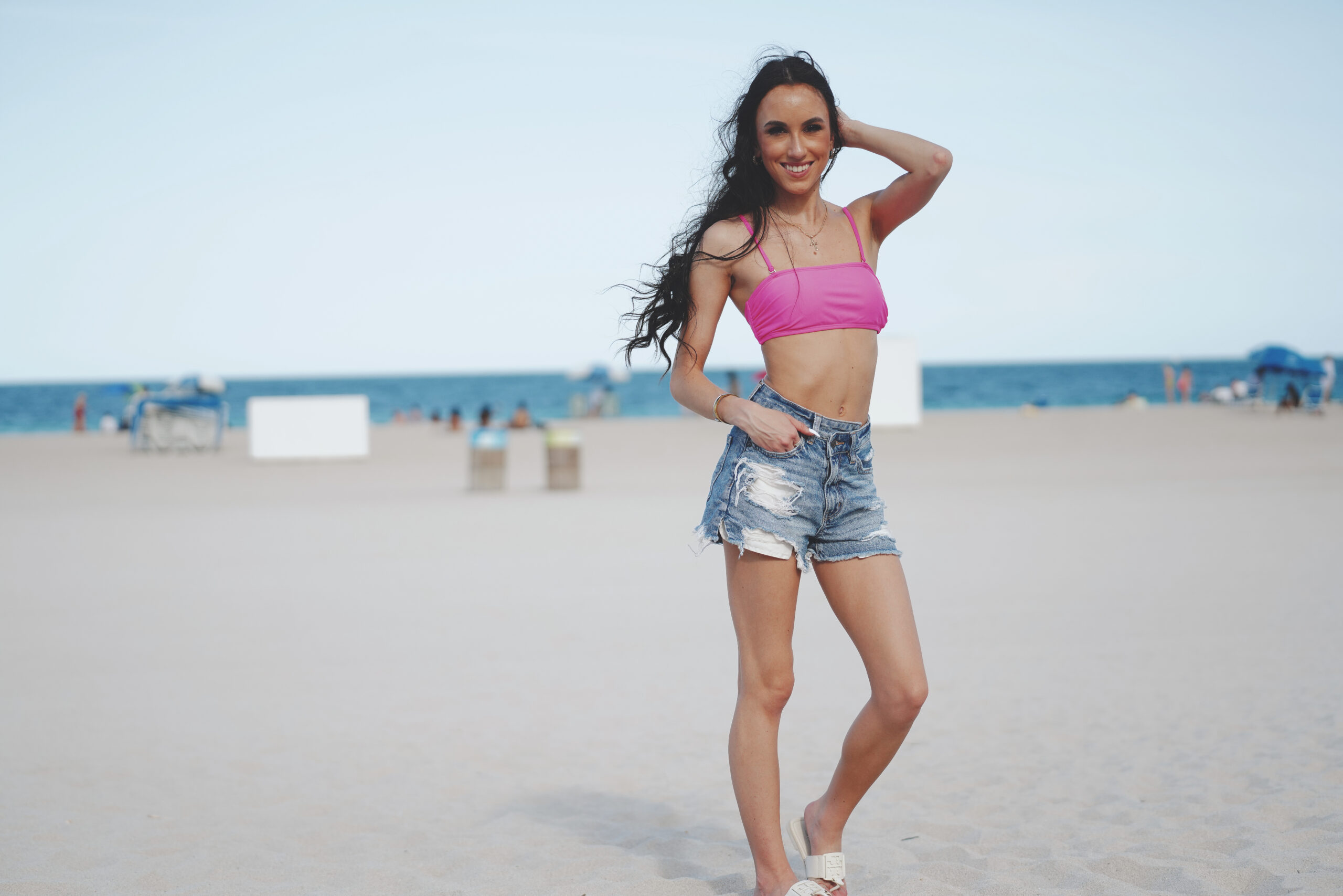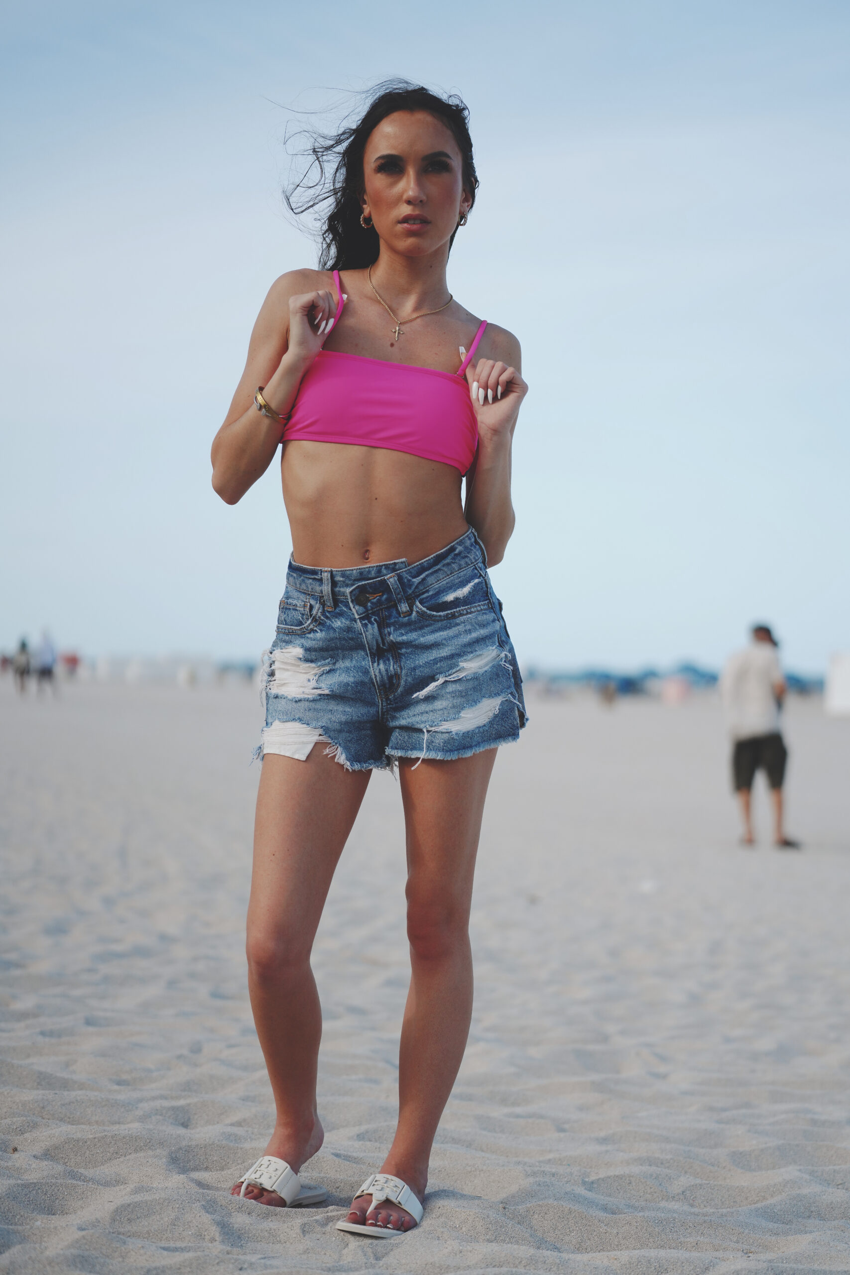Katie is seen a stone’s throw from Ocean Drive on South Beach in Miami Beach during Miami Swim Week.
