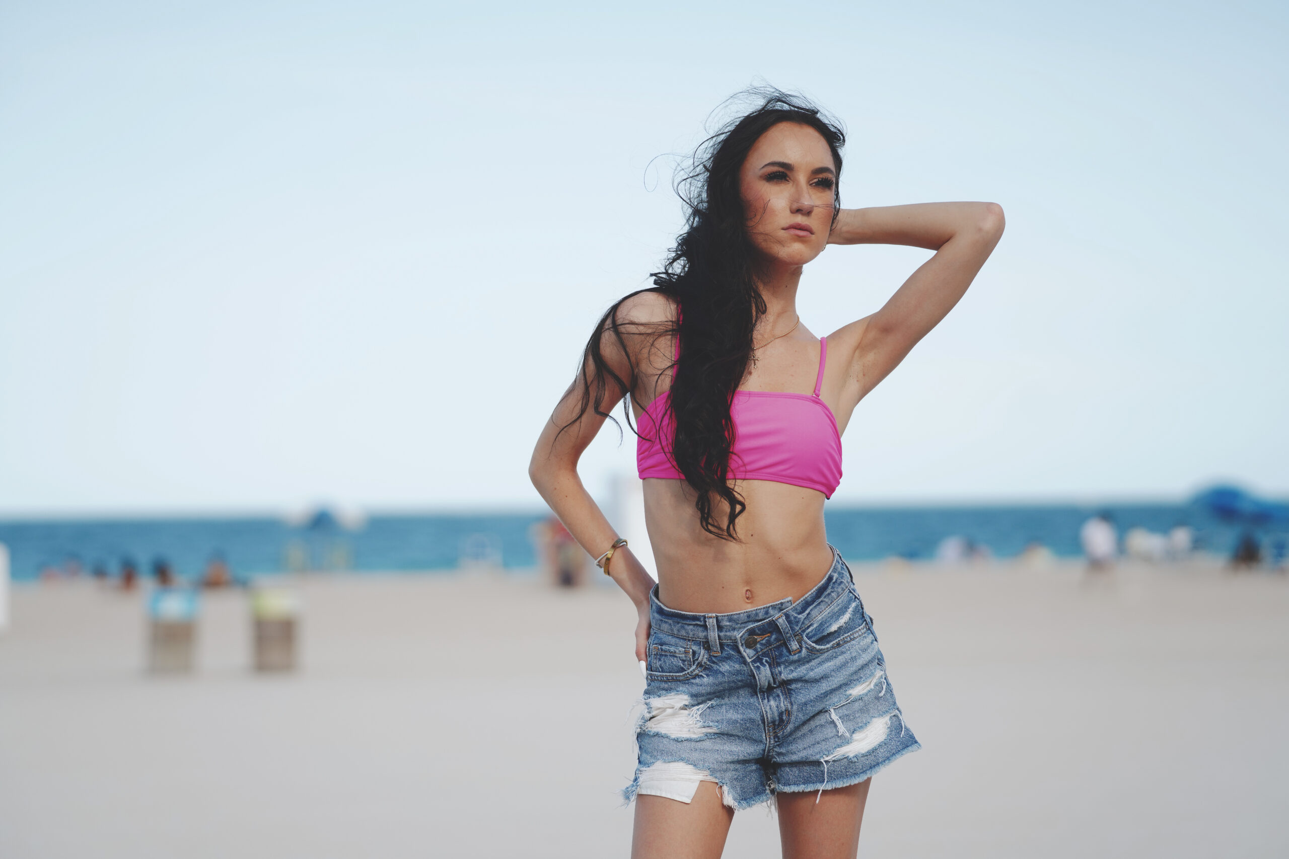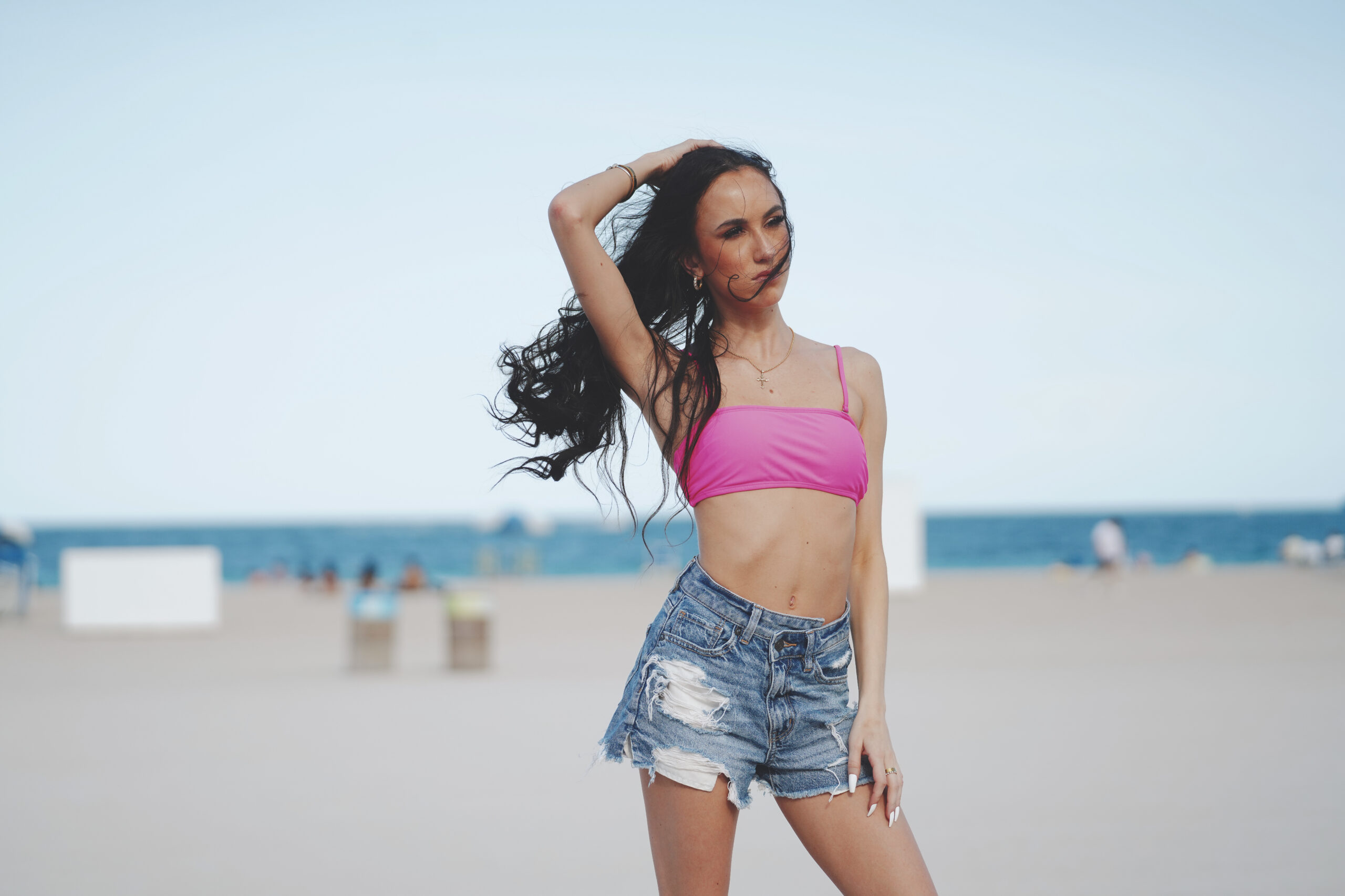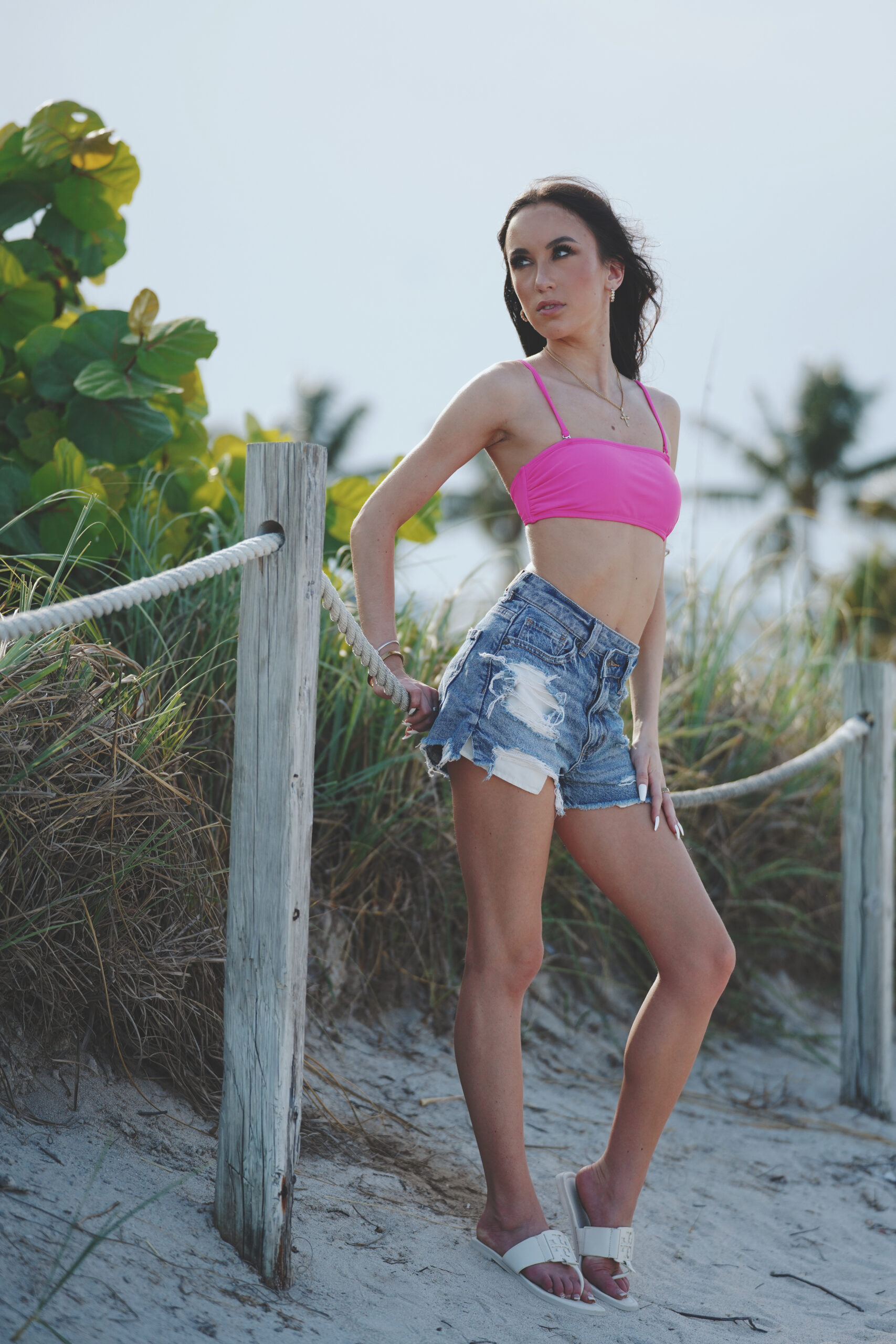 Katie is seen a stone’s throw from Ocean Drive on South Beach in Miami Beach during Miami Swim Week.