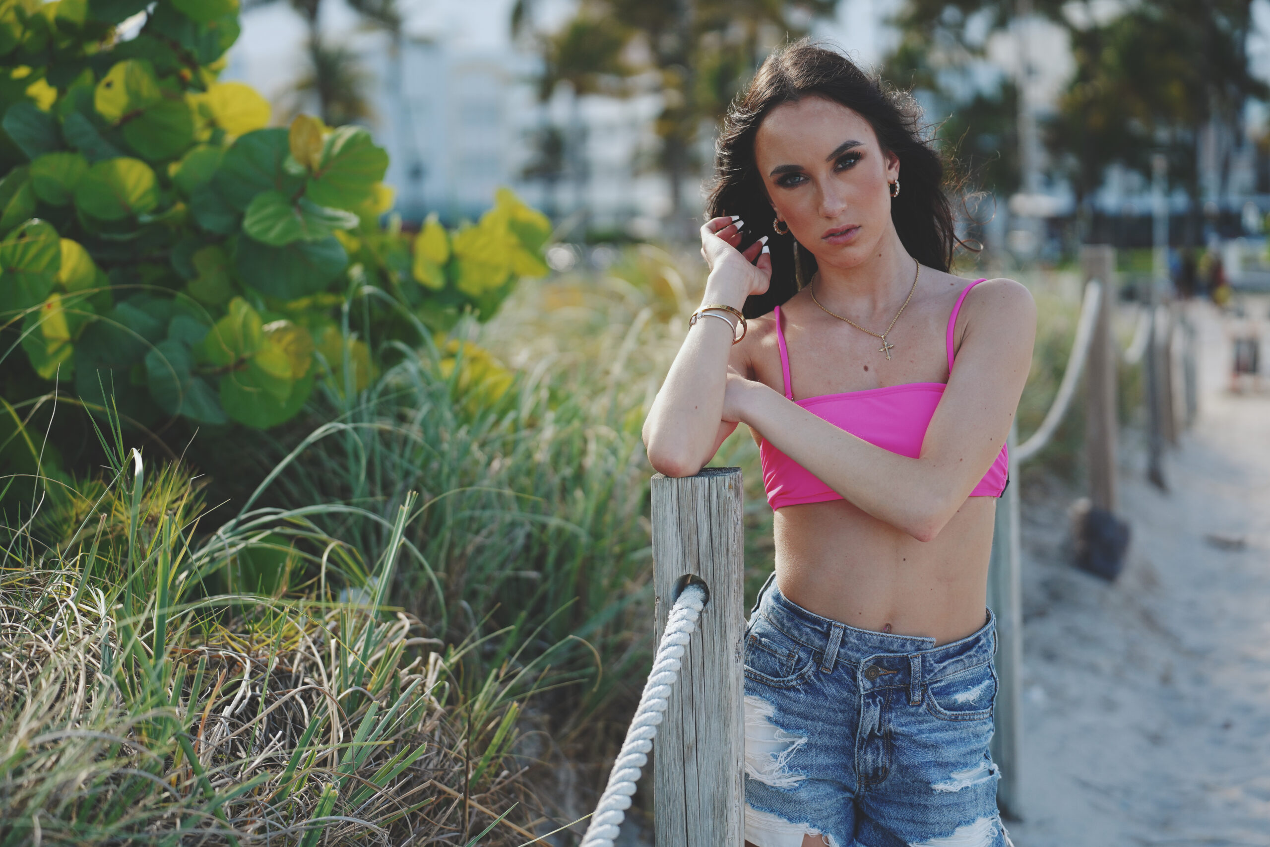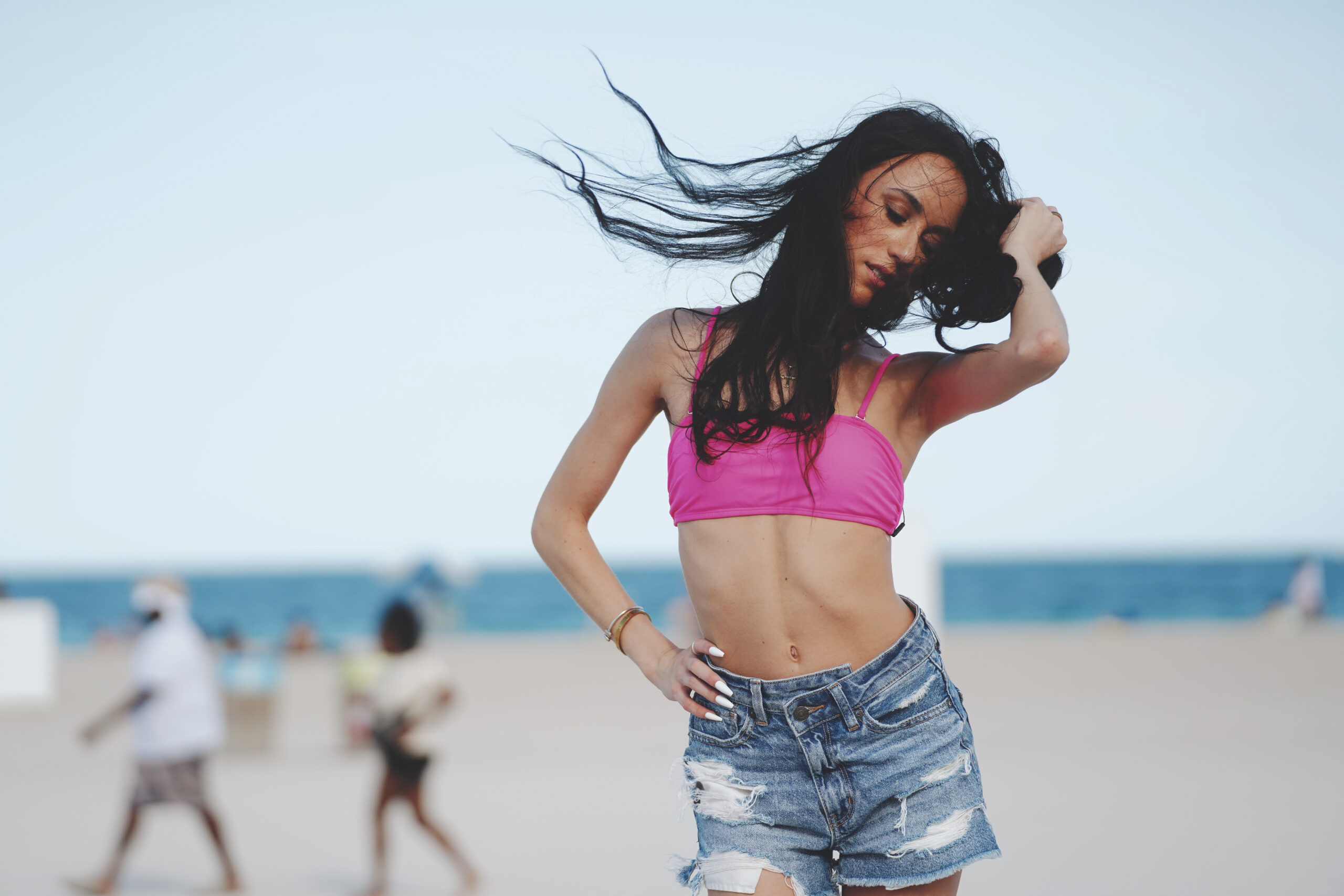 Katie is seen a stone’s throw from Ocean Drive on South Beach in Miami Beach during Miami Swim Week.