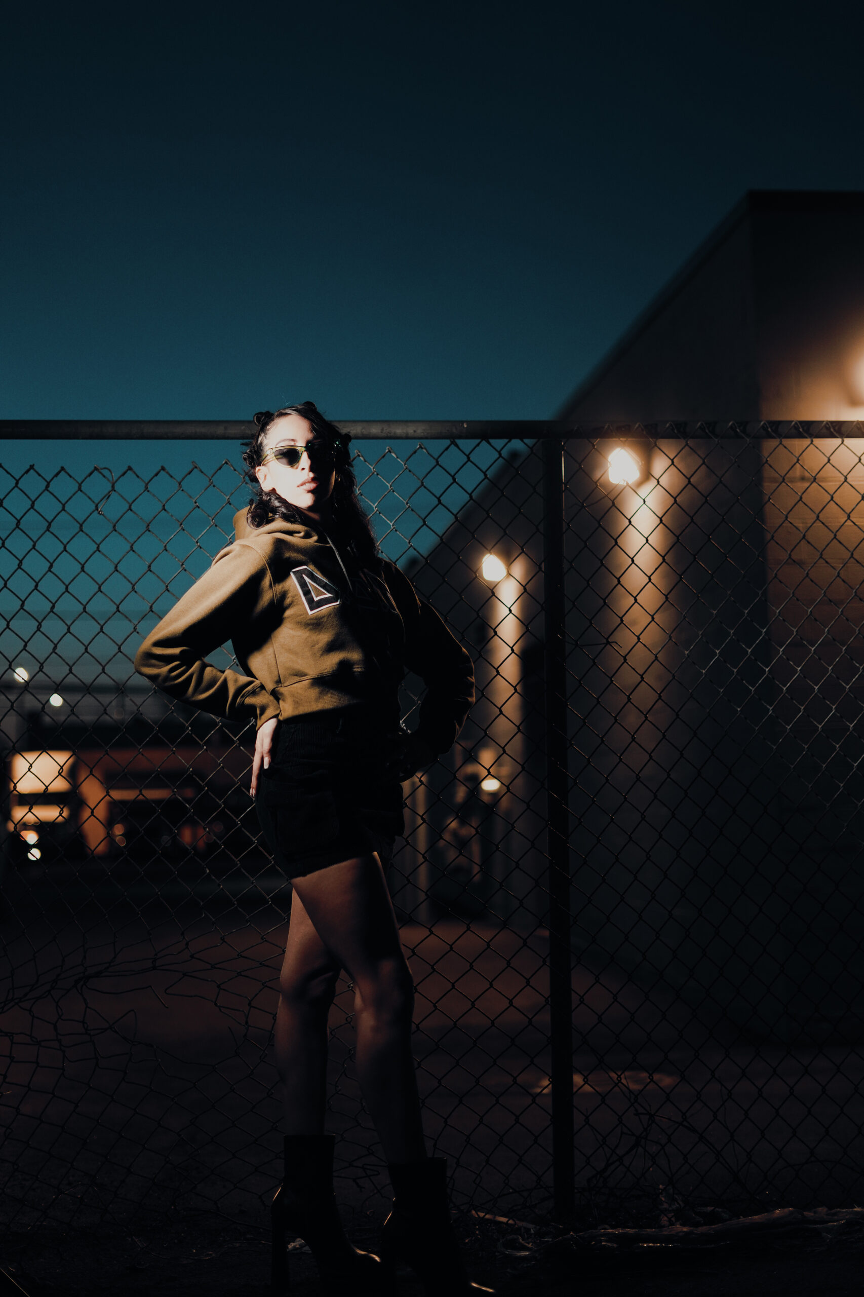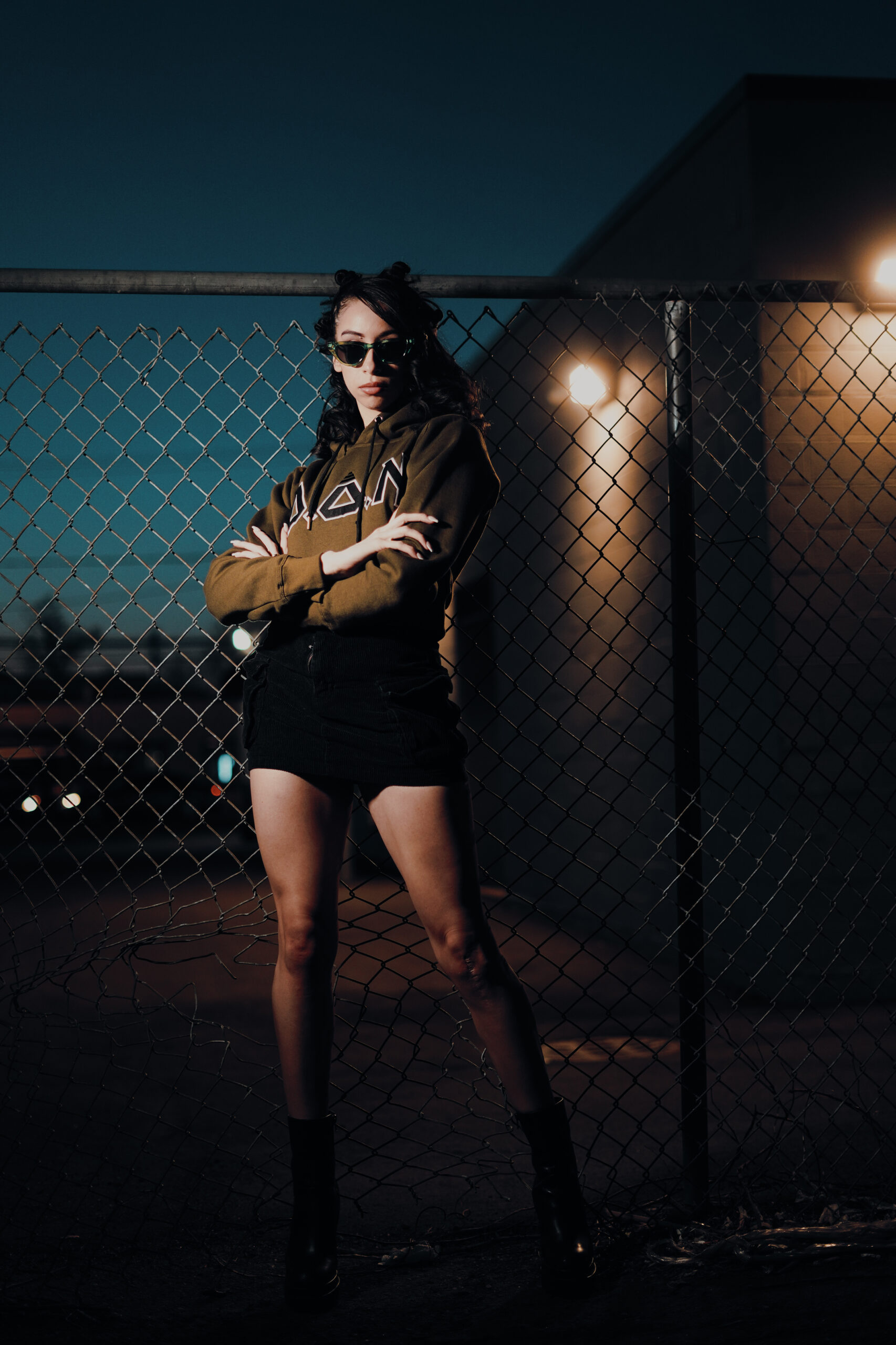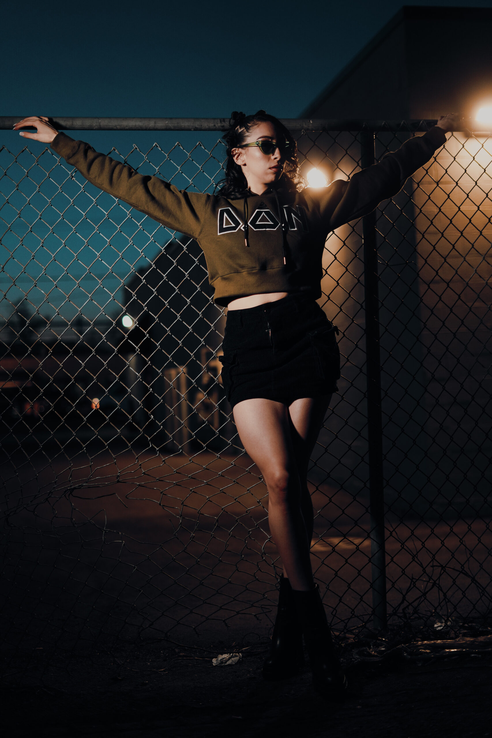 Model Lex Marie Dones moves to the beat of her own rhythm in the warmth of a spring evening while wearing Double of Nothing Apparel (https://doubleornothing20.com/).